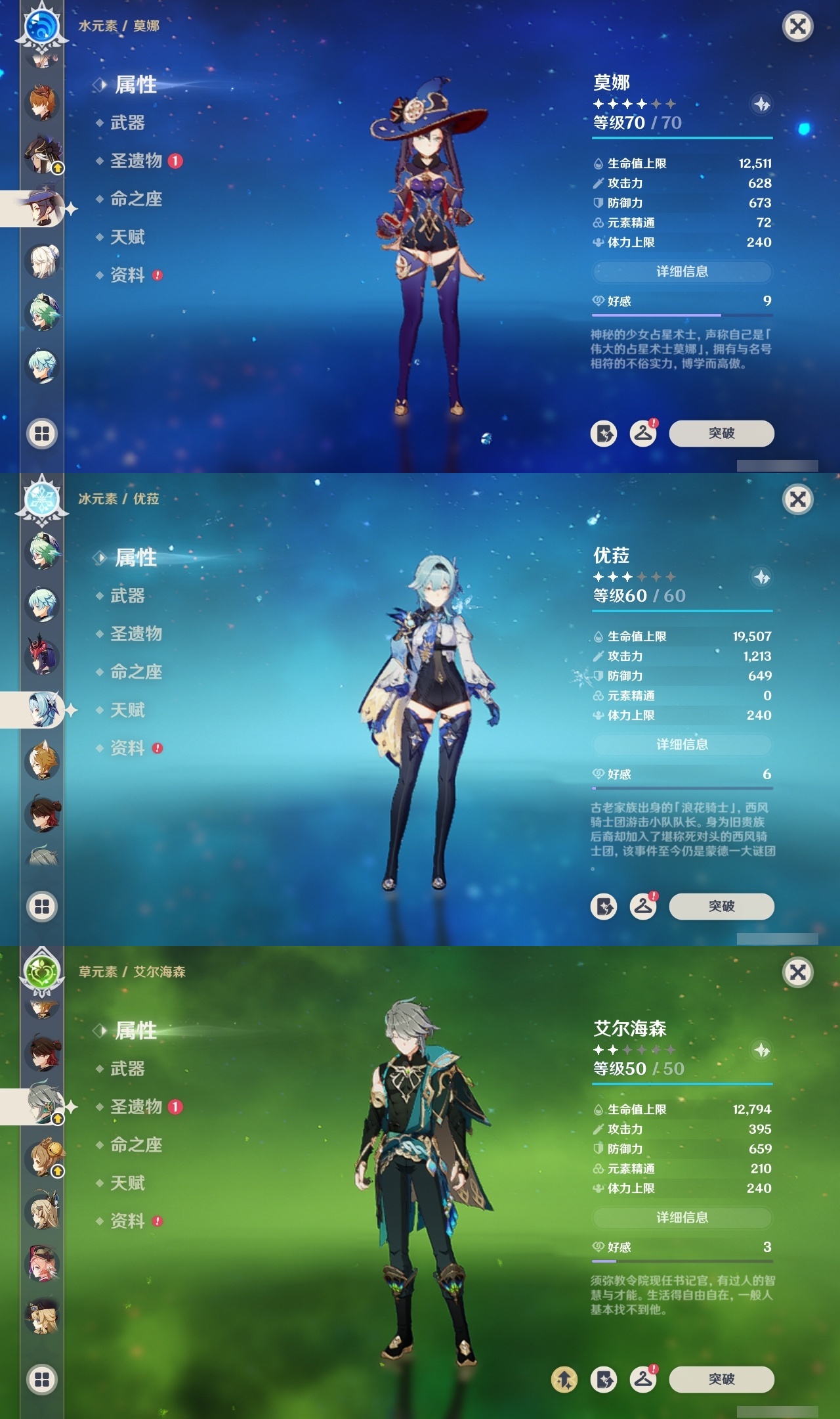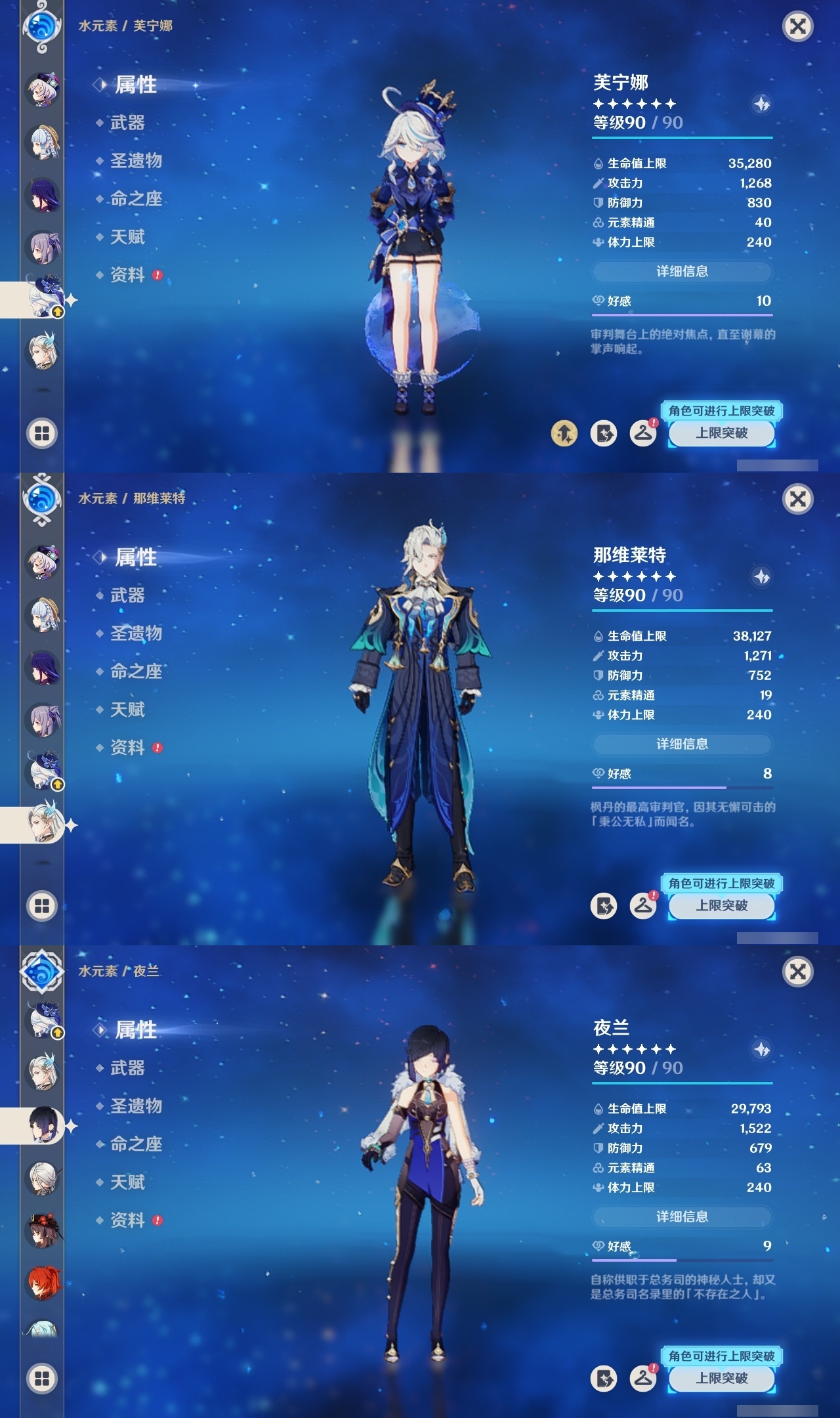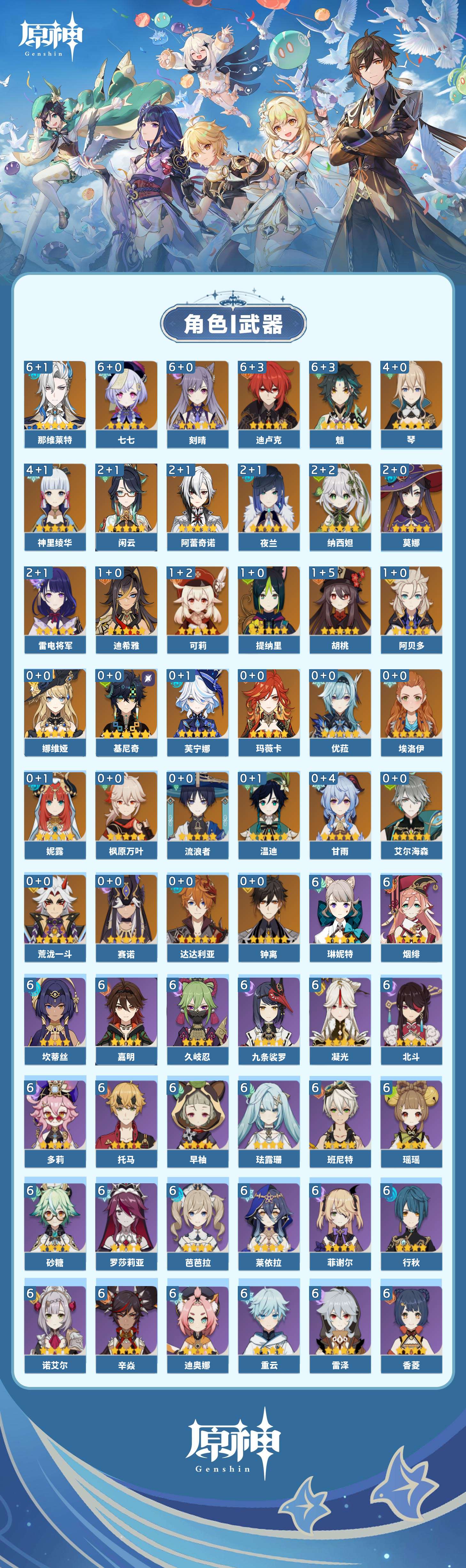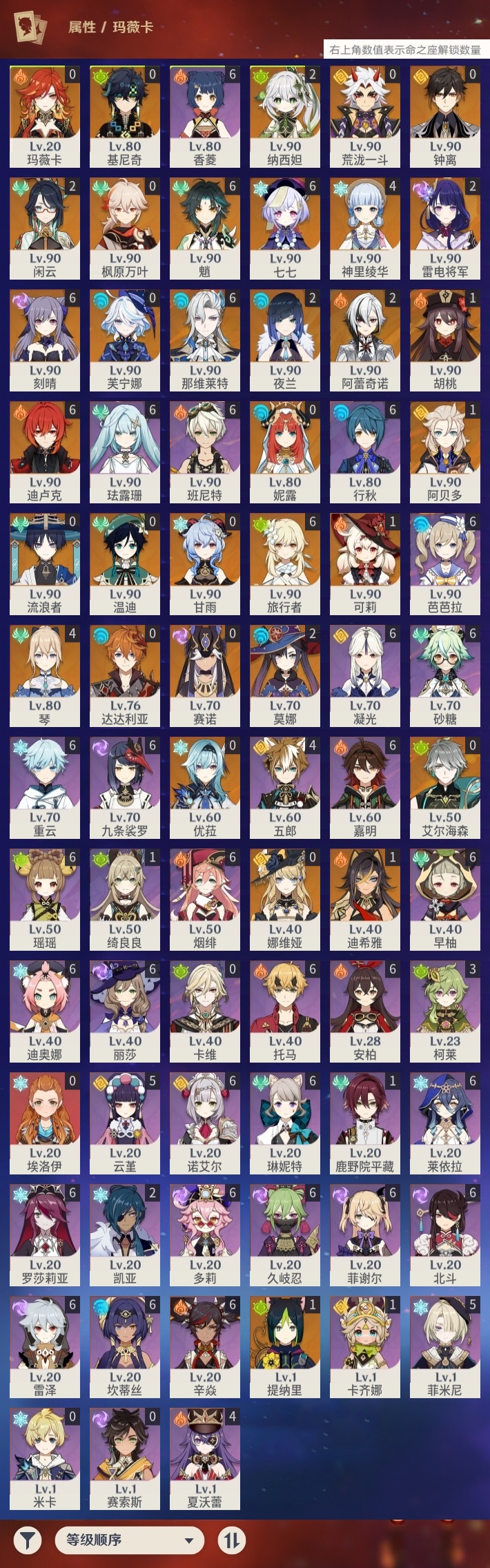 【原神】满命,冒险等级:59,五星数量:55,五星角色:那维莱特 6命迪卢克 6命魈 6命刻晴 6命七七 6命琴 4命神里绫华 4命闲云 2命阿蕾奇诺 2命雷电将军 2命莫娜 2命夜兰 2命纳西妲 2命迪希雅 1命胡桃 1命可莉 1命阿贝多 1命提纳里 1命基尼奇温迪玛薇卡优菈钟离荒泷一斗达达利亚芙宁娜娜维娅赛诺妮露艾尔海森流浪者枫原万叶甘雨__五星武器:护摩之杖 5精阿莫斯之弓 4精和璞鸢 3精狼的末路 3精天空之刃 3精四风原典 2精天空之翼 2精千夜浮梦 2精最初的大魔术万世流涌大典静水流涌之辉鹤鸣余音赤月之形风鹰剑天空之傲天空之脊雾切之回光薙草之稻光终末嗟叹之诗若水圣显之钥__四星角色:班尼特 6命行秋 6命九条裟罗 6命香菱 6命久岐忍 6命珐露珊 6命凝光 6命迪奥娜 6命砂糖 6命瑶瑶 6命莱依拉 6命坎蒂丝 6命多莉 6命芭芭拉 6命早柚 6命托马 6命烟绯 6命重云 6命辛焱 6命诺艾尔 6命罗莎莉亚 6命雷泽 6命菲谢尔 6命北斗 6命琳妮特 6命嘉明 6命云堇 5命菲米尼 5命五郎 4命夏沃蕾 4命柯莱 3命卡齐娜 1命鹿野院平藏 1命绮良良 1命埃洛伊米卡卡维赛索斯