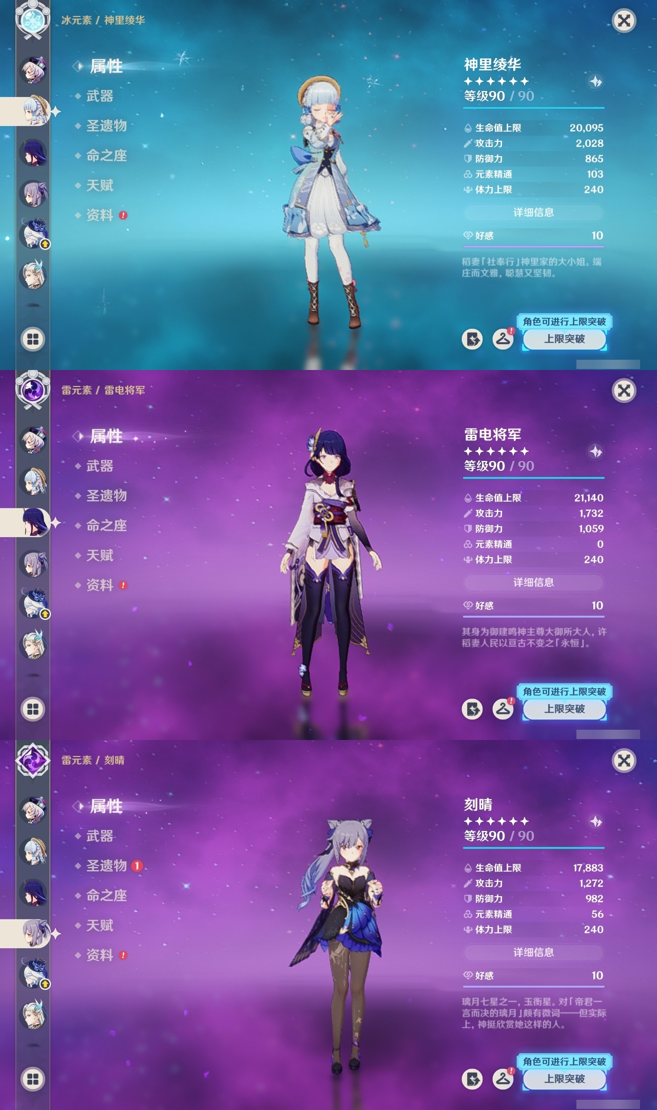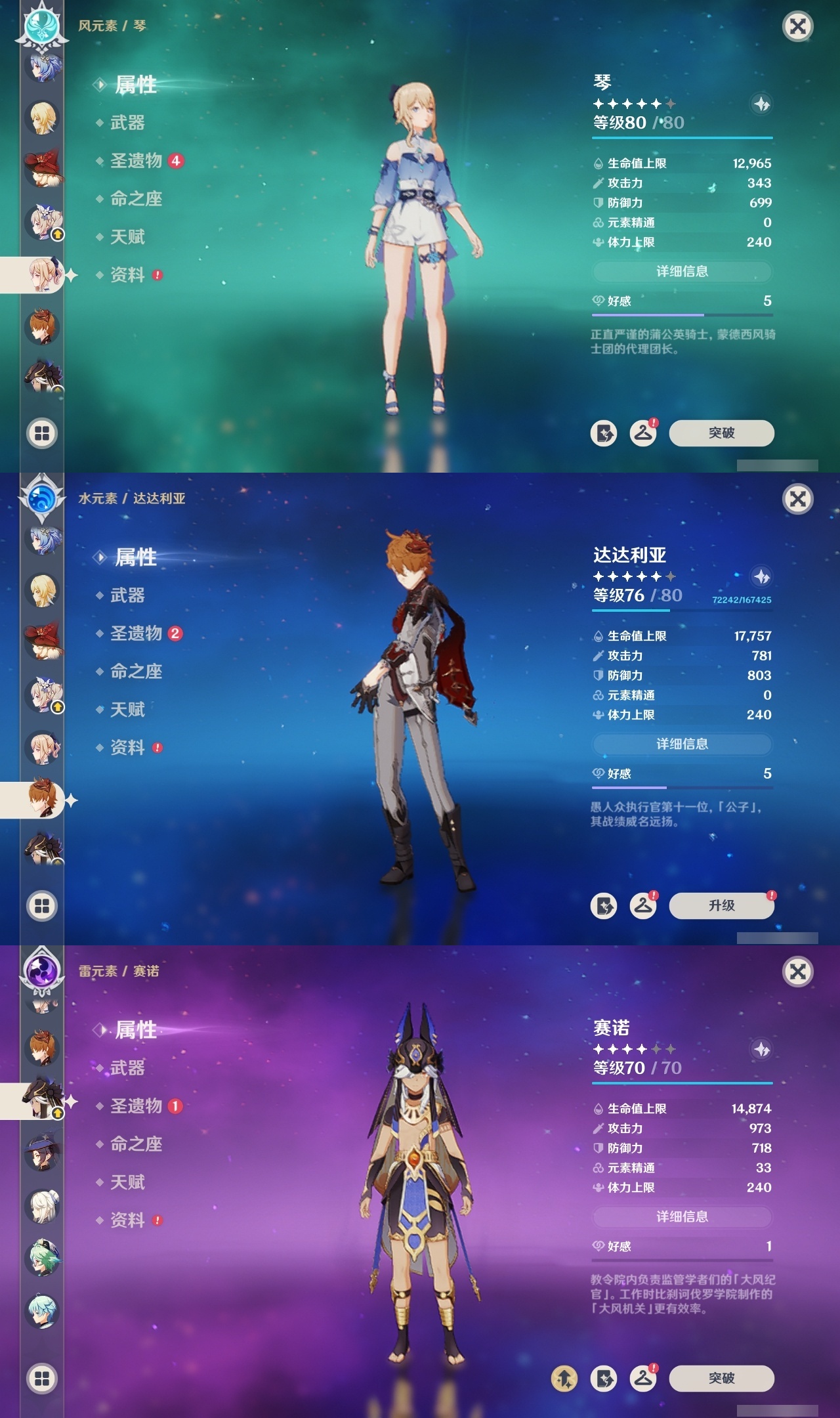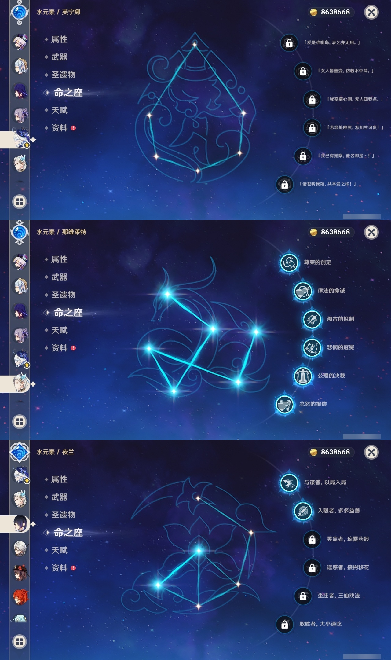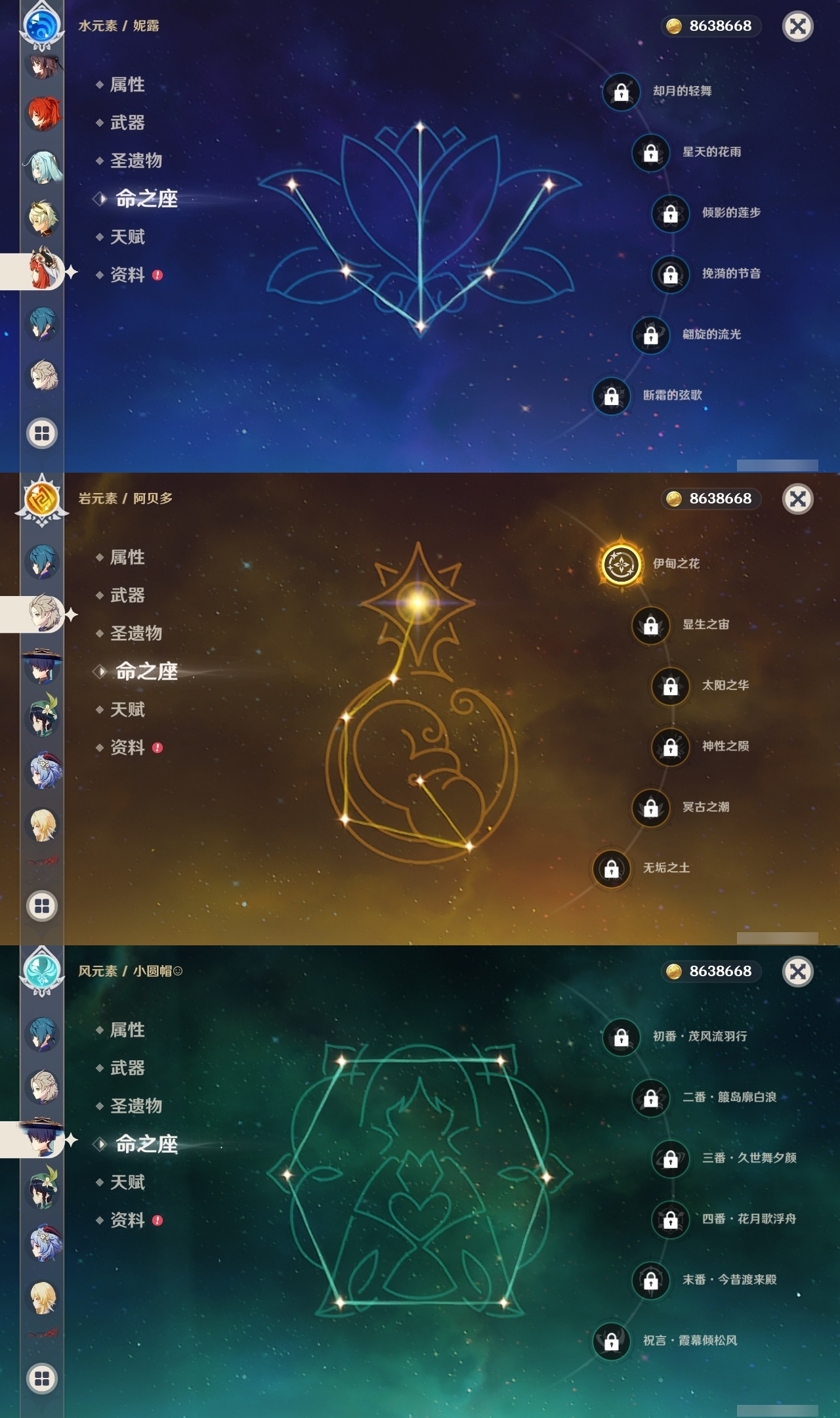 【原神】满命,冒险等级:59,五星数量:55,五星角色:那维莱特 6命迪卢克 6命魈 6命刻晴 6命七七 6命琴 4命神里绫华 4命闲云 2命阿蕾奇诺 2命雷电将军 2命莫娜 2命夜兰 2命纳西妲 2命迪希雅 1命胡桃 1命可莉 1命阿贝多 1命提纳里 1命基尼奇温迪玛薇卡优菈钟离荒泷一斗达达利亚芙宁娜娜维娅赛诺妮露艾尔海森流浪者枫原万叶甘雨__五星武器:护摩之杖 5精阿莫斯之弓 4精和璞鸢 3精狼的末路 3精天空之刃 3精四风原典 2精天空之翼 2精千夜浮梦 2精最初的大魔术万世流涌大典静水流涌之辉鹤鸣余音赤月之形风鹰剑天空之傲天空之脊雾切之回光薙草之稻光终末嗟叹之诗若水圣显之钥__四星角色:班尼特 6命行秋 6命九条裟罗 6命香菱 6命久岐忍 6命珐露珊 6命凝光 6命迪奥娜 6命砂糖 6命瑶瑶 6命莱依拉 6命坎蒂丝 6命多莉 6命芭芭拉 6命早柚 6命托马 6命烟绯 6命重云 6命辛焱 6命诺艾尔 6命罗莎莉亚 6命雷泽 6命菲谢尔 6命北斗 6命琳妮特 6命嘉明 6命云堇 5命菲米尼 5命五郎 4命夏沃蕾 4命柯莱 3命卡齐娜 1命鹿野院平藏 1命绮良良 1命埃洛伊米卡卡维赛索斯