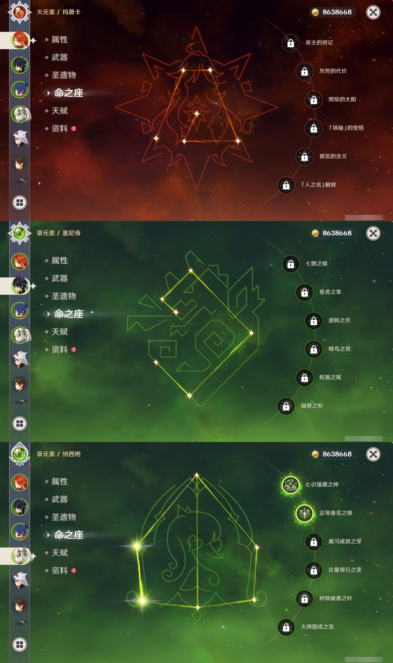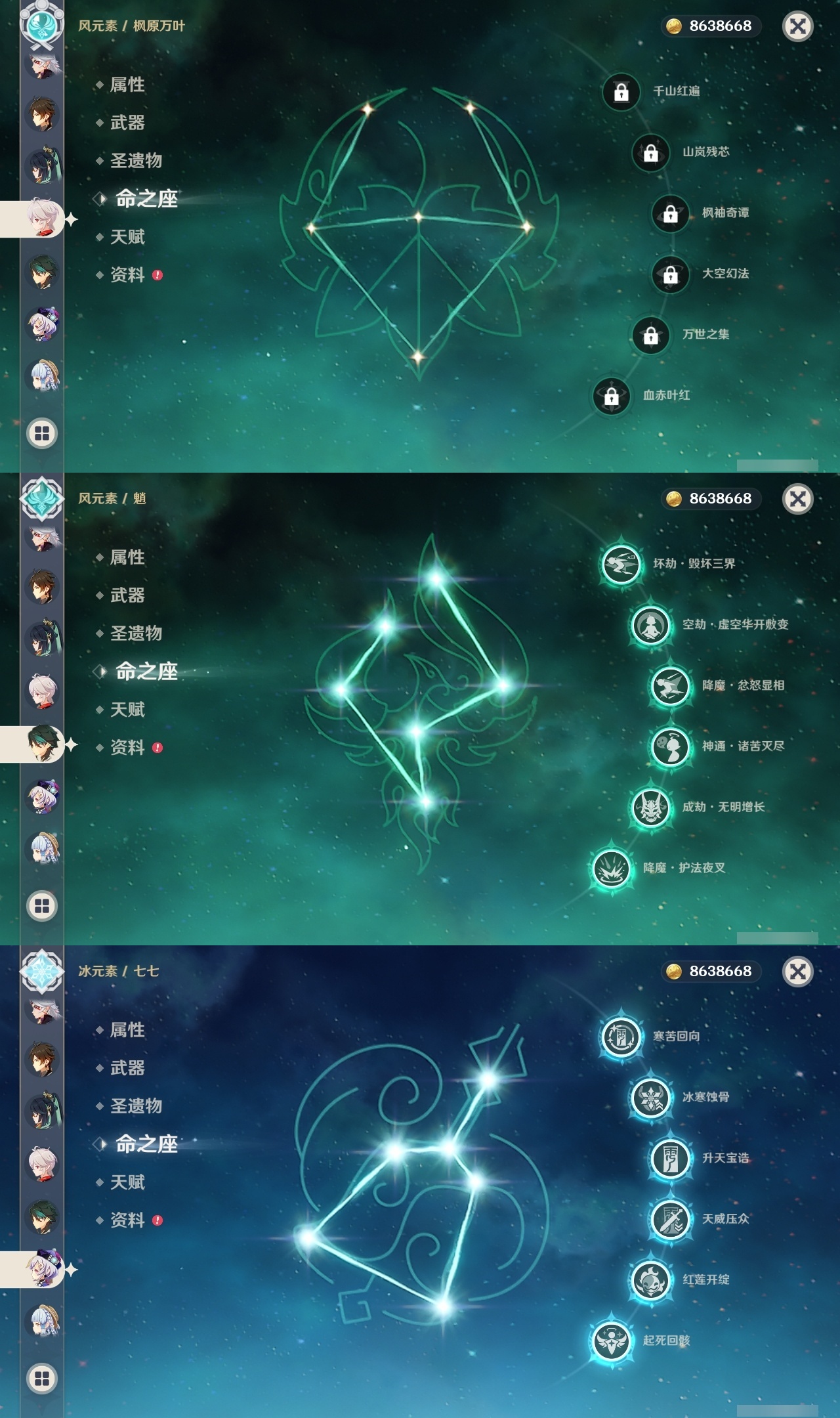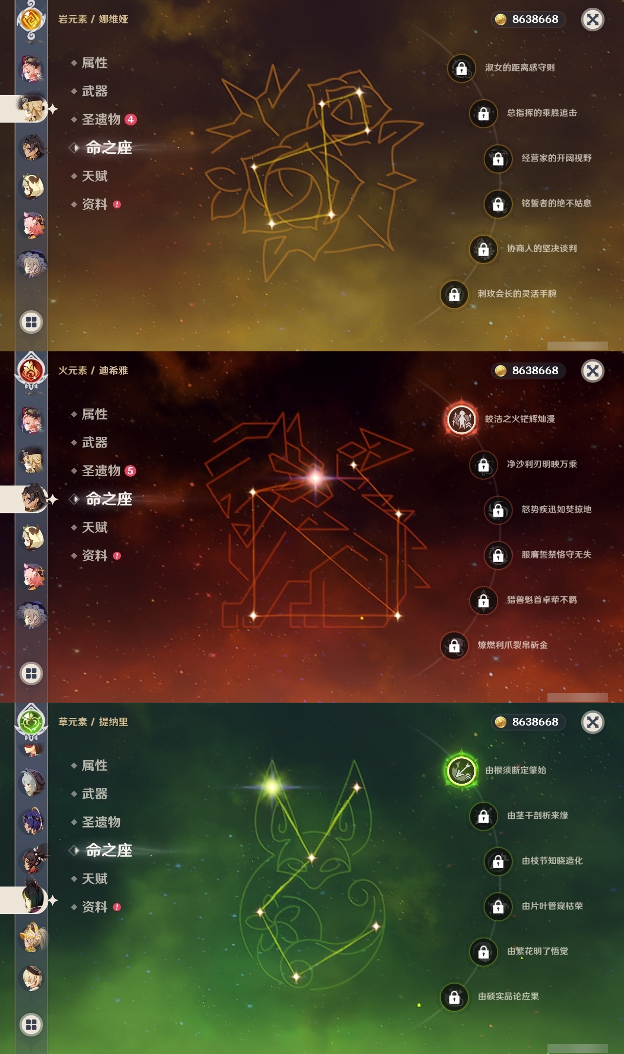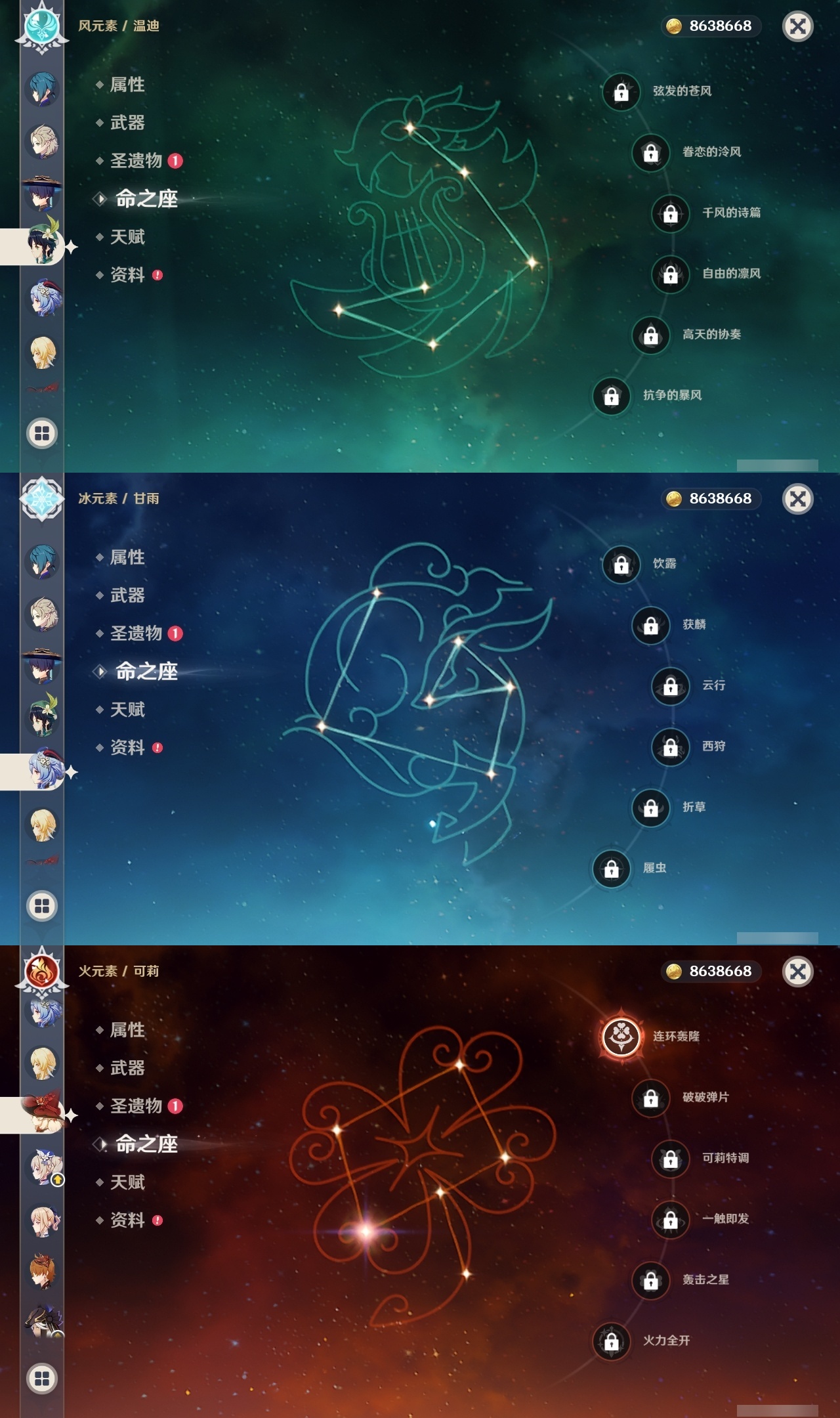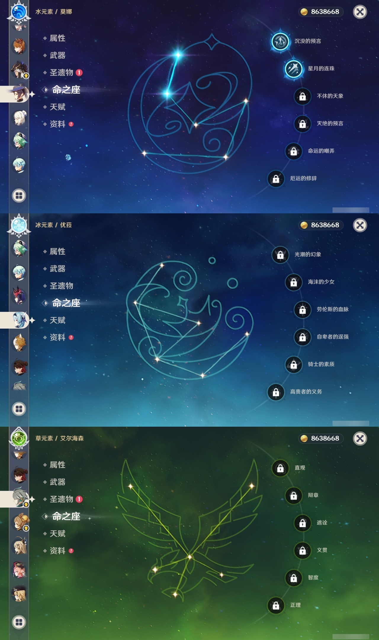 【原神】满命,冒险等级:59,五星数量:55,五星角色:那维莱特 6命迪卢克 6命魈 6命刻晴 6命七七 6命琴 4命神里绫华 4命闲云 2命阿蕾奇诺 2命雷电将军 2命莫娜 2命夜兰 2命纳西妲 2命迪希雅 1命胡桃 1命可莉 1命阿贝多 1命提纳里 1命基尼奇温迪玛薇卡优菈钟离荒泷一斗达达利亚芙宁娜娜维娅赛诺妮露艾尔海森流浪者枫原万叶甘雨__五星武器:护摩之杖 5精阿莫斯之弓 4精和璞鸢 3精狼的末路 3精天空之刃 3精四风原典 2精天空之翼 2精千夜浮梦 2精最初的大魔术万世流涌大典静水流涌之辉鹤鸣余音赤月之形风鹰剑天空之傲天空之脊雾切之回光薙草之稻光终末嗟叹之诗若水圣显之钥__四星角色:班尼特 6命行秋 6命九条裟罗 6命香菱 6命久岐忍 6命珐露珊 6命凝光 6命迪奥娜 6命砂糖 6命瑶瑶 6命莱依拉 6命坎蒂丝 6命多莉 6命芭芭拉 6命早柚 6命托马 6命烟绯 6命重云 6命辛焱 6命诺艾尔 6命罗莎莉亚 6命雷泽 6命菲谢尔 6命北斗 6命琳妮特 6命嘉明 6命云堇 5命菲米尼 5命五郎 4命夏沃蕾 4命柯莱 3命卡齐娜 1命鹿野院平藏 1命绮良良 1命埃洛伊米卡卡维赛索斯