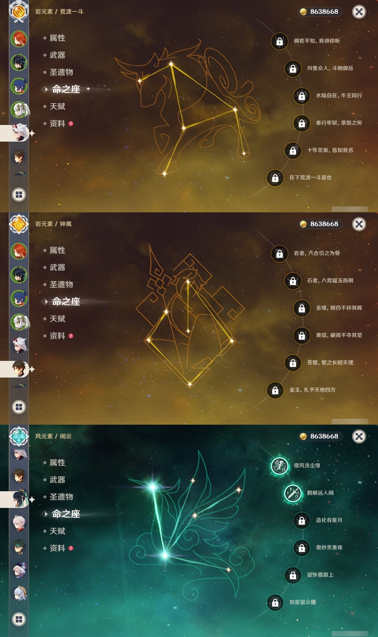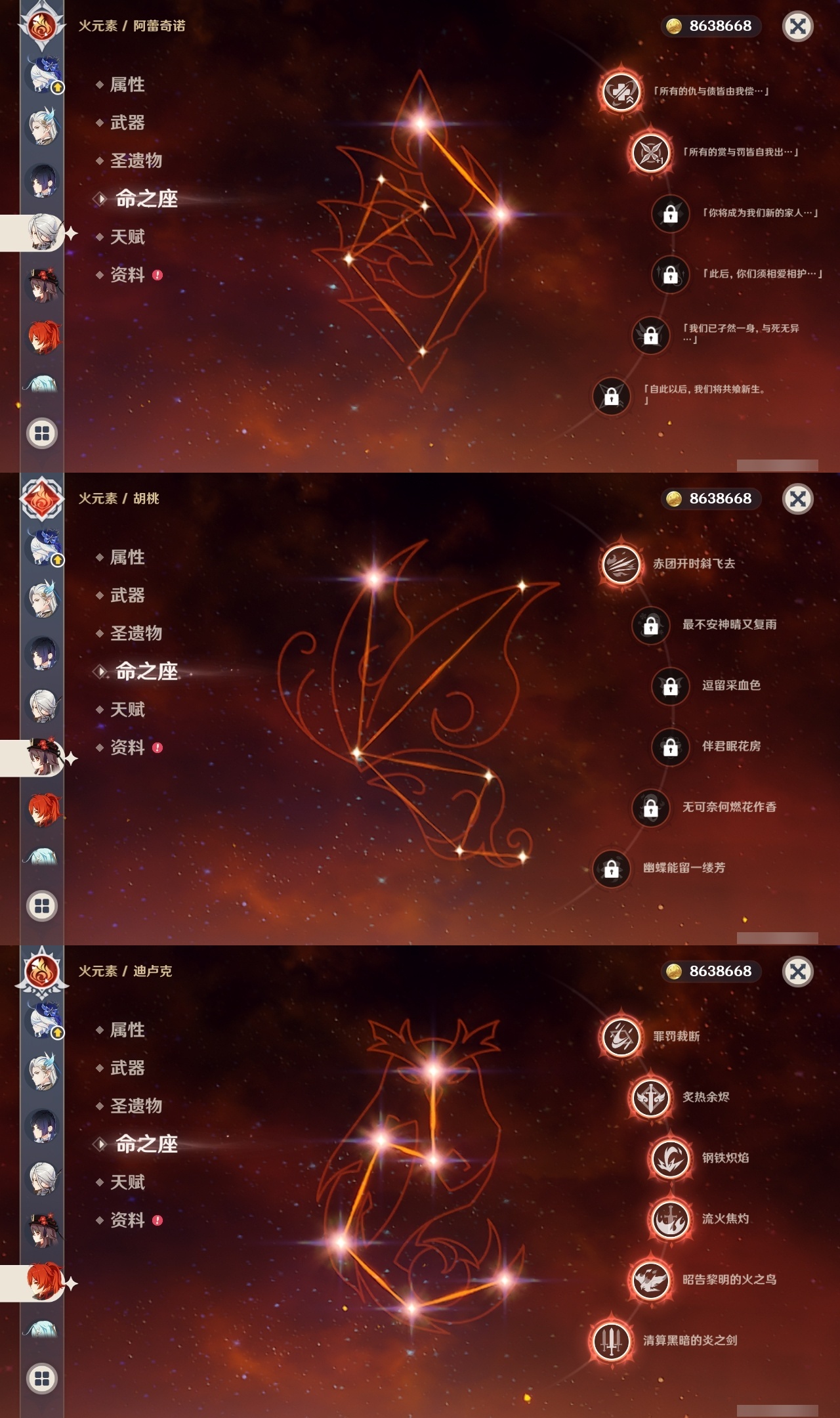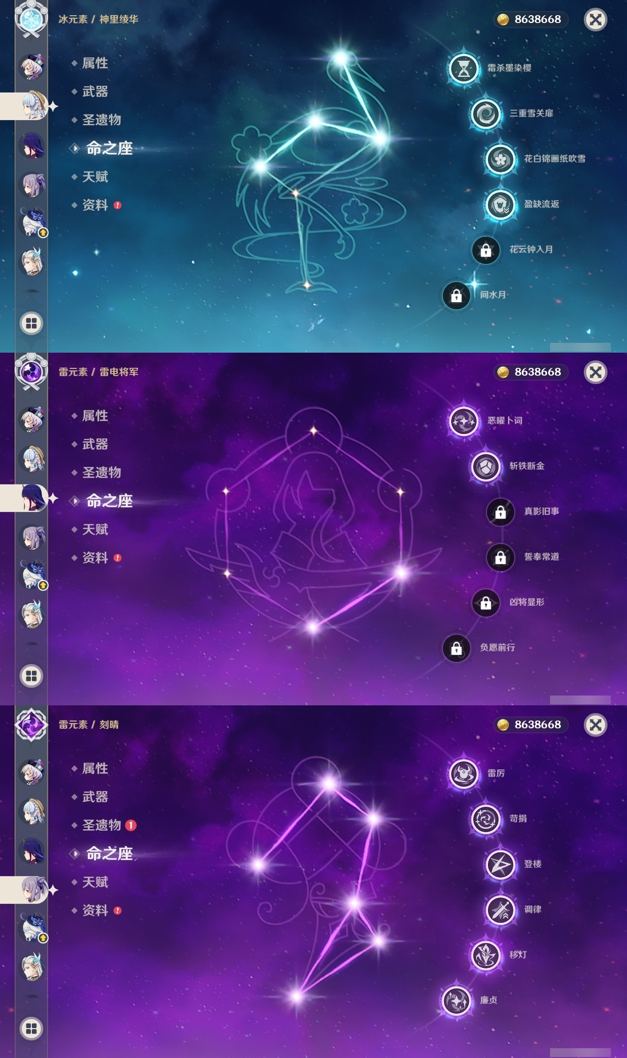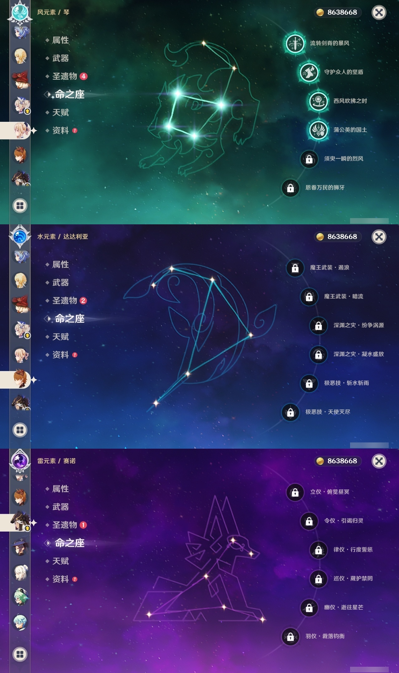 【原神】满命,冒险等级:59,五星数量:55,五星角色:那维莱特 6命迪卢克 6命魈 6命刻晴 6命七七 6命琴 4命神里绫华 4命闲云 2命阿蕾奇诺 2命雷电将军 2命莫娜 2命夜兰 2命纳西妲 2命迪希雅 1命胡桃 1命可莉 1命阿贝多 1命提纳里 1命基尼奇温迪玛薇卡优菈钟离荒泷一斗达达利亚芙宁娜娜维娅赛诺妮露艾尔海森流浪者枫原万叶甘雨__五星武器:护摩之杖 5精阿莫斯之弓 4精和璞鸢 3精狼的末路 3精天空之刃 3精四风原典 2精天空之翼 2精千夜浮梦 2精最初的大魔术万世流涌大典静水流涌之辉鹤鸣余音赤月之形风鹰剑天空之傲天空之脊雾切之回光薙草之稻光终末嗟叹之诗若水圣显之钥__四星角色:班尼特 6命行秋 6命九条裟罗 6命香菱 6命久岐忍 6命珐露珊 6命凝光 6命迪奥娜 6命砂糖 6命瑶瑶 6命莱依拉 6命坎蒂丝 6命多莉 6命芭芭拉 6命早柚 6命托马 6命烟绯 6命重云 6命辛焱 6命诺艾尔 6命罗莎莉亚 6命雷泽 6命菲谢尔 6命北斗 6命琳妮特 6命嘉明 6命云堇 5命菲米尼 5命五郎 4命夏沃蕾 4命柯莱 3命卡齐娜 1命鹿野院平藏 1命绮良良 1命埃洛伊米卡卡维赛索斯