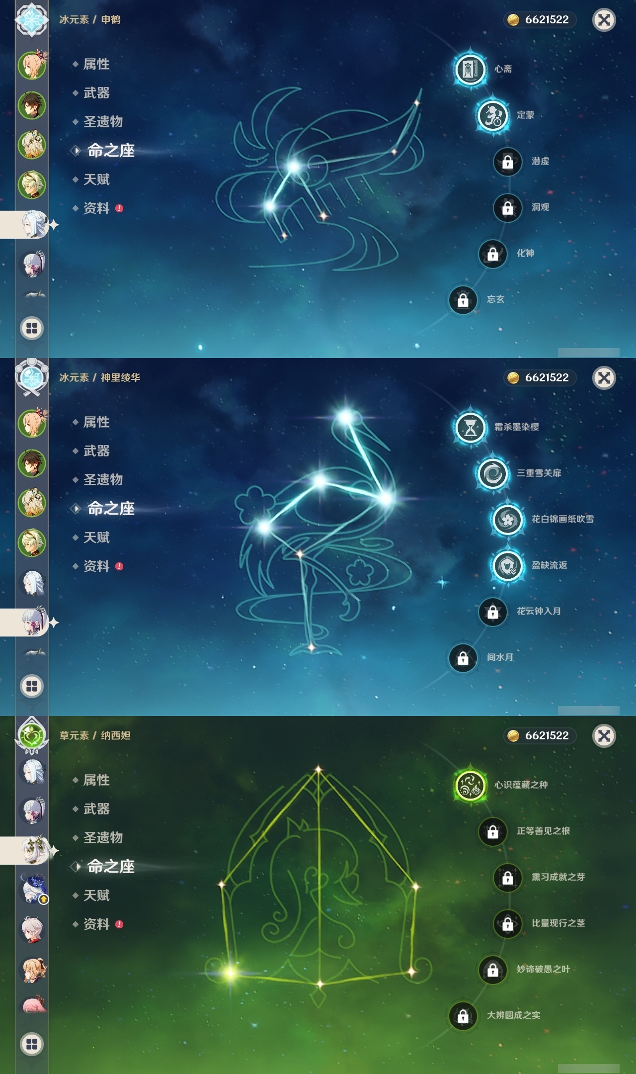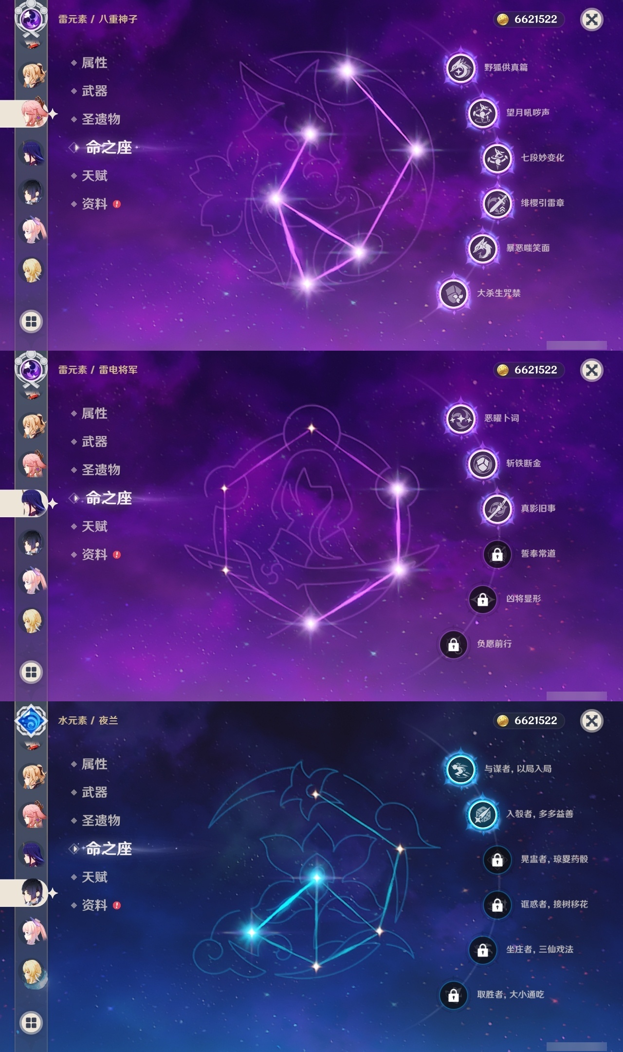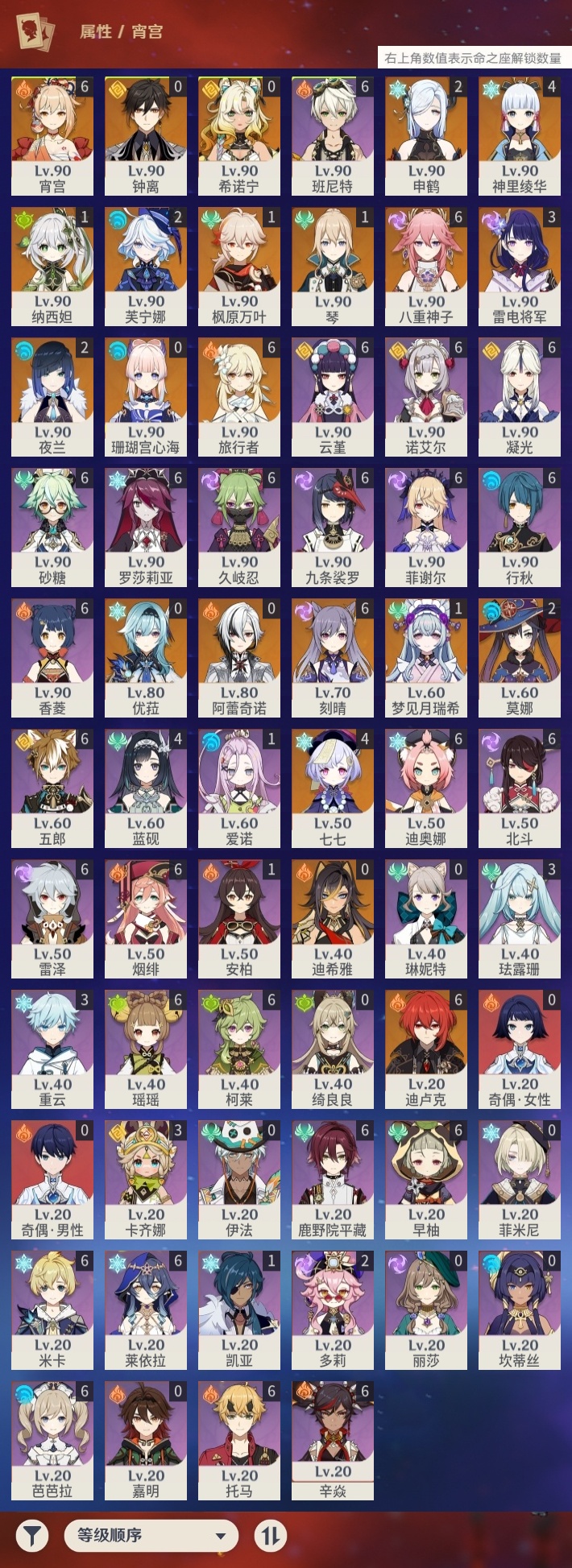 【原神】满命,冒险等级:60,五星数量:38,五星角色:迪卢克 6命刻晴 6命宵宫 6命八重神子 6命七七 4命神里绫华 4命雷电将军 3命芙宁娜 2命莫娜 2命申鹤 2命夜兰 2命梦见月瑞希 1命枫原万叶 1命琴 1命纳西妲 1命珊瑚宫心海希诺宁优菈迪希雅钟离阿蕾奇诺__五星武器:飞雷之弦振 2精四风原典 2精天空之卷 2精冬极白星 2精神乐之真意 2精赤月之形不灭月华和璞鸢天空之翼雾切之回光薙草之稻光息灾贯虹之槊若水千夜浮梦__四星角色:班尼特 6命行秋 6命九条裟罗 6命香菱 6命久岐忍 6命鹿野院平藏 6命凝光 6命迪奥娜 6命砂糖 6命瑶瑶 6命莱依拉 6命米卡 6命柯莱 6命芭芭拉 6命云堇 6命早柚 6命托马 6命五郎 6命烟绯 6命辛焱 6命诺艾尔 6命罗莎莉亚 6命雷泽 6命菲谢尔 6命北斗 6命蓝砚 4命卡齐娜 3命珐露珊 3命重云 3命多莉 2命爱诺 1命奇偶·女性奇偶·男性绮良良坎蒂丝菲米尼琳妮特嘉明伊法