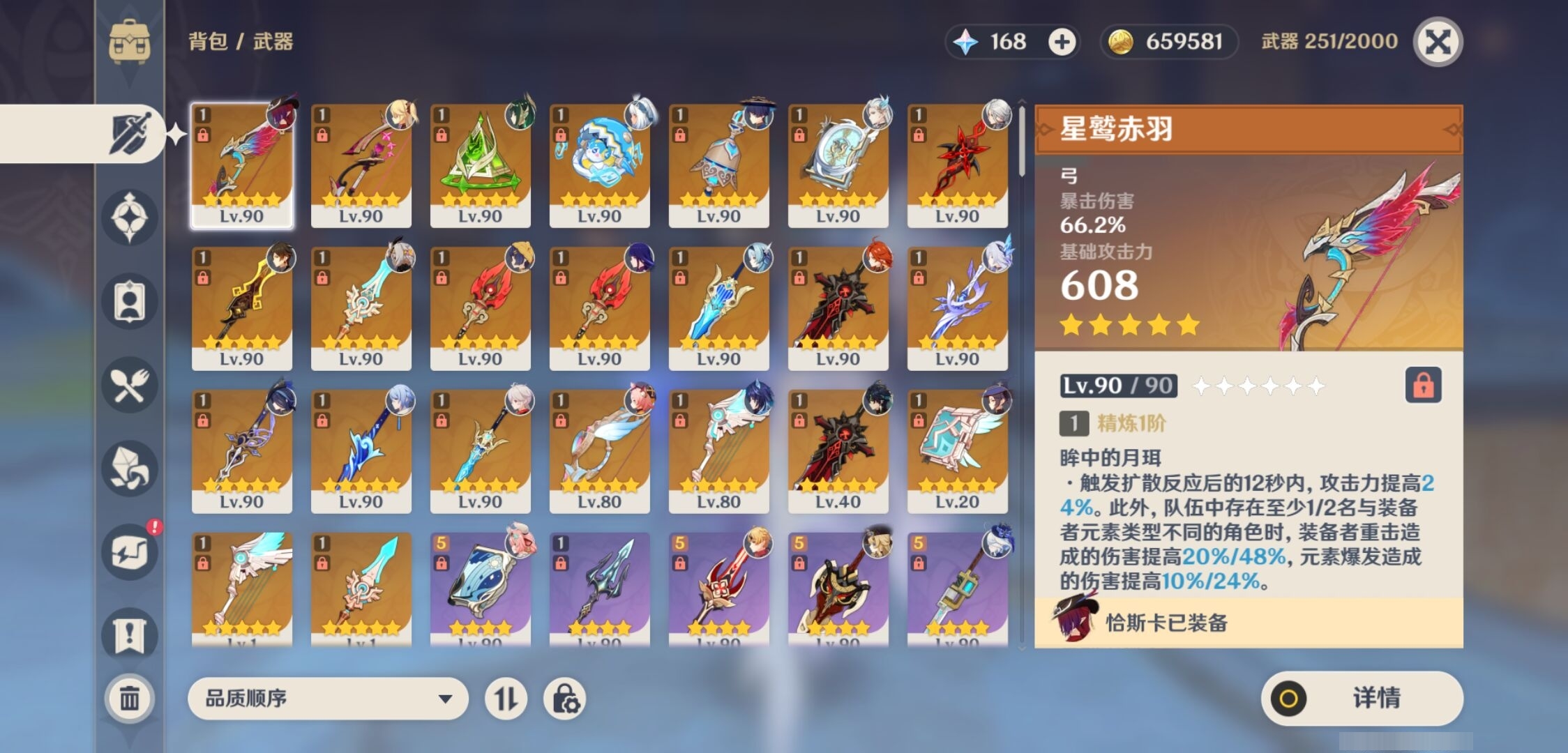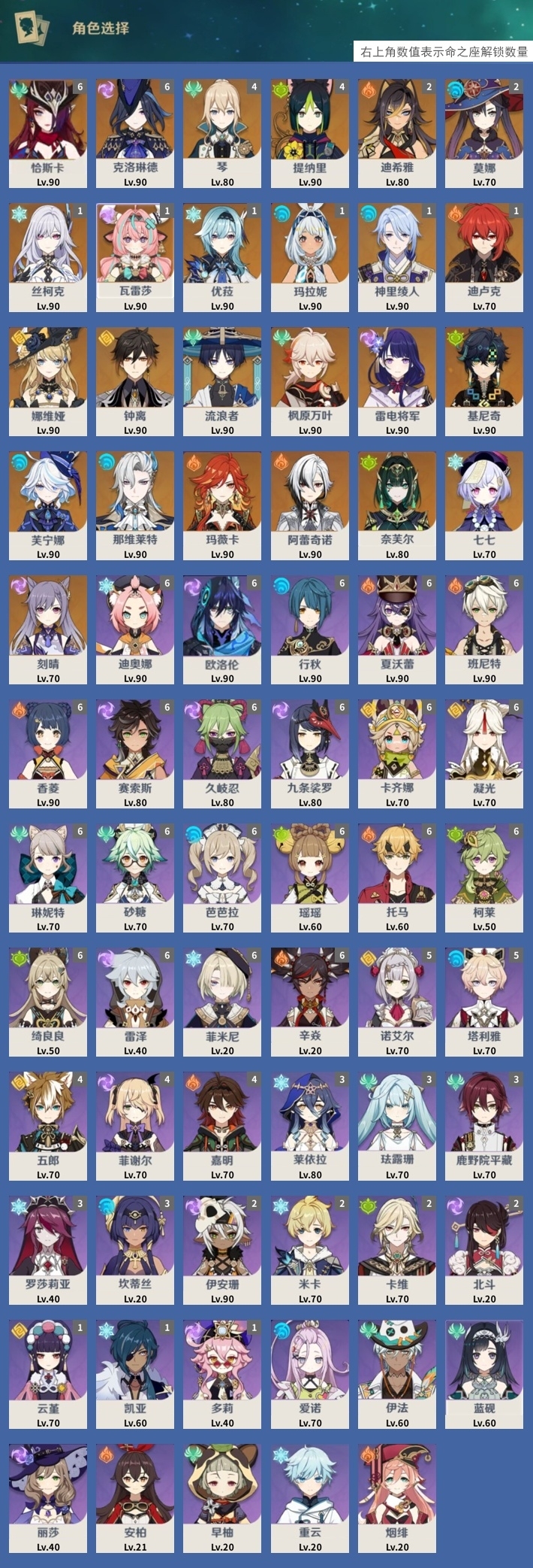 [14062721]78黄 风:4命琴,6命恰斯卡,0命流浪者,0命枫原万叶 火:0命玛薇卡,0命阿蕾奇诺,2命迪希雅,1命迪卢克 水:1命玛拉妮,0命芙宁娜,0命那维莱特,1命神里绫人,2命莫娜 冰:1命丝柯克,1命优菈,0命七七 岩:0命娜维娅,0命钟离 雷:1命瓦雷莎,6命克洛琳德,0命雷电将军,0命刻晴 草:0命基尼奇,4命提纳里,0命奈芙尔 弓:精1星鹫赤羽,精1最初的大魔术,精1白雨心弦,精1天空之翼,精1天空之翼 法器:精1真语秘匣,精1冲浪时光,精1图莱杜拉的回忆,精1四风原典,精1天空之卷 单手剑:精1苍耀,精1赦罪,精1波乱月白经津,精1苍古自由之誓 双手剑:精1松籁响起之时,精1狼的末路,精1狼的末路 长柄武器:精1赤月之形,精1贯虹之槊,精1天空之脊,精1天空之脊,精1护摩之杖,精1护摩之杖 【角色皮肤】 四星角色:班尼特-炽绘奇旅,香菱-岁夜欢哗,绮良良-倩影游侠,行秋-雨化竹身,凯亚-帆影游风