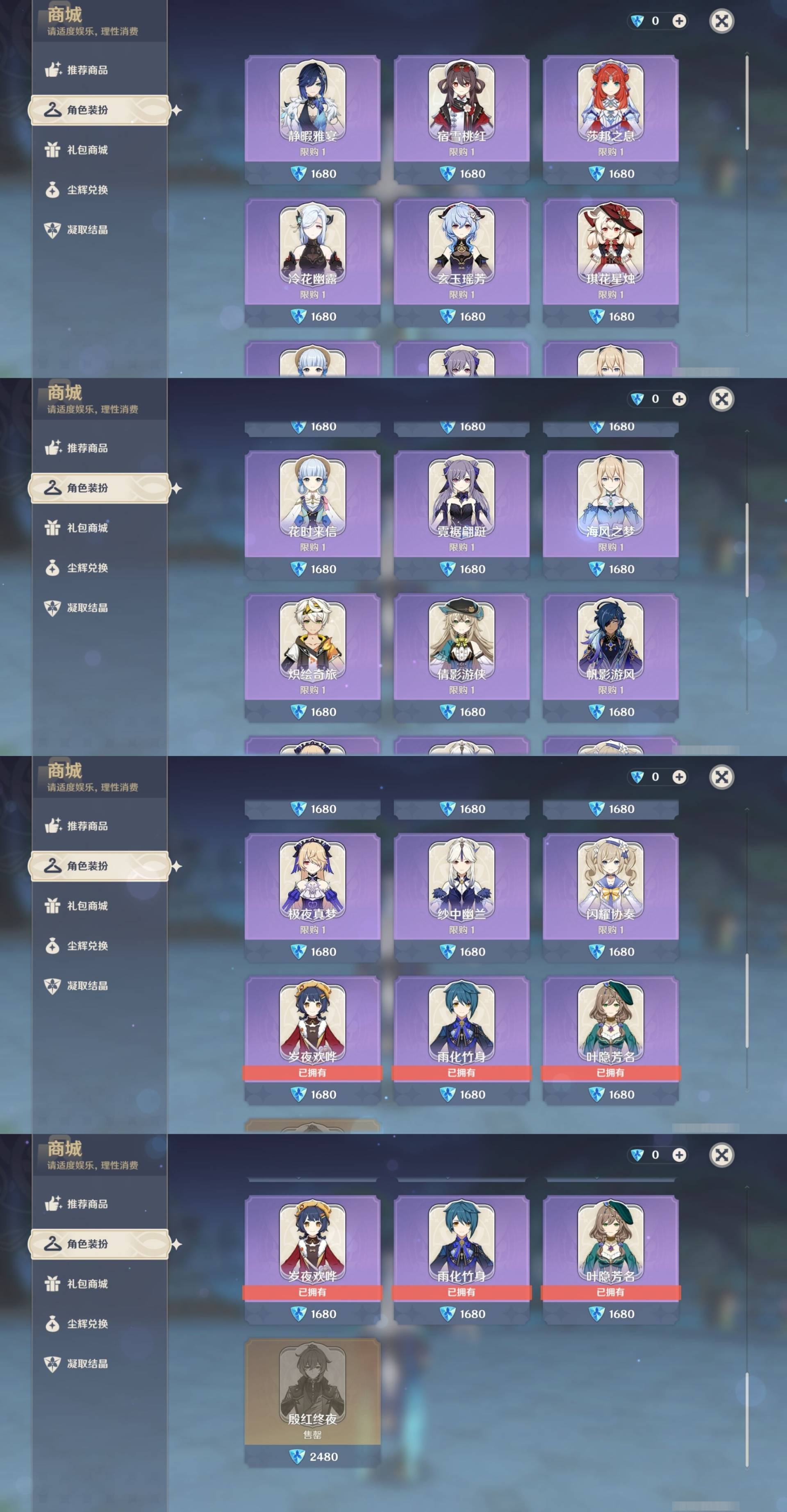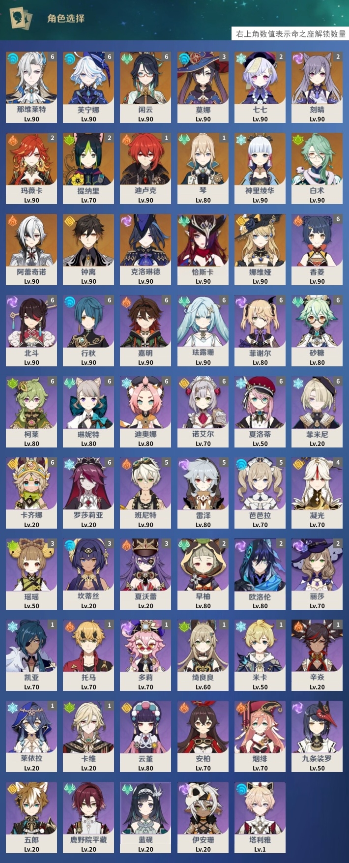 [14062725]60黄 风:0命恰斯卡,6命闲云,1命琴 火:2命玛薇卡,0命阿蕾奇诺,1命迪卢克 水:6命那维莱特,6命芙宁娜,3命莫娜 冰:2命七七,0命神里绫华 岩:0命钟离,0命娜维娅 雷:0命克洛琳德,2命刻晴 草:0命白术,2命提纳里 法器:精1万世流涌大典,精1四风原典,精1天空之卷,精1千夜浮梦 单手剑:精1赦罪,精1静水流涌之辉,精1天空之刃,精1风鹰剑,精1风鹰剑 长柄武器:精1和璞鸢,精1和璞鸢,精1赤月之形 【角色皮肤】 五星角色:迪卢克-殷红终夜 四星角色:香菱-岁夜欢哗,行秋-雨化竹身,丽莎-叶隐芳名