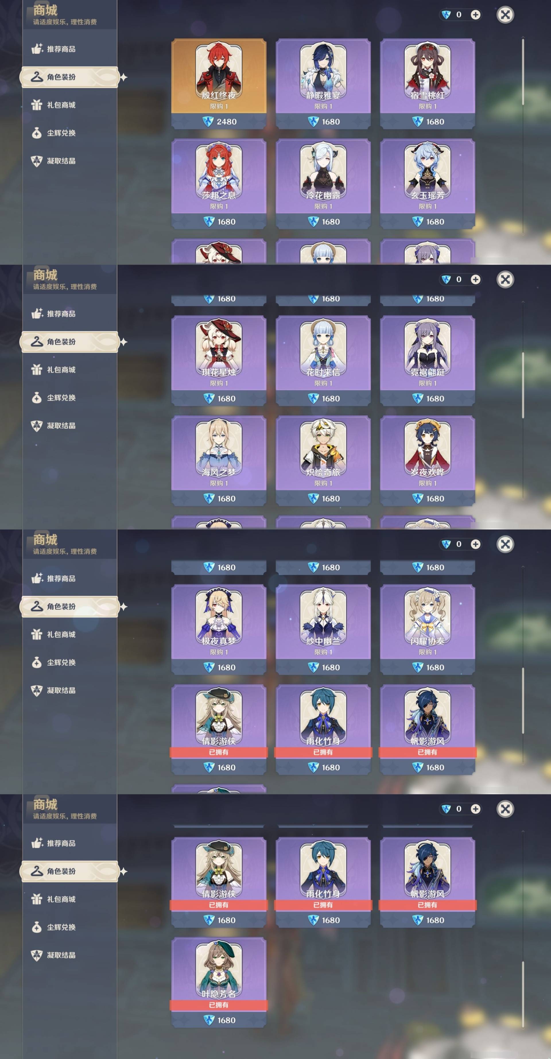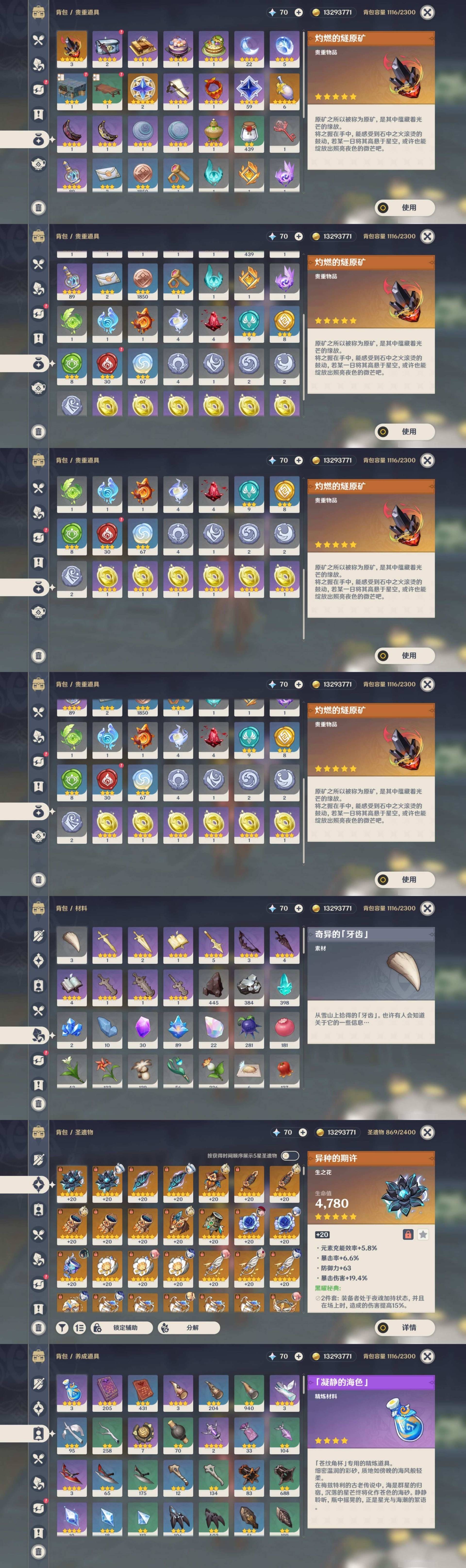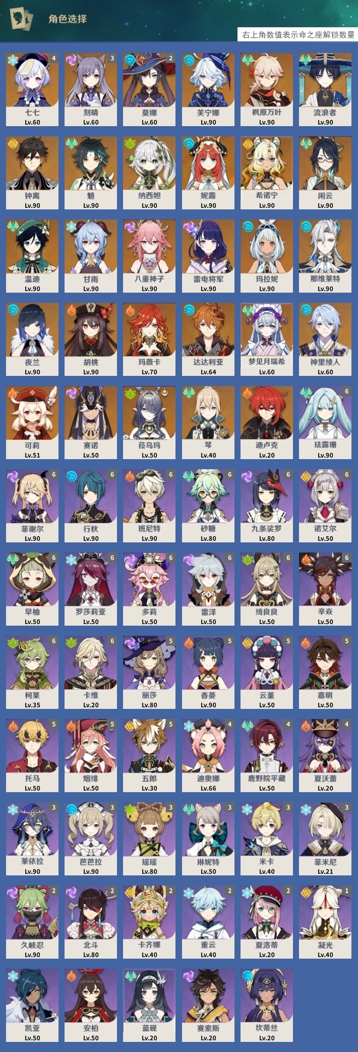 [14095186]47黄 风:0命枫原万叶,0命流浪者,0命魈,0命闲云,0命温迪,0命梦见月瑞希,0命琴 火:0命胡桃,0命玛薇卡,0命可莉,0命迪卢克 水:0命芙宁娜,0命妮露,0命玛拉妮,0命那维莱特,0命夜兰,0命达达利亚,0命神里绫人,2命莫娜 冰:0命甘雨,4命七七 岩:0命钟离,0命希诺宁 雷:0命八重神子,0命雷电将军,3命刻晴,0命赛诺 草:0命纳西妲,0命菈乌玛 弓:精1阿莫斯之弓,精1阿莫斯之弓 法器:精1千夜浮梦,精1碧落之珑,精1碧落之珑 单手剑:精1苍古自由之誓 双手剑:精1狼的末路 长柄武器:精1护摩之杖,精1天空之脊 【角色皮肤】 四星角色:绮良良-倩影游侠,行秋-雨化竹身,凯亚-帆影游风,丽莎-叶隐芳名