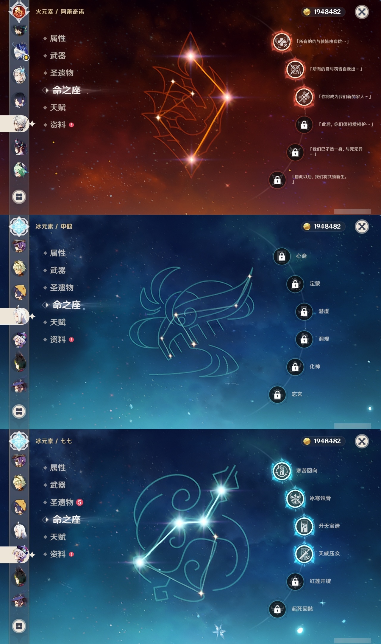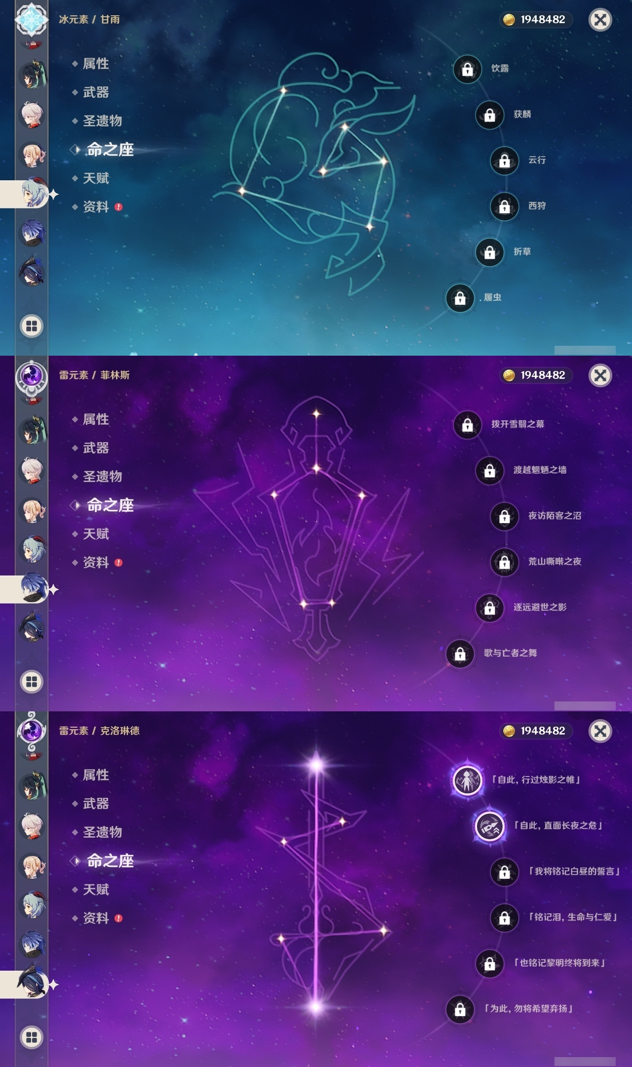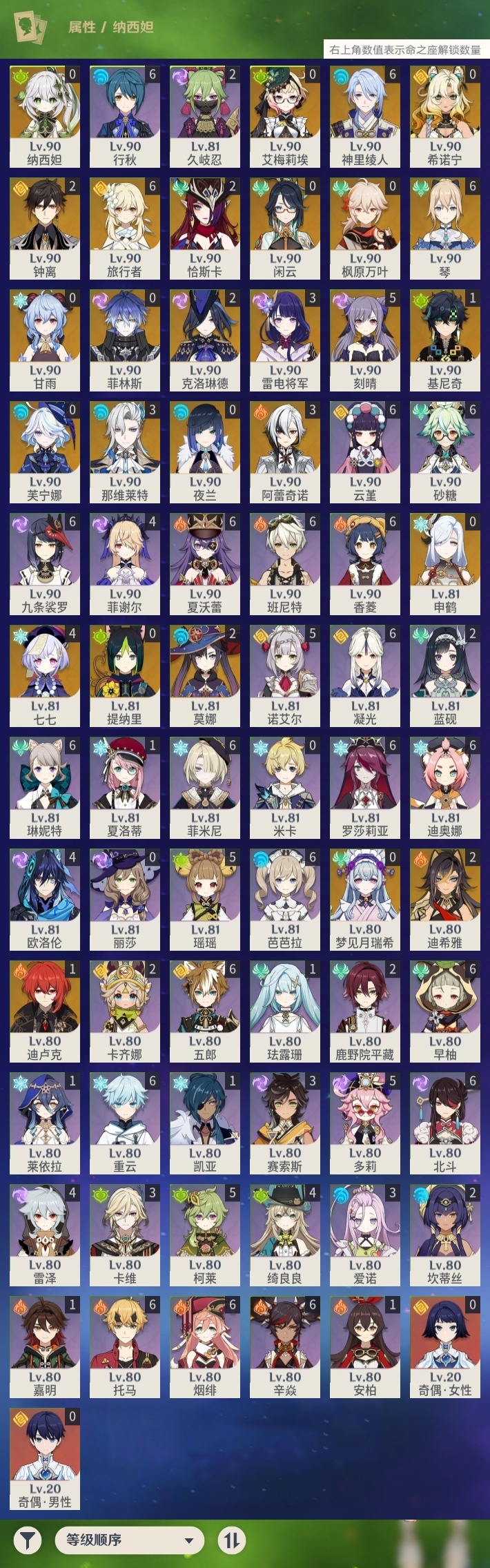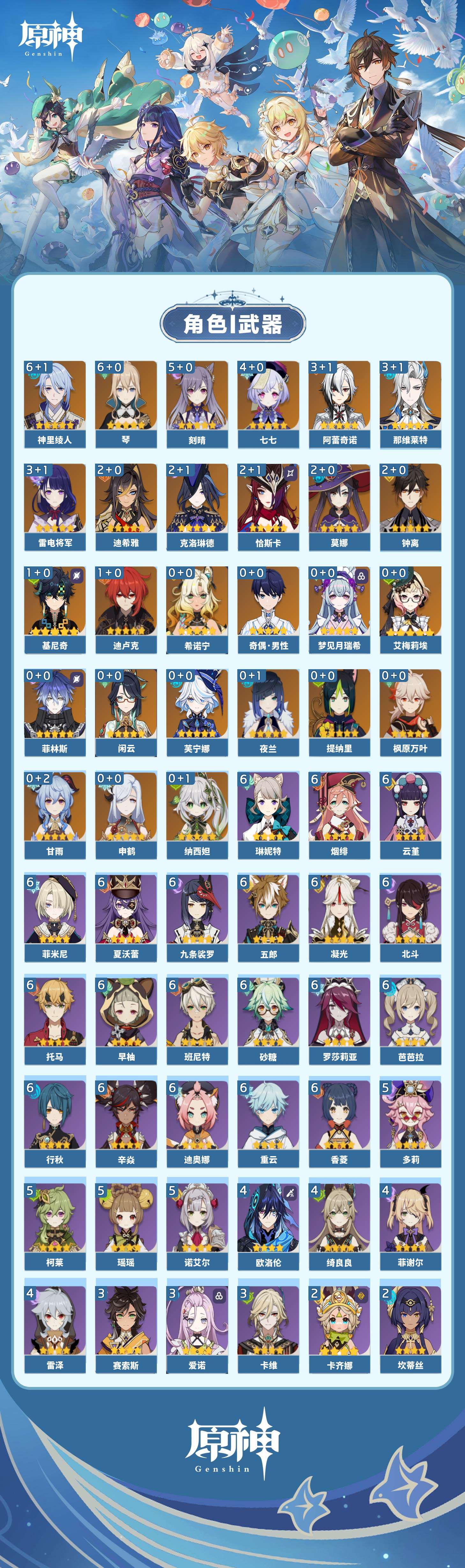 【原神】【lyys8366】冒险等级:60,五星数量:48,五星角色:琴 6命神里绫人 6命刻晴 5命七七 4命那维莱特 3命阿蕾奇诺 3命雷电将军 3命恰斯卡 2命迪希雅 2命莫娜 2命钟离 2命克洛琳德 2命基尼奇 1命迪卢克 1命艾梅莉埃希诺宁梦见月瑞希申鹤夜兰芙宁娜提纳里闲云纳西妲菲林斯枫原万叶甘雨__五星武器:和璞鸢 5精阿莫斯之弓 2精星鹫赤羽万世流涌大典赤月之形真语秘匣裁叶萃光风鹰剑护摩之杖磐岩结绿四风原典天空之脊天空之翼无工之剑雾切之回光薙草之稻光波乱月白经津若水千夜浮梦赦罪__四星角色:班尼特 6命行秋 6命九条裟罗 6命香菱 6命凝光 6命迪奥娜 6命砂糖 6命芭芭拉 6命云堇 6命早柚 6命托马 6命五郎 6命烟绯 6命重云 6命辛焱 6命罗莎莉亚 6命北斗 6命菲米尼 6命琳妮特 6命夏沃蕾 6命瑶瑶 5命多莉 5命柯莱 5命诺艾尔 5命绮良良 4命欧洛伦 4命雷泽 4命菲谢尔 4命卡维 3命爱诺 3命赛索斯 3命卡齐娜 2命久岐忍 2命鹿野院平藏 2命坎蒂丝 2命蓝砚 2命珐露珊 1命莱依拉 1命夏洛蒂 1命嘉明 1命奇偶·女性奇偶·男性米卡
