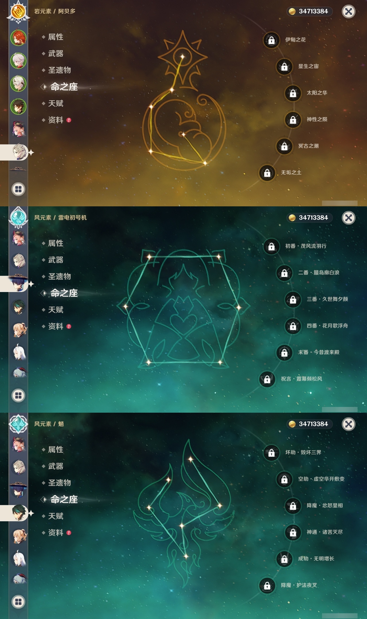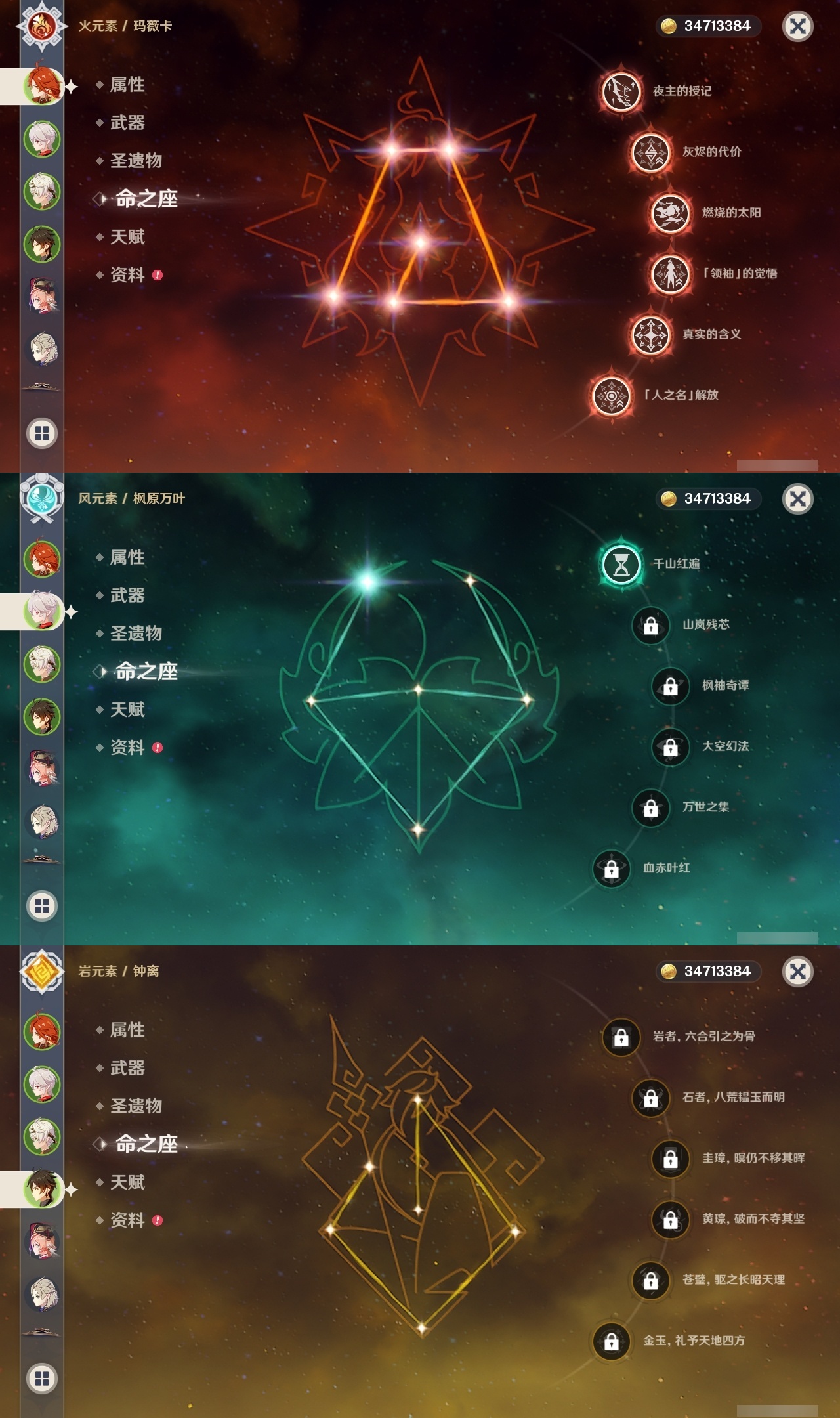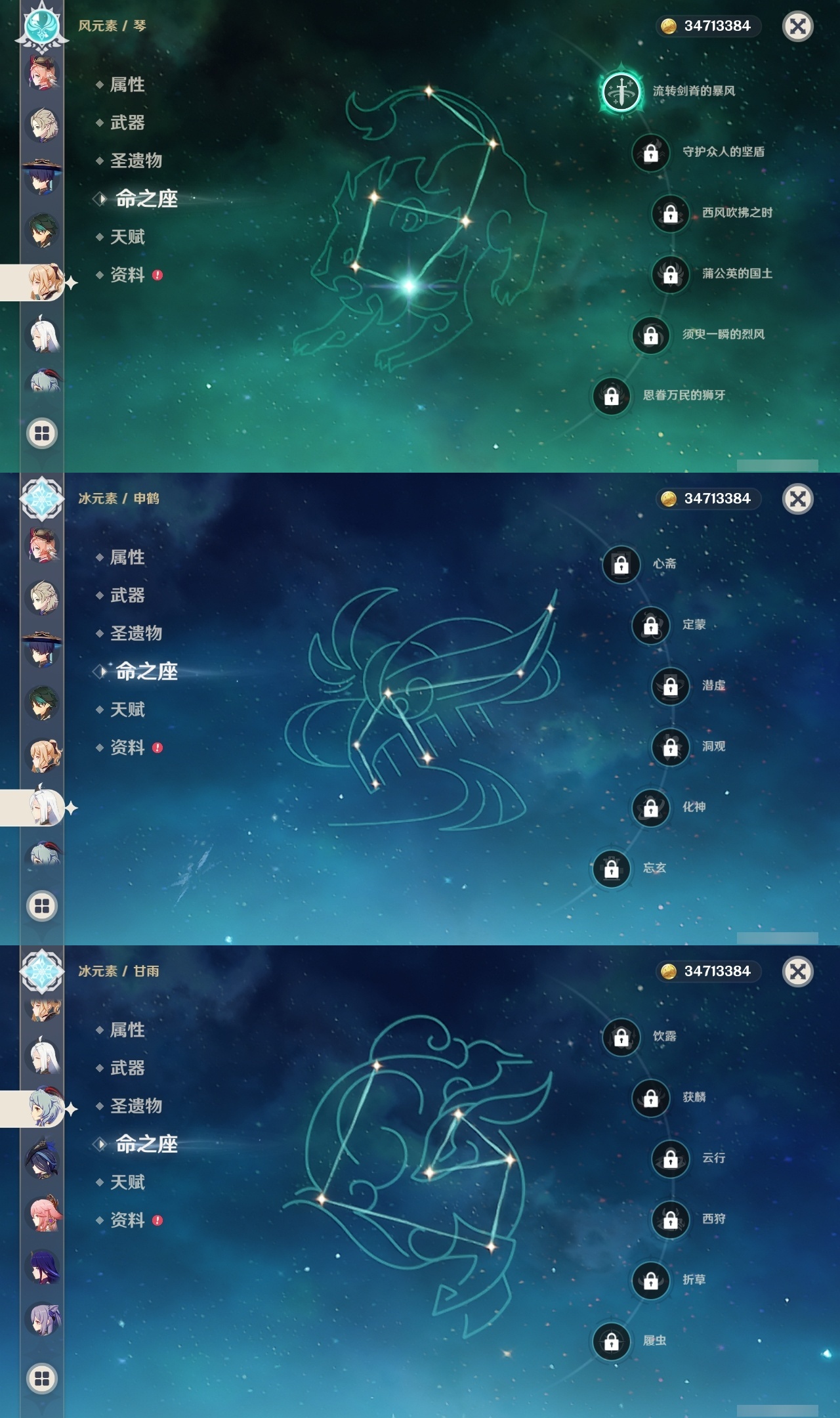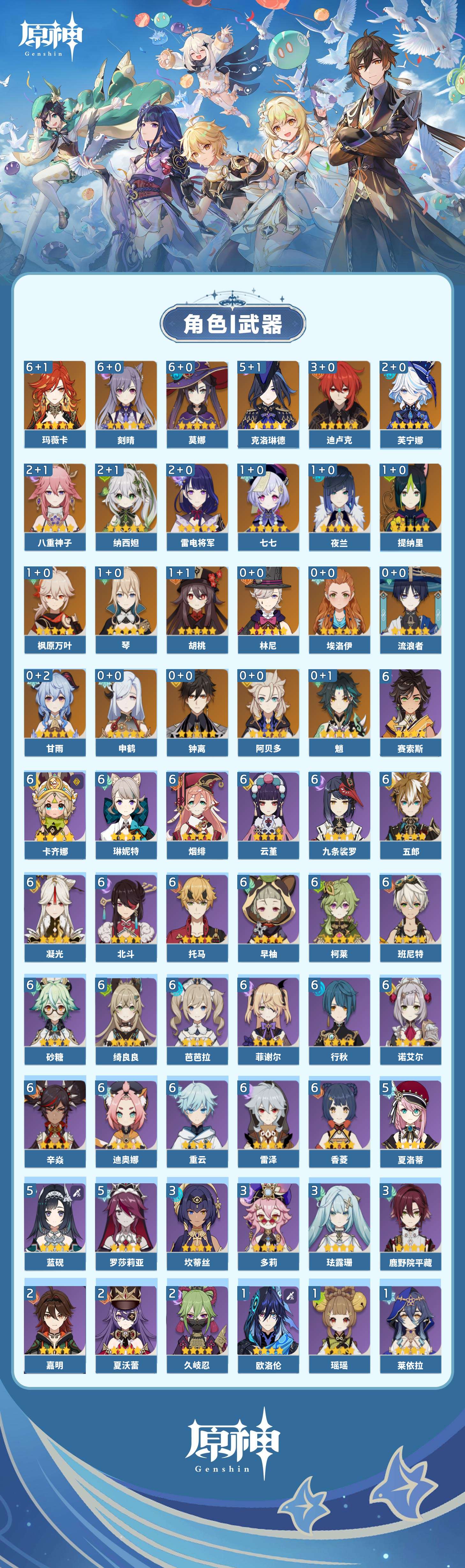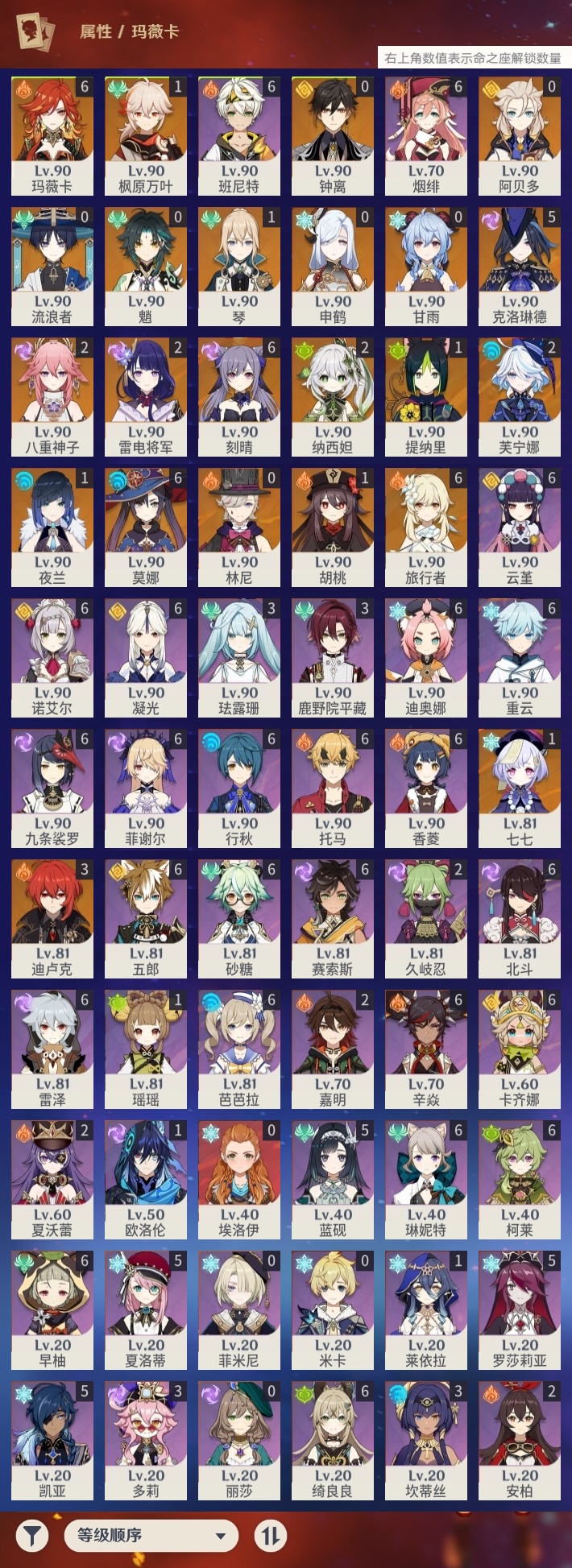 【原神】满命,冒险等级:60,五星数量:36,五星角色:玛薇卡 6命刻晴 6命莫娜 6命克洛琳德 5命迪卢克 3命芙宁娜 2命雷电将军 2命八重神子 2命纳西妲 2命枫原万叶 1命胡桃 1命七七 1命琴 1命夜兰 1命提纳里 1命钟离申鹤林尼阿贝多流浪者甘雨魈__五星武器:阿莫斯之弓 2精天空之卷 2精焚曜千阳风鹰剑和璞鸢护摩之杖四风原典天空之脊天空之刃雾切之回光神乐之真意千夜浮梦赦罪__四星角色:卡齐娜 6命班尼特 6命行秋 6命九条裟罗 6命香菱 6命凝光 6命迪奥娜 6命砂糖 6命绮良良 6命柯莱 6命芭芭拉 6命云堇 6命早柚 6命托马 6命五郎 6命烟绯 6命重云 6命辛焱 6命诺艾尔 6命雷泽 6命菲谢尔 6命北斗 6命琳妮特 6命赛索斯 6命蓝砚 5命罗莎莉亚 5命夏洛蒂 5命鹿野院平藏 3命珐露珊 3命坎蒂丝 3命多莉 3命久岐忍 2命夏沃蕾 2命嘉明 2命瑶瑶 1命莱依拉 1命欧洛伦 1命埃洛伊米卡菲米尼