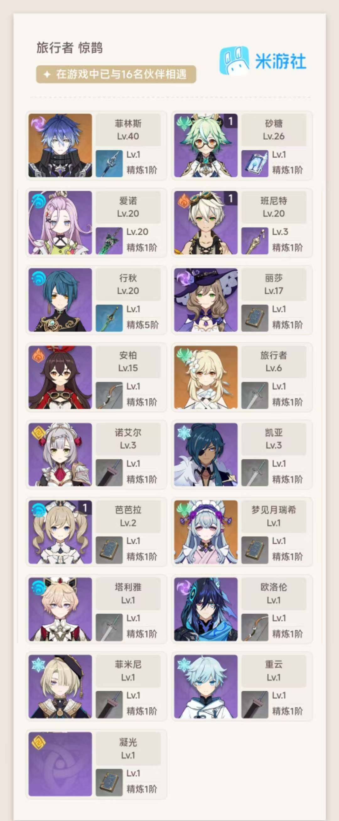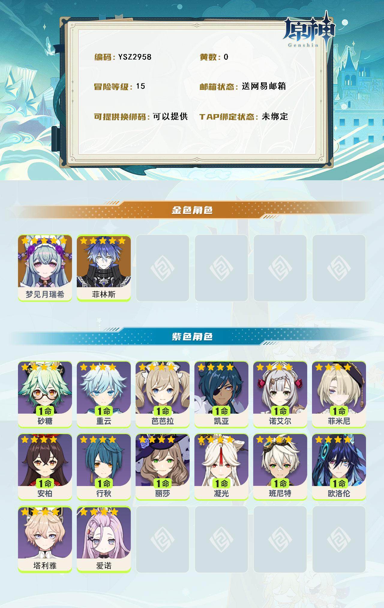 【ysz2958】15级/女主/3个五星角色/0命菲林斯/0命梦见月瑞希/0命爱诺/0命塔利雅/0命欧洛伦/0命菲米尼/1命砂糖/0命丽莎/0命安柏/1命班尼特/0命行秋/1命芭芭拉/0命凝光/0命诺艾尔/0命凯亚/0命重云