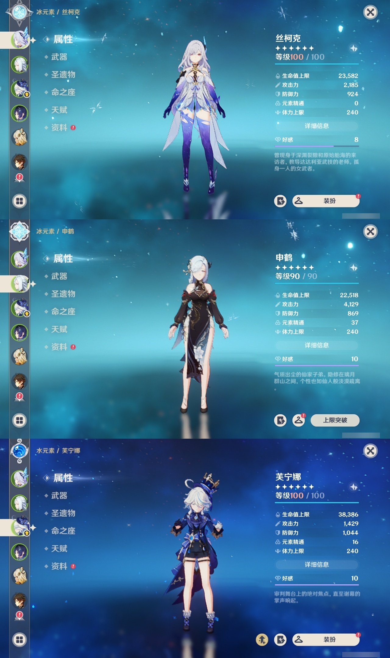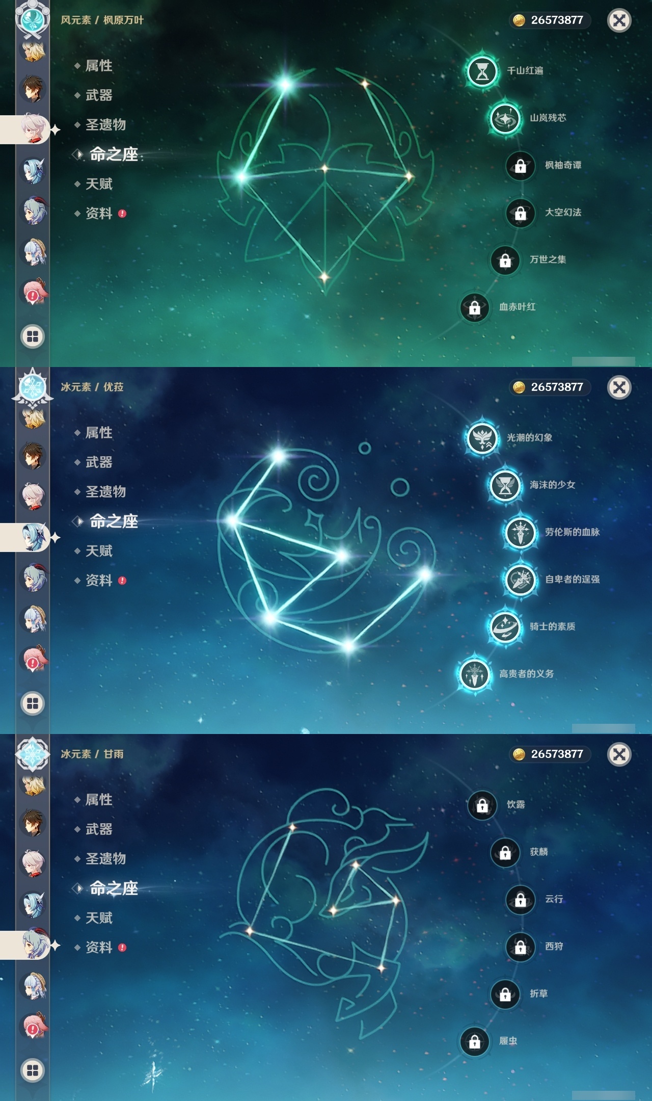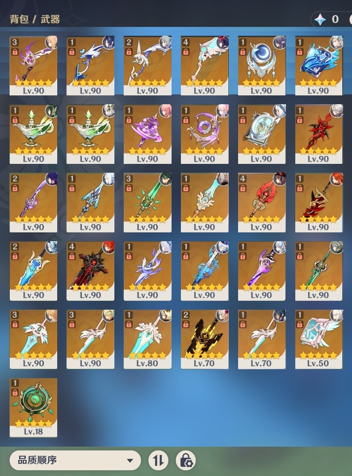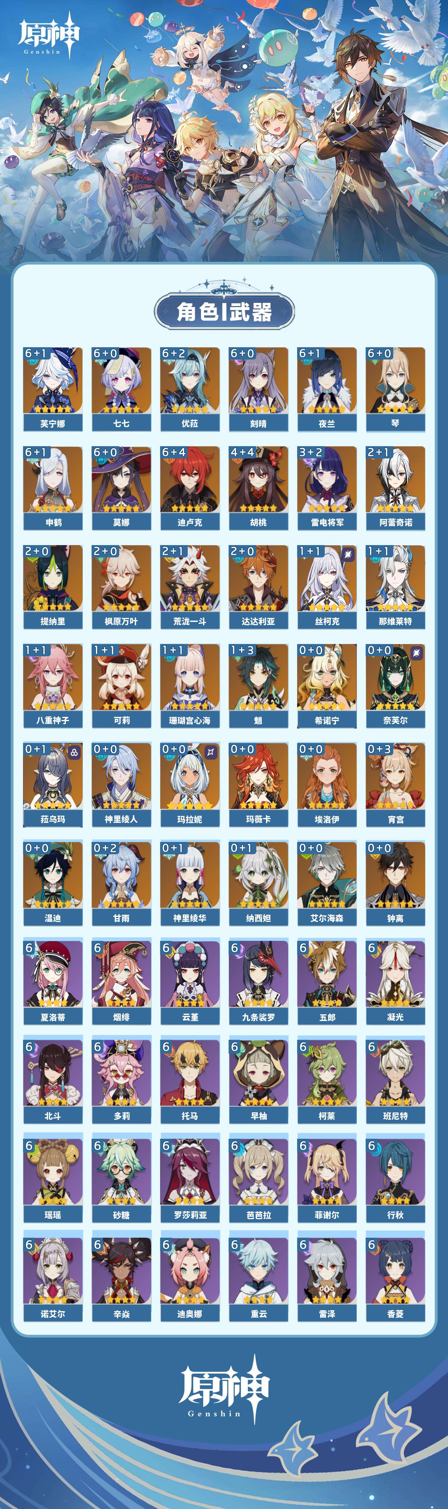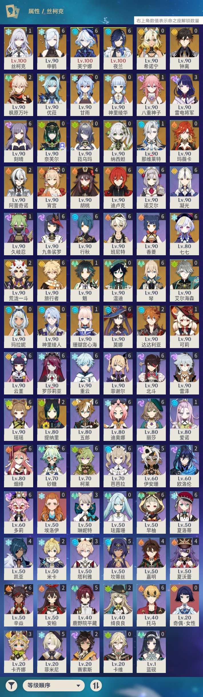 【原神】满命,冒险等级:60,五星数量:66,五星角色:芙宁娜 6命迪卢克 6命刻晴 6命莫娜 6命七七 6命琴 6命优菈 6命申鹤 6命夜兰 6命胡桃 4命雷电将军 3命阿蕾奇诺 2命达达利亚 2命枫原万叶 2命荒泷一斗 2命提纳里 2命那维莱特 1命丝柯克 1命魈 1命可莉 1命珊瑚宫心海 1命八重神子 1命玛拉妮希诺宁神里绫华温迪玛薇卡宵宫钟离神里绫人纳西妲菈乌玛艾尔海森奈芙尔甘雨__五星武器:护摩之杖 4精狼的末路 4精天空之翼 4精飞雷之弦振 3精风鹰剑 3精和璞鸢 3精天空之刃 3精阿莫斯之弓 2精松籁响起之时 2精无工之剑 2精薙草之稻光 2精碧落之珑万世流涌大典静水流涌之辉赤月之形苍耀纺夜天镜不灭月华磐岩结绿四风原典天空之傲天空之脊天空之卷雾切之回光赤角石溃杵息灾神乐之真意若水千夜浮梦__四星角色:班尼特 6命行秋 6命九条裟罗 6命香菱 6命凝光 6命迪奥娜 6命砂糖 6命瑶瑶 6命多莉 6命柯莱 6命芭芭拉 6命云堇 6命早柚 6命托马 6命五郎 6命烟绯 6命重云 6命辛焱 6命诺艾尔 6命罗莎莉亚 6命雷泽 6命菲谢尔 6命北斗 6命夏洛蒂 6命鹿野院平藏 5命坎蒂丝 5命菲米尼 5命伊安珊 5命夏沃蕾 4命嘉明 4命卡齐娜 3命琳妮特 3命塔利雅 3命绮良良 2命米卡 2命欧洛伦 2命赛索斯 2命久岐忍 1命爱诺 1命埃洛伊奇偶·女性珐露珊卡维蓝砚