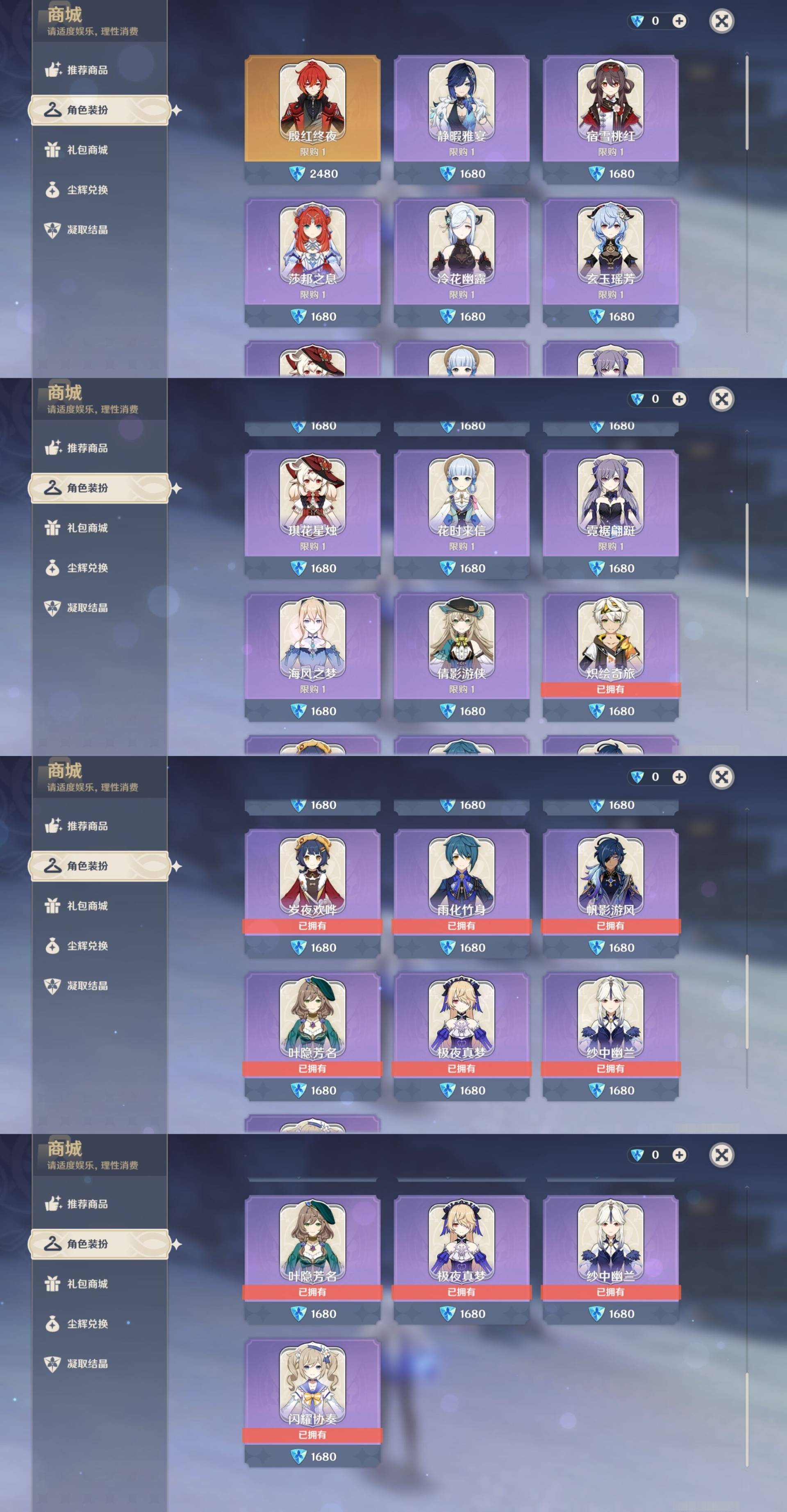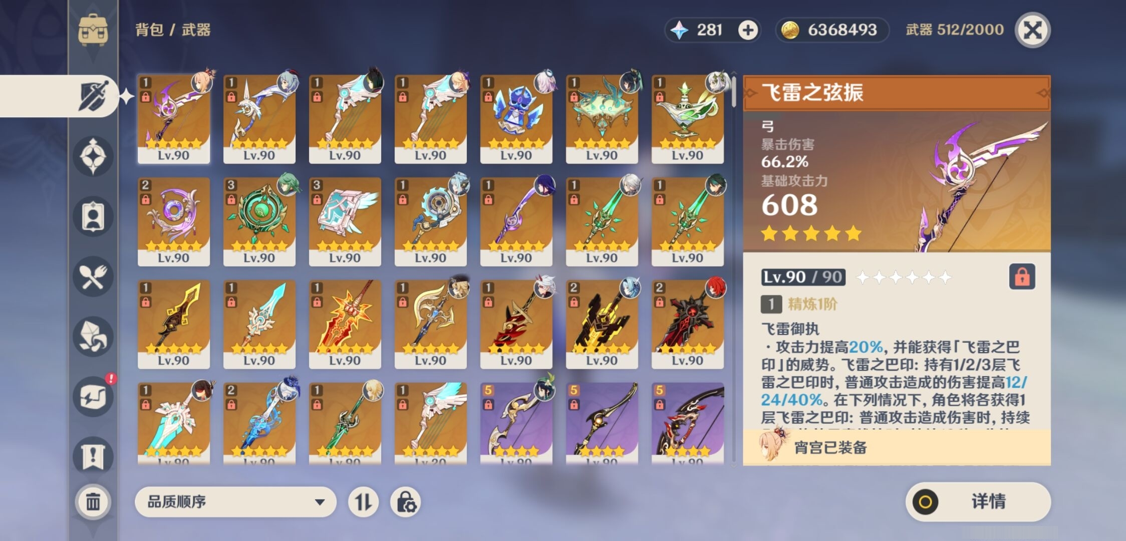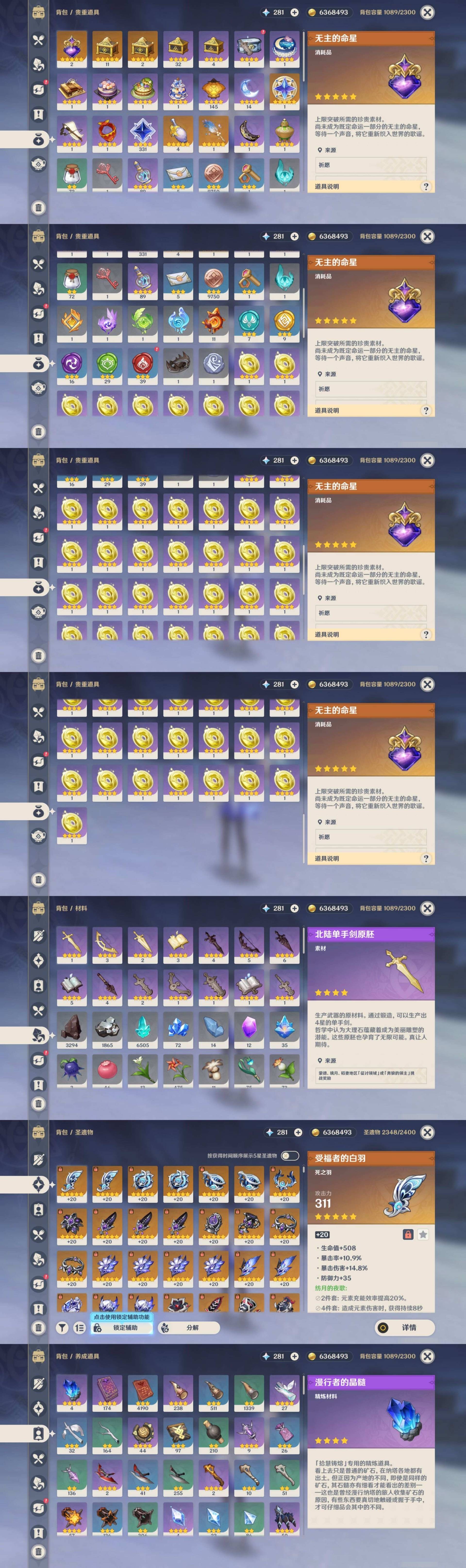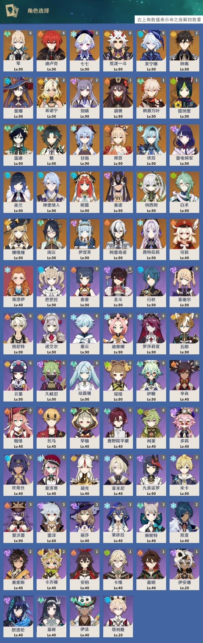 [14134723]105黄 风:0命闲云,1命枫原万叶,0命魈,0命温迪,6命琴 火:0命阿蕾奇诺,0命宵宫,1命胡桃,6命迪卢克,0命可莉 水:0命夜兰,6命芙宁娜,0命妮露,0命神里绫人,2命莫娜 冰:0命茜特菈莉,0命优菈,0命甘雨,6命七七,0命埃洛伊 岩:2命希诺宁,0命娜维娅,6命荒泷一斗,2命钟离 雷:0命伊涅芙,0命赛诺,0命雷电将军,2命刻晴 草:0命白术,0命纳西妲,1命提纳里 弓:精1飞雷之弦振,精1阿莫斯之弓,精1天空之翼,精1天空之翼,精1天空之翼 法器:精1祭星者之望,精1鹤鸣余音,精1千夜浮梦,精2不灭月华,精3碧落之珑,精3天空之卷 单手剑:精2静水流涌之辉,精1磐岩结绿 双手剑:精1焚曜千阳,精1裁断,精1赤角石溃杵,精2无工之剑,精2狼的末路,精1天空之傲 长柄武器:精1支离轮光,精1薙草之稻光,精1和璞鸢,精1和璞鸢,精1贯虹之槊,精1天空之脊 【角色皮肤】 四星角色:班尼特-炽绘奇旅,香菱-岁夜欢哗,行秋-雨化竹身,凯亚-帆影游风,丽莎-叶隐芳名,菲谢尔-极夜真梦,凝光-纱中幽兰,芭芭拉-闪耀协奏