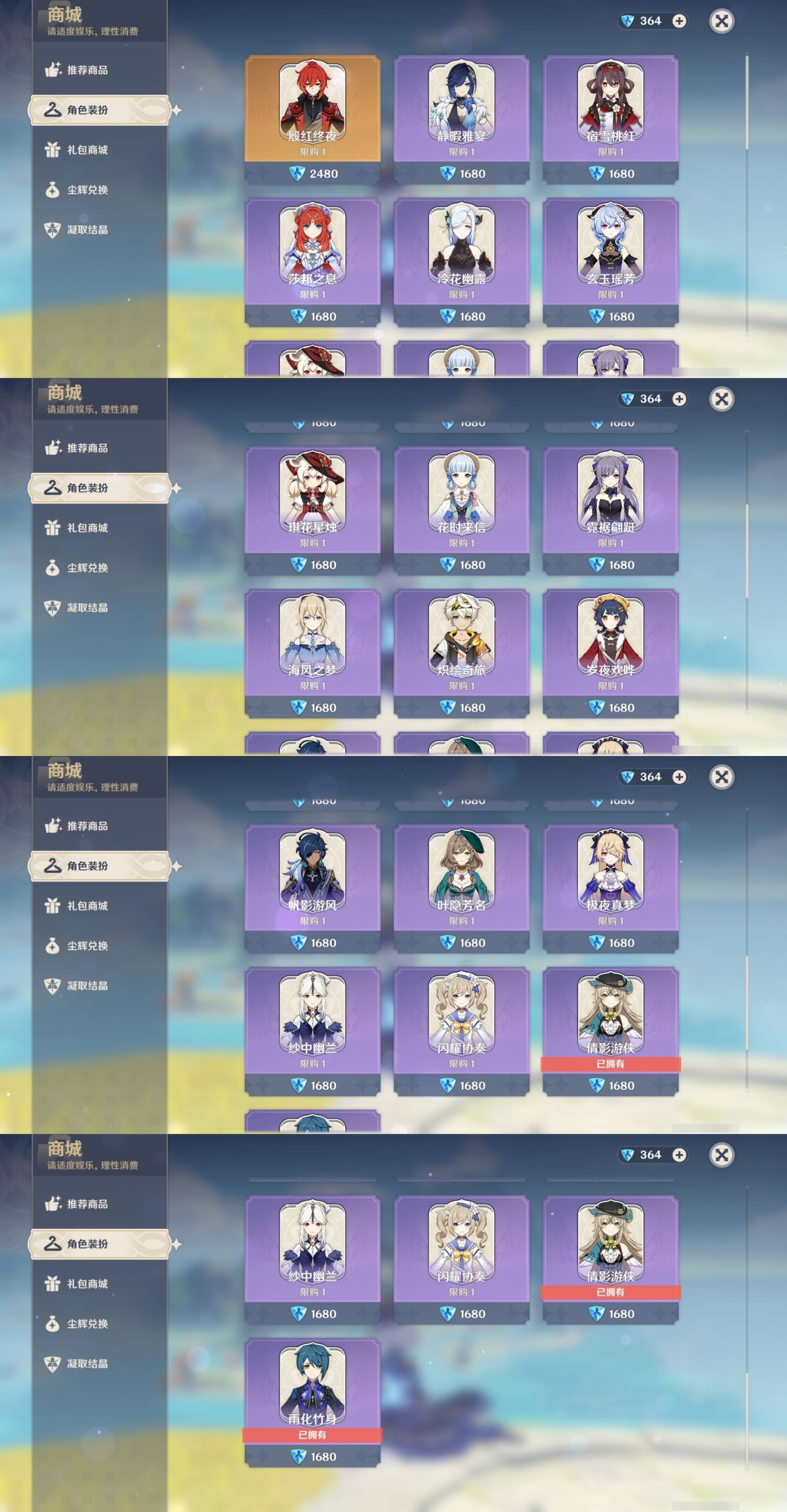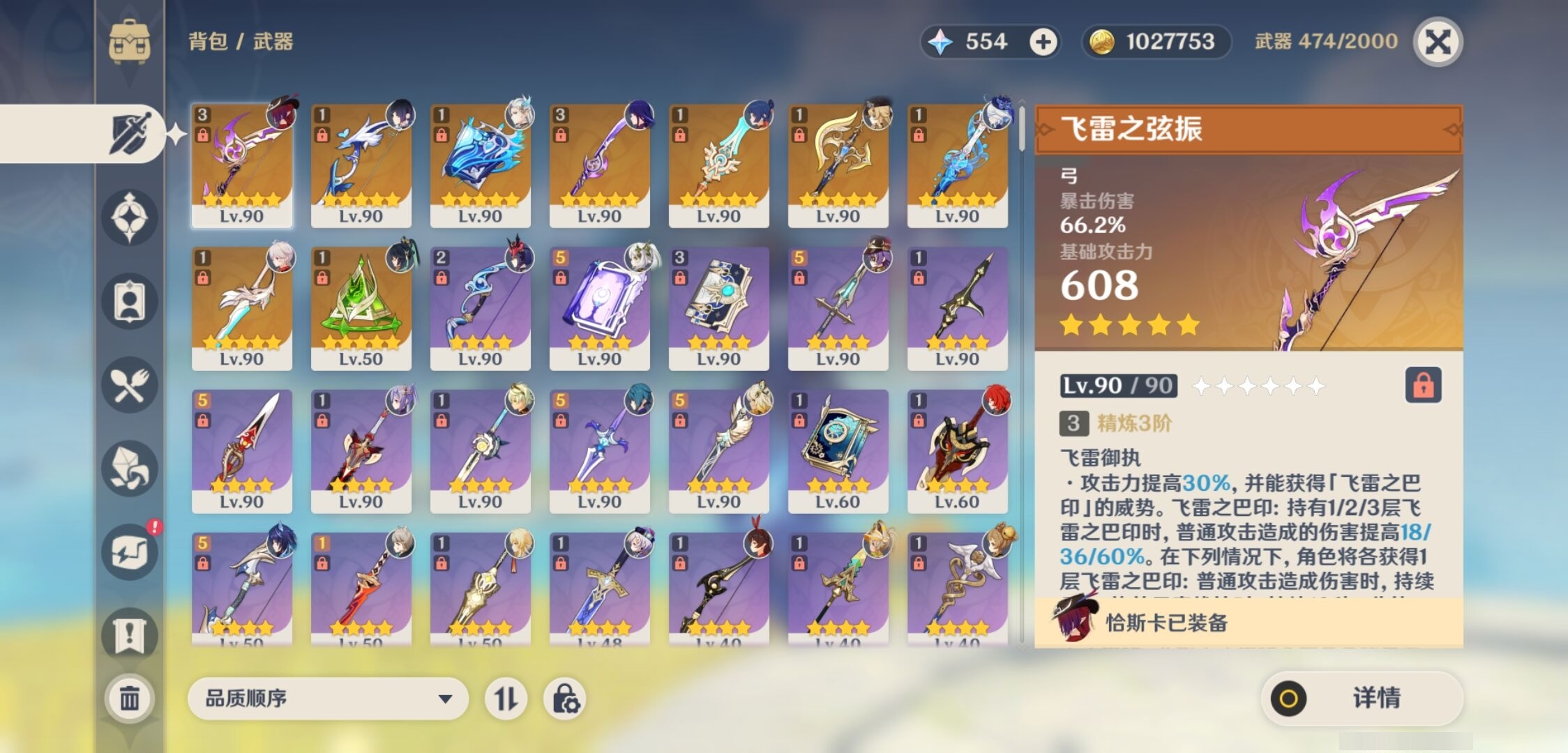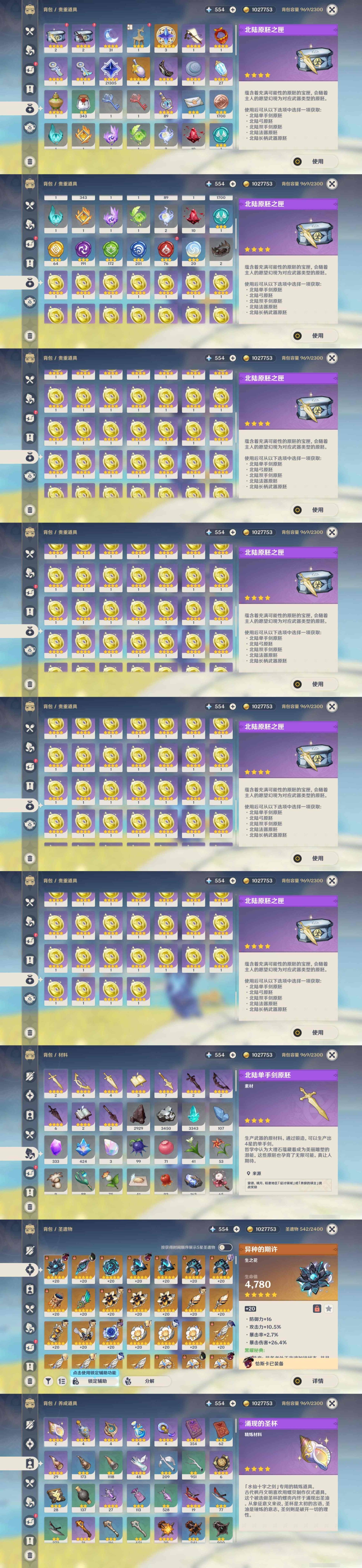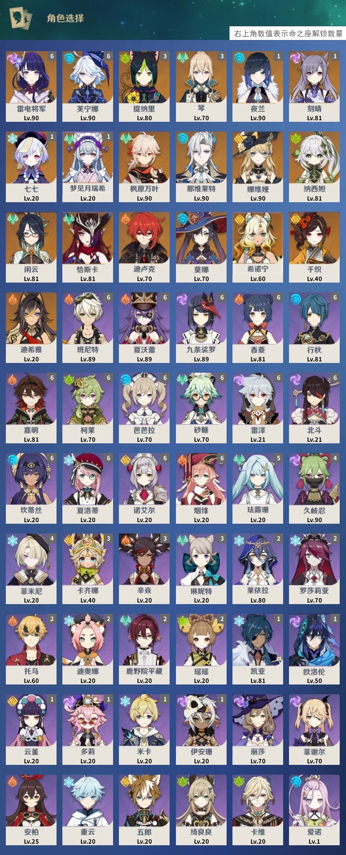 [14134957]54黄 风:0命恰斯卡,0命枫原万叶,0命闲云,3命琴,1命梦见月瑞希 火:0命迪卢克,0命迪希雅 水:1命夜兰,6命芙宁娜,0命那维莱特,0命莫娜 冰:1命七七 岩:0命娜维娅,0命希诺宁,0命千织 雷:6命雷电将军,1命刻晴 草:0命纳西妲,3命提纳里 弓:精3飞雷之弦振,精1若水 法器:精1万世流涌大典,精1真语秘匣 单手剑:精1静水流涌之辉,精1风鹰剑 双手剑:精1裁断 长柄武器:精3薙草之稻光,精1天空之脊 【角色皮肤】 四星角色:绮良良-倩影游侠,行秋-雨化竹身