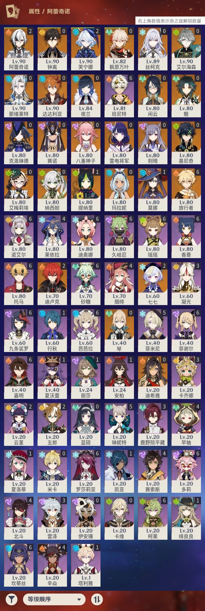 【原神】【lyys8015】冒险等级:60,五星数量:39,五星角色:芙宁娜 2命阿蕾奇诺 2命迪卢克 2命七七 2命莫娜 1命提纳里 1命艾梅莉埃玛拉妮琴基尼奇迪希雅钟离达达利亚八重神子那维莱特夜兰闲云赛诺丝柯克纳西妲艾尔海森枫原万叶魈克洛琳德刻晴雷电将军__五星武器:柔灯挽歌冲浪时光万世流涌大典静水流涌之辉赤月之形裁叶萃光和璞鸢护摩之杖天空之傲天空之刃薙草之稻光神乐之真意千夜浮梦__四星角色:班尼特 6命九条裟罗 6命香菱 6命久岐忍 6命迪奥娜 6命砂糖 6命瑶瑶 6命坎蒂丝 6命多莉 6命柯莱 6命芭芭拉 6命托马 6命诺艾尔 6命罗莎莉亚 6命菲谢尔 6命嘉明 6命菲米尼 5命琳妮特 5命莱依拉 4命早柚 4命烟绯 4命辛焱 4命北斗 4命赛索斯 4命卡齐娜 3命鹿野院平藏 3命凝光 3命雷泽 3命云堇 2命五郎 2命行秋 1命绮良良 1命夏洛蒂 1命夏沃蕾 1命塔利雅 1命米卡卡维蓝砚伊安珊