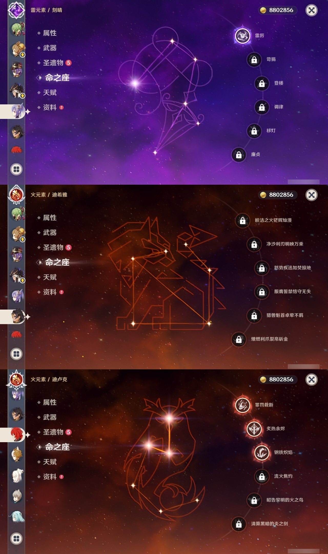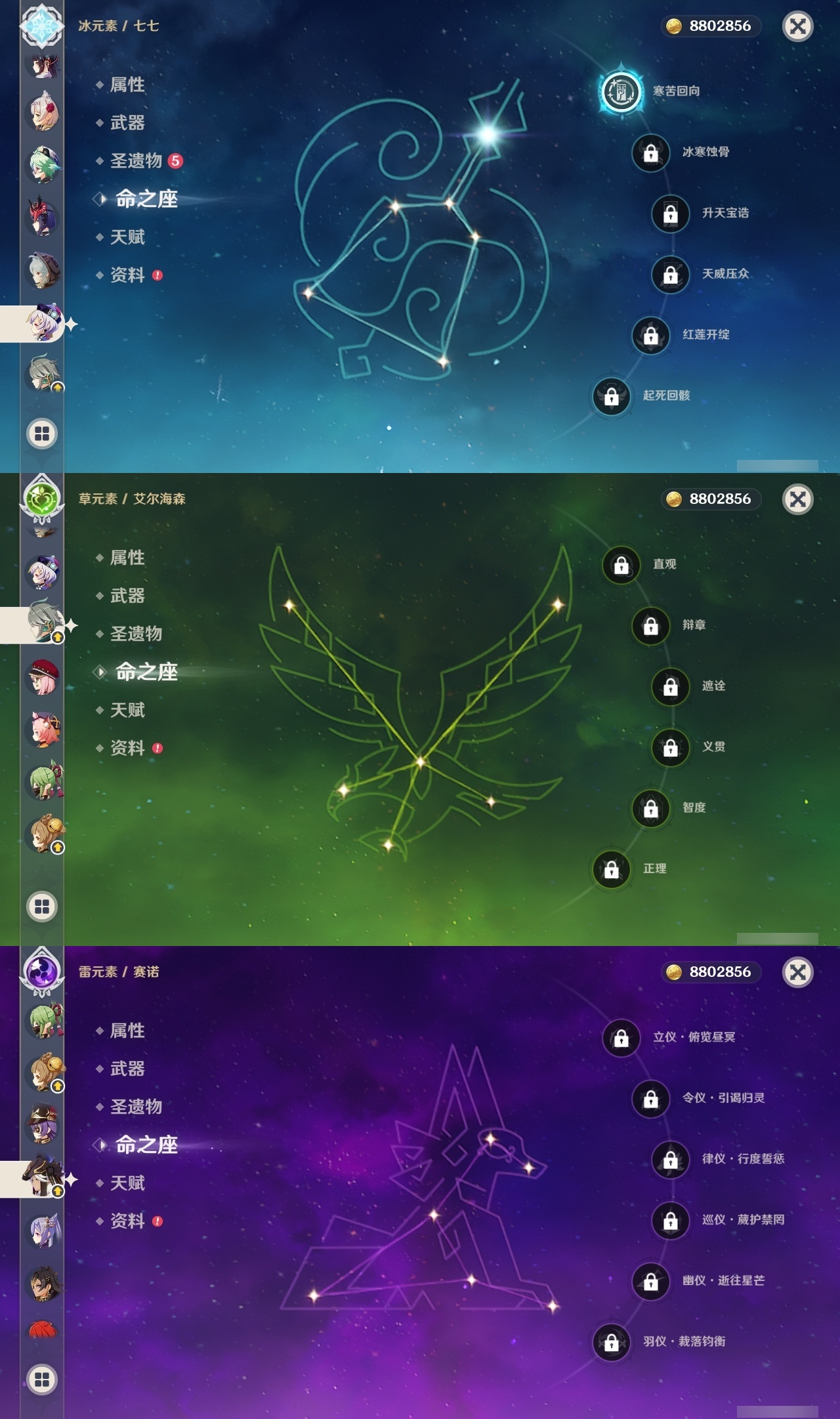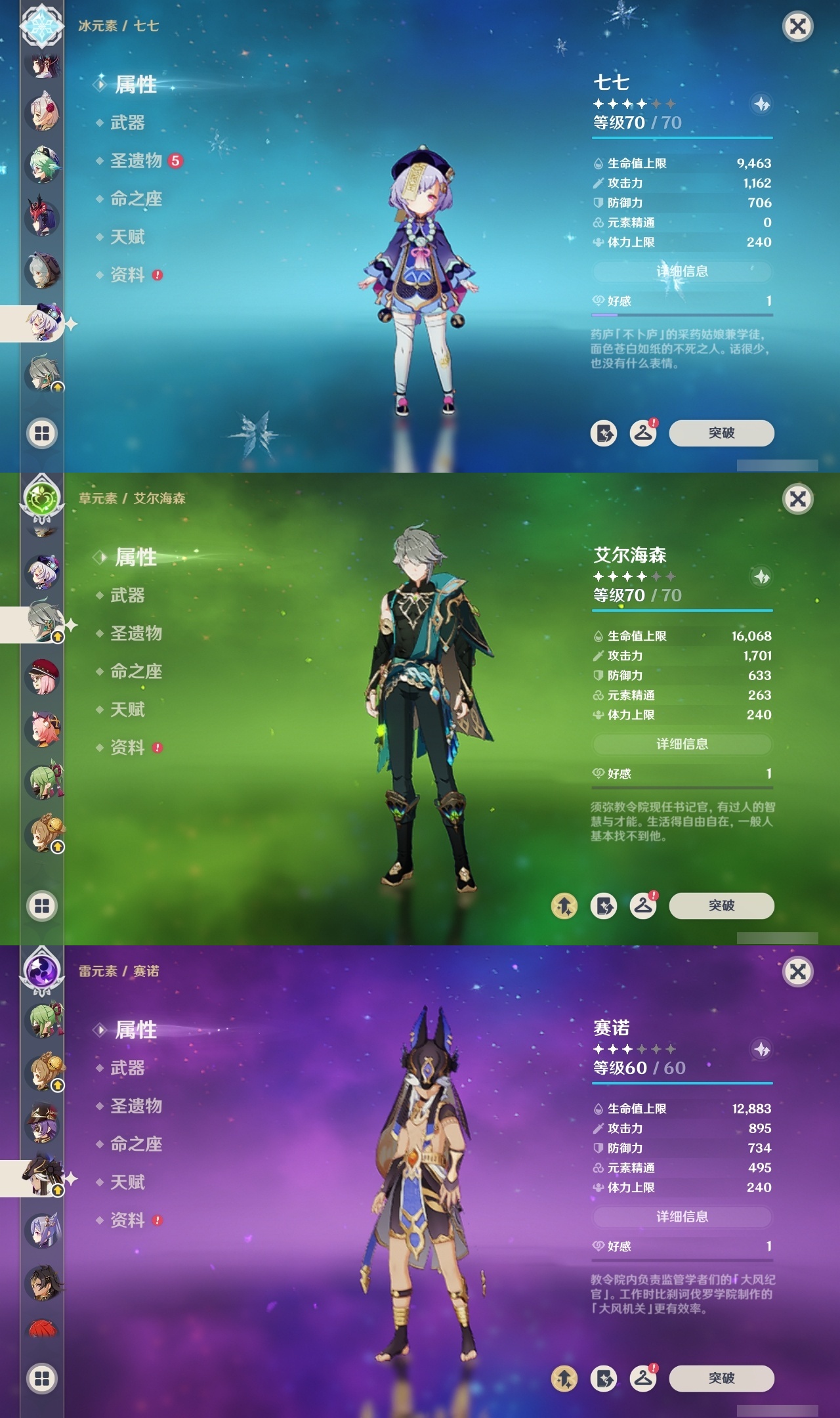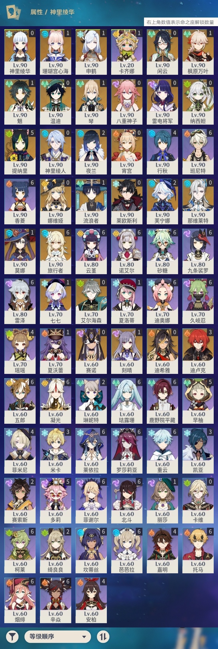 【原神】【lyys8463】冒险等级:60,五星数量:48,五星角色:提纳里 5命迪卢克 3命芙宁娜 2命夜兰 2命枫原万叶 1命魈 1命刻晴 1命莫娜 1命七七 1命琴 1命珊瑚宫心海 1命申鹤 1命流浪者 1命神里绫华温迪宵宫迪希雅八重神子神里绫人那维莱特莱欧斯利娜维娅闲云赛诺纳西妲艾尔海森雷电将军__五星武器:风鹰剑 3精金流监督静水流涌之辉图莱杜拉的回忆苍古自由之誓尘世之锁飞雷之弦振和璞鸢天空之傲天空之脊天空之卷天空之刃天空之翼无工之剑雾切之回光薙草之稻光赤角石溃杵神乐之真意波乱月白经津若水千夜浮梦__四星角色:班尼特 6命九条裟罗 6命香菱 6命久岐忍 6命鹿野院平藏 6命珐露珊 6命凝光 6命迪奥娜 6命砂糖 6命莱依拉 6命坎蒂丝 6命柯莱 6命芭芭拉 6命云堇 6命托马 6命五郎 6命烟绯 6命重云 6命辛焱 6命诺艾尔 6命罗莎莉亚 6命雷泽 6命菲谢尔 6命北斗 6命多莉 5命早柚 5命行秋 4命瑶瑶 4命菲米尼 4命嘉明 4命米卡 3命绮良良 2命琳妮特 2命赛索斯 2命卡齐娜 1命夏洛蒂 1命夏沃蕾 1命卡维