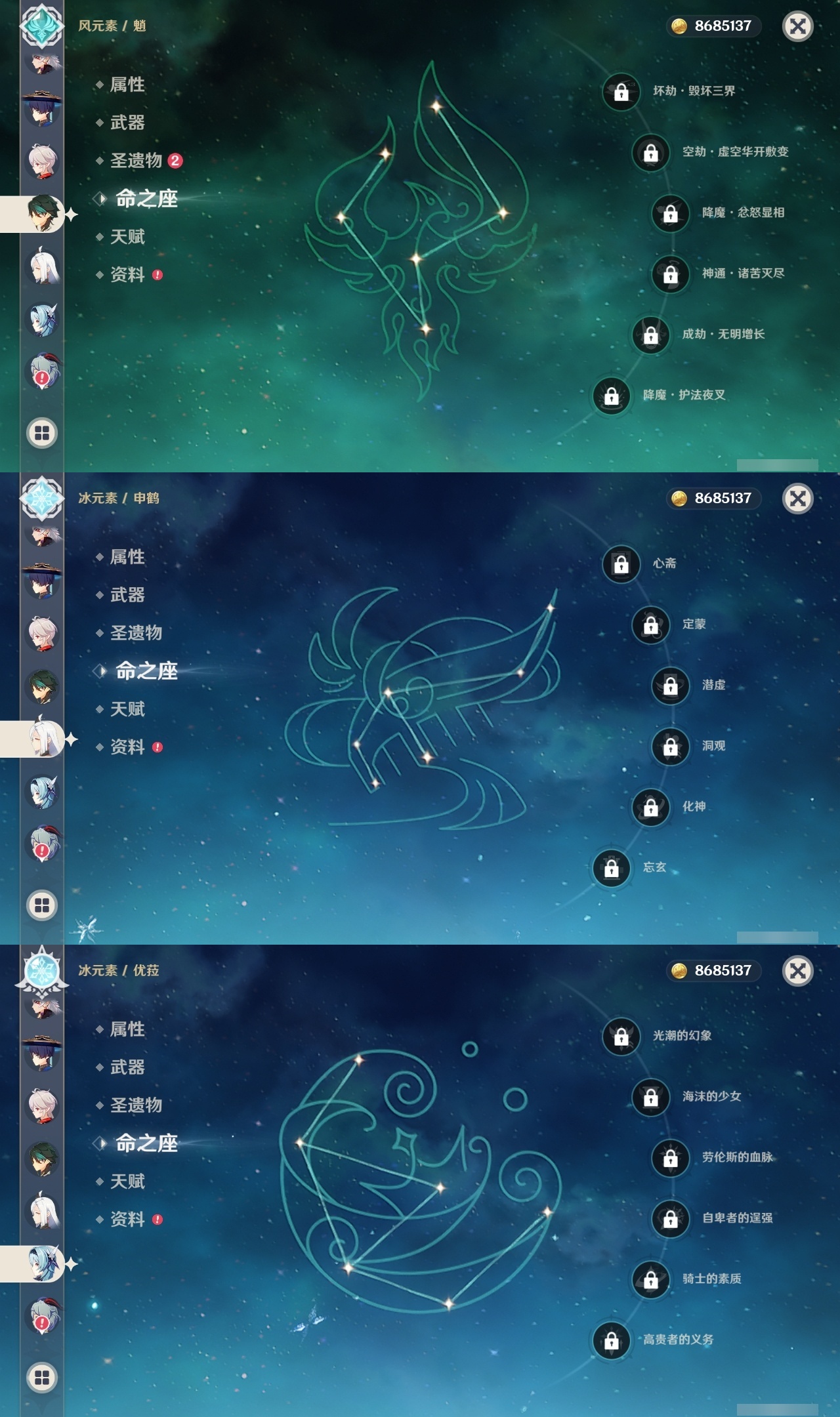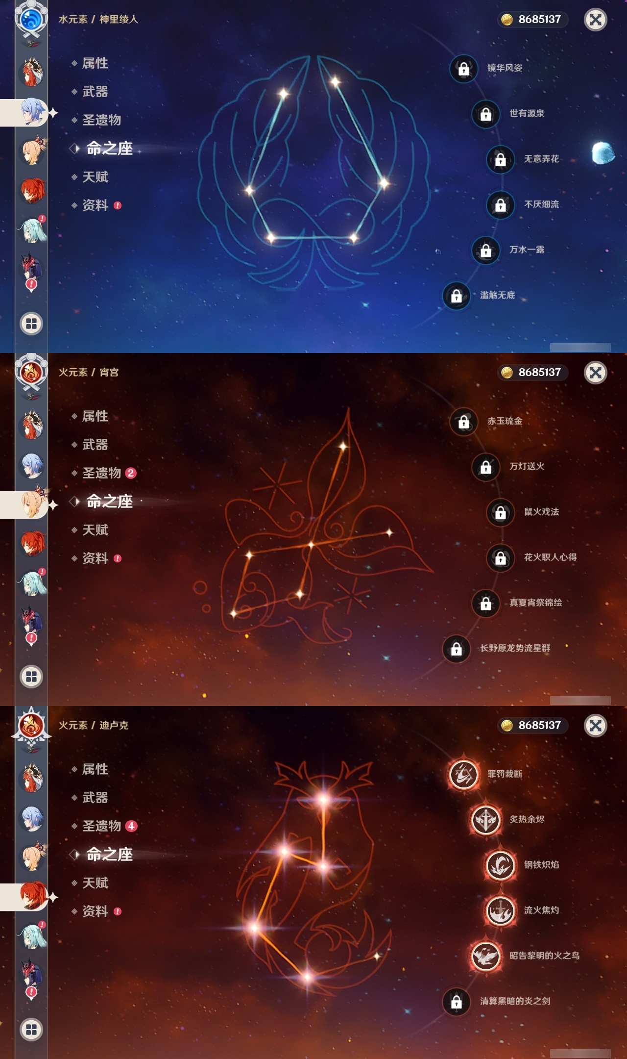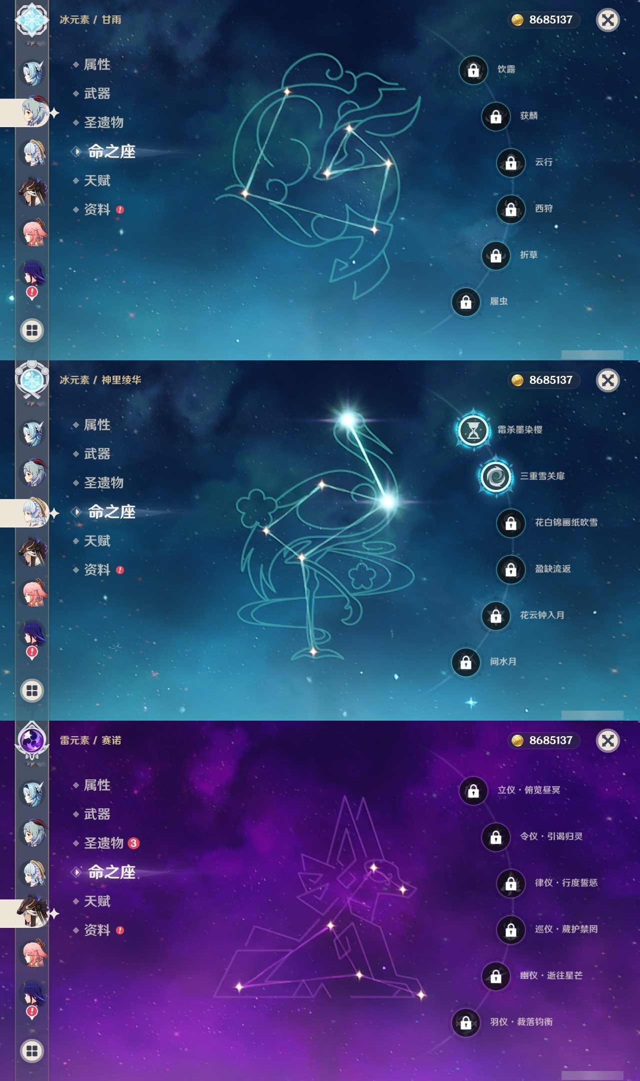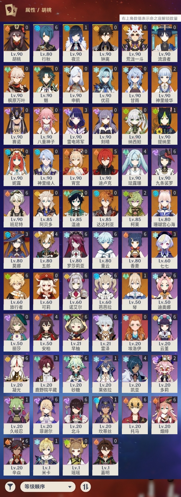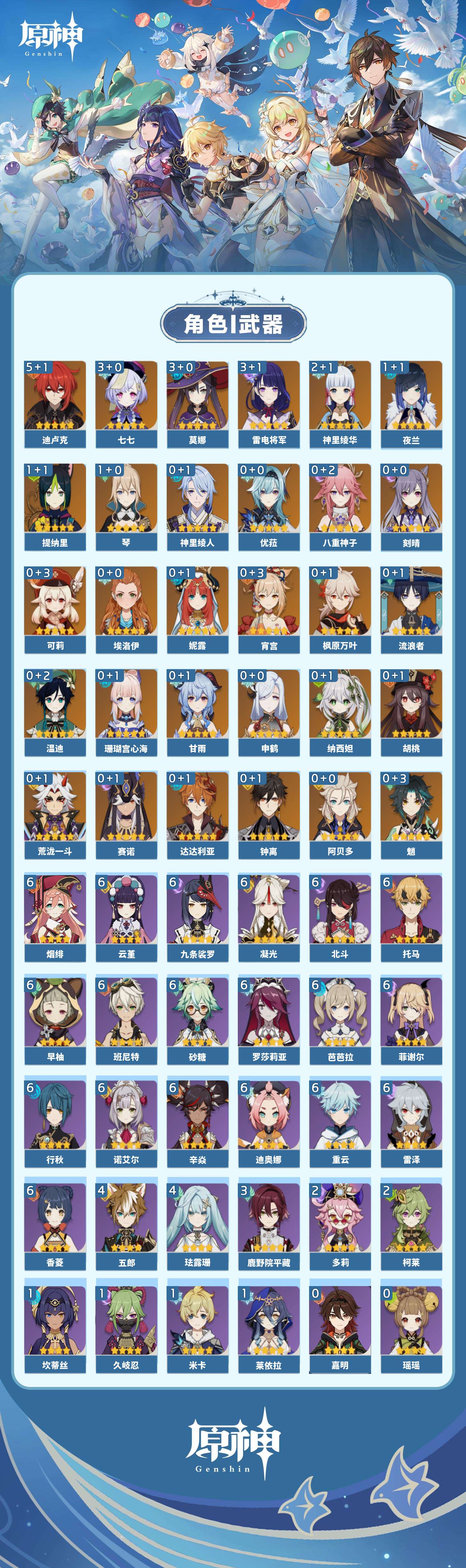 【原神】【lyys8466】冒险等级:60,五星数量:59,五星角色:迪卢克 5命雷电将军 3命莫娜 3命七七 3命神里绫华 2命琴 1命夜兰 1命提纳里 1命珊瑚宫心海温迪宵宫优菈钟离荒泷一斗达达利亚申鹤八重神子神里绫人阿贝多赛诺妮露纳西妲流浪者枫原万叶甘雨魈胡桃可莉刻晴__五星武器:飞雷之弦振 3精和璞鸢 3精四风原典 3精天空之刃 2精无工之剑 2精终末嗟叹之诗 2精神乐之真意 2精图莱杜拉的回忆阿莫斯之弓不灭月华苍古自由之誓尘世之锁护摩之杖狼的末路磐岩结绿天空之傲天空之翼雾切之回光薙草之稻光斫峰之刃赤角石溃杵冬极白星贯虹之槊波乱月白经津若水猎人之径赤沙之杖圣显之钥千夜浮梦__四星角色:班尼特 6命行秋 6命九条裟罗 6命香菱 6命凝光 6命迪奥娜 6命砂糖 6命芭芭拉 6命云堇 6命早柚 6命托马 6命烟绯 6命重云 6命辛焱 6命诺艾尔 6命罗莎莉亚 6命雷泽 6命菲谢尔 6命北斗 6命珐露珊 4命五郎 4命鹿野院平藏 3命多莉 2命柯莱 2命久岐忍 1命莱依拉 1命米卡 1命坎蒂丝 1命埃洛伊瑶瑶嘉明