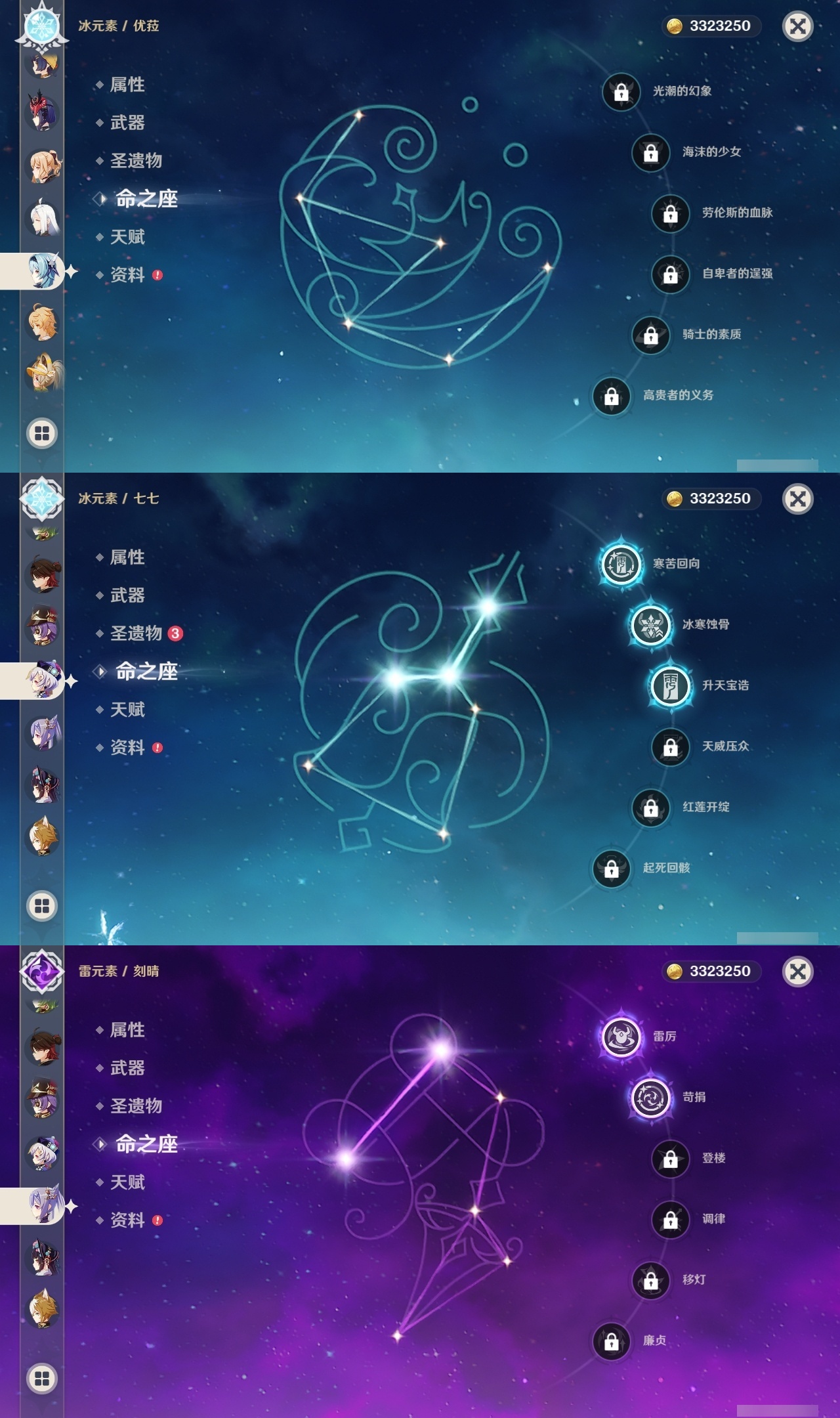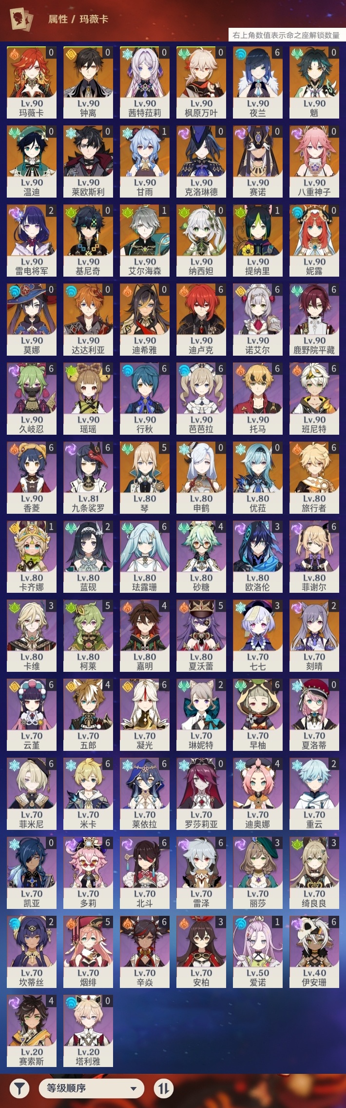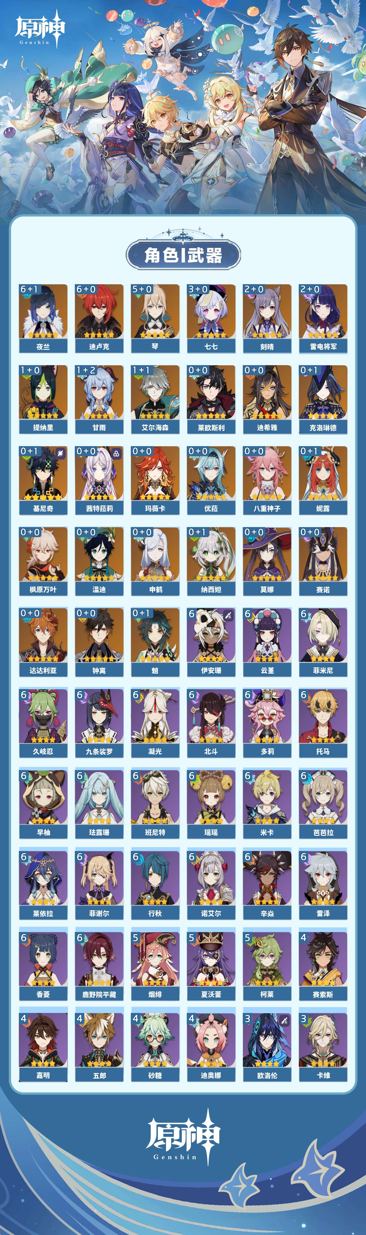 【原神】【lyys8478】冒险等级:60,五星数量:39,五星角色:迪卢克 6命夜兰 6命琴 5命七七 3命刻晴 2命雷电将军 2命甘雨 1命提纳里 1命艾尔海森 1命莫娜基尼奇温迪玛薇卡茜特菈莉优菈迪希雅钟离达达利亚申鹤八重神子莱欧斯利赛诺妮露纳西妲枫原万叶魈克洛琳德__五星武器:阿莫斯之弓 2精山王长牙鹤鸣余音裁叶萃光和璞鸢四风原典天空之傲天空之脊若水圣显之钥千夜浮梦赦罪__四星角色:班尼特 6命行秋 6命九条裟罗 6命香菱 6命久岐忍 6命鹿野院平藏 6命珐露珊 6命凝光 6命瑶瑶 6命莱依拉 6命米卡 6命多莉 6命芭芭拉 6命云堇 6命早柚 6命托马 6命辛焱 6命诺艾尔 6命雷泽 6命菲谢尔 6命北斗 6命菲米尼 6命伊安珊 6命柯莱 5命烟绯 5命夏沃蕾 5命迪奥娜 4命砂糖 4命五郎 4命嘉明 4命赛索斯 4命绮良良 3命卡维 3命欧洛伦 3命坎蒂丝 2命蓝砚 2命重云 2命琳妮特 2命卡齐娜 1命爱诺 1命罗莎莉亚夏洛蒂塔利雅