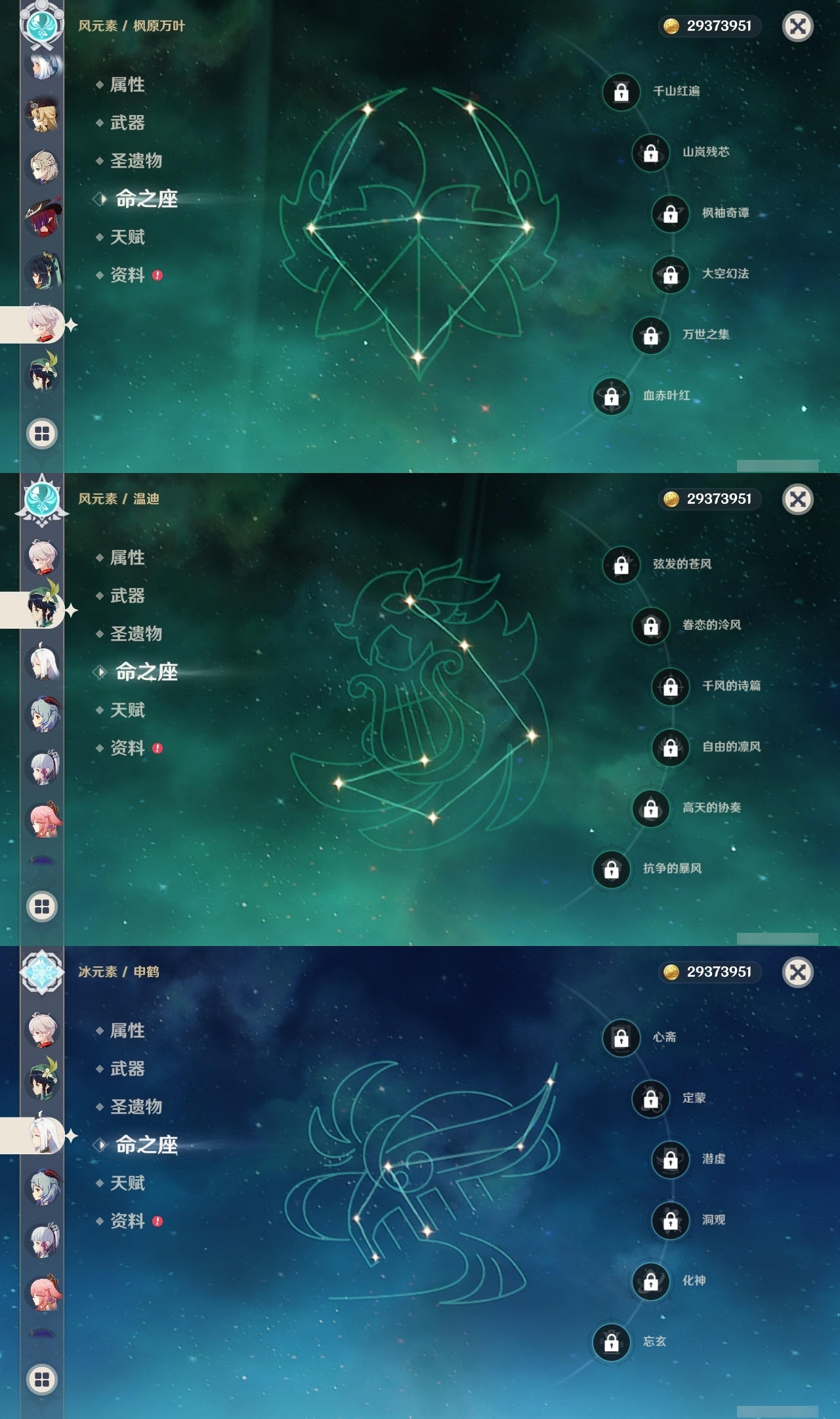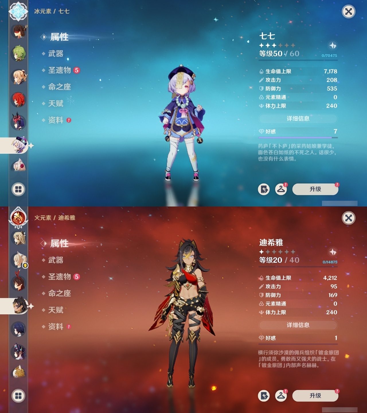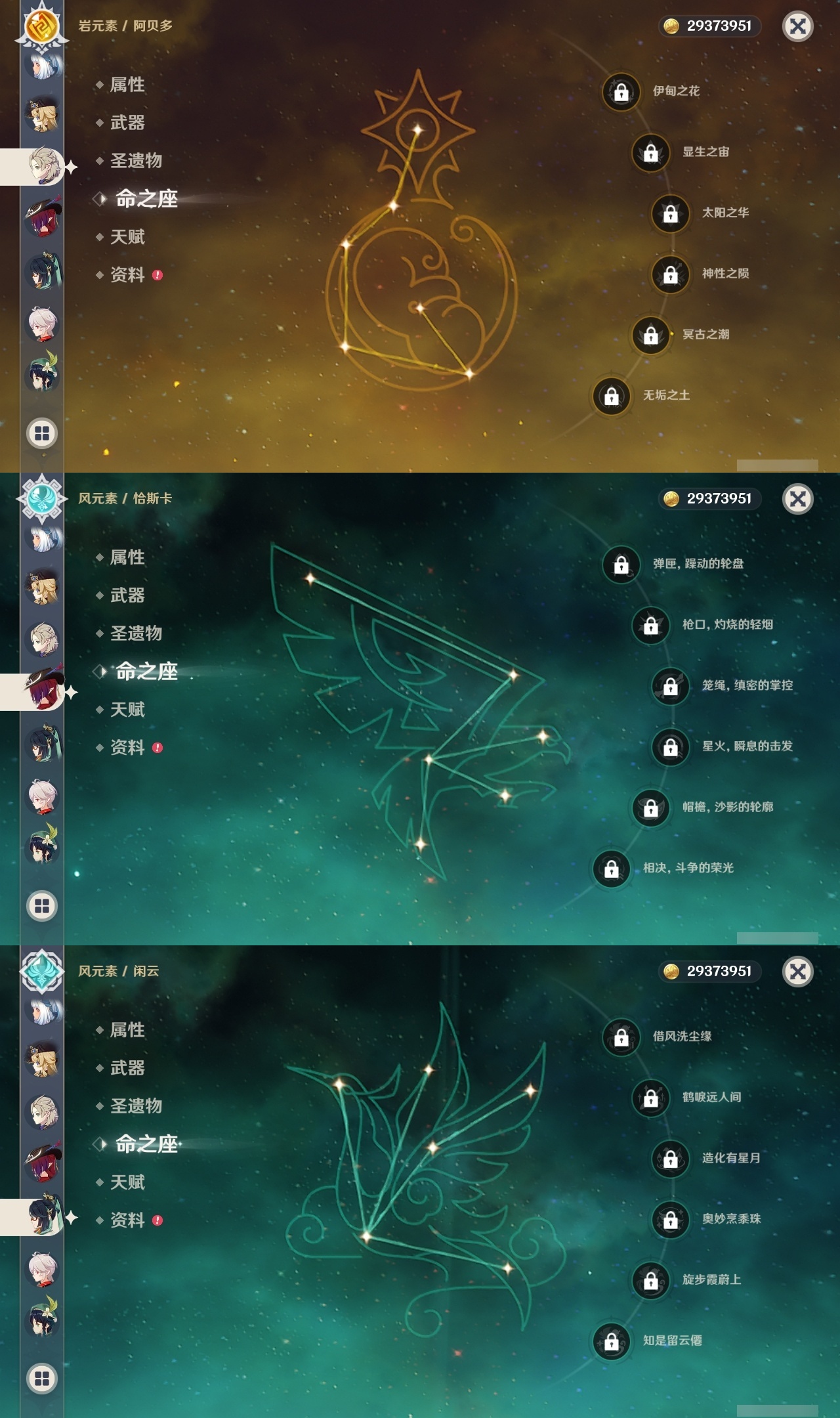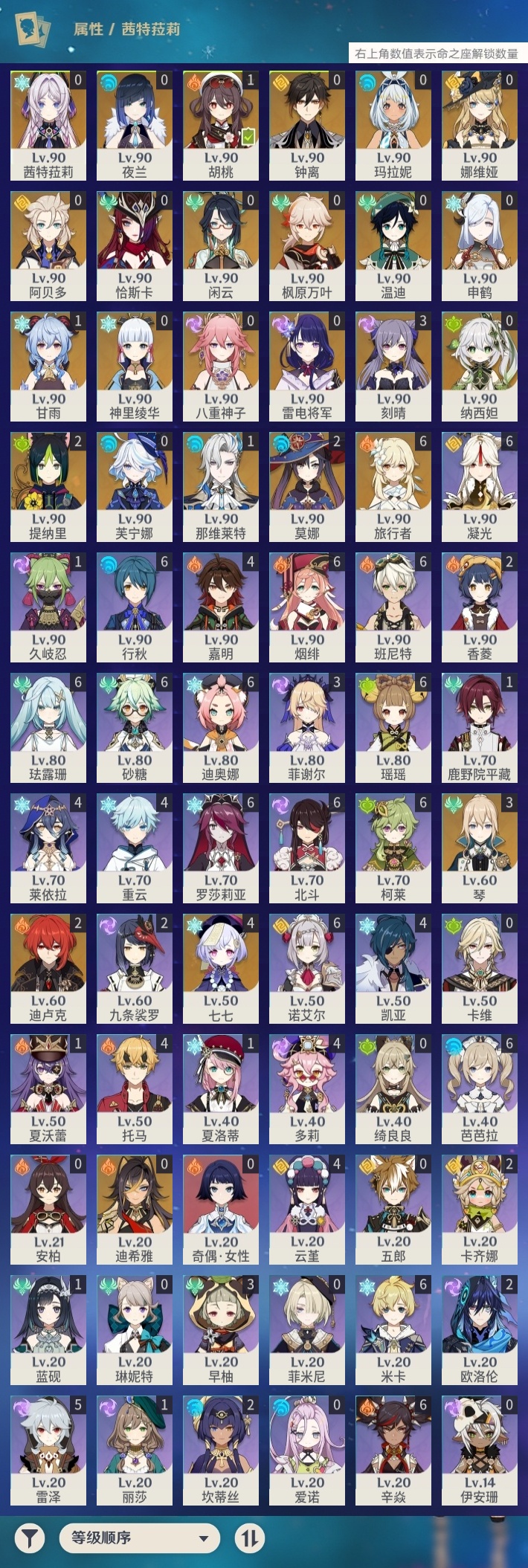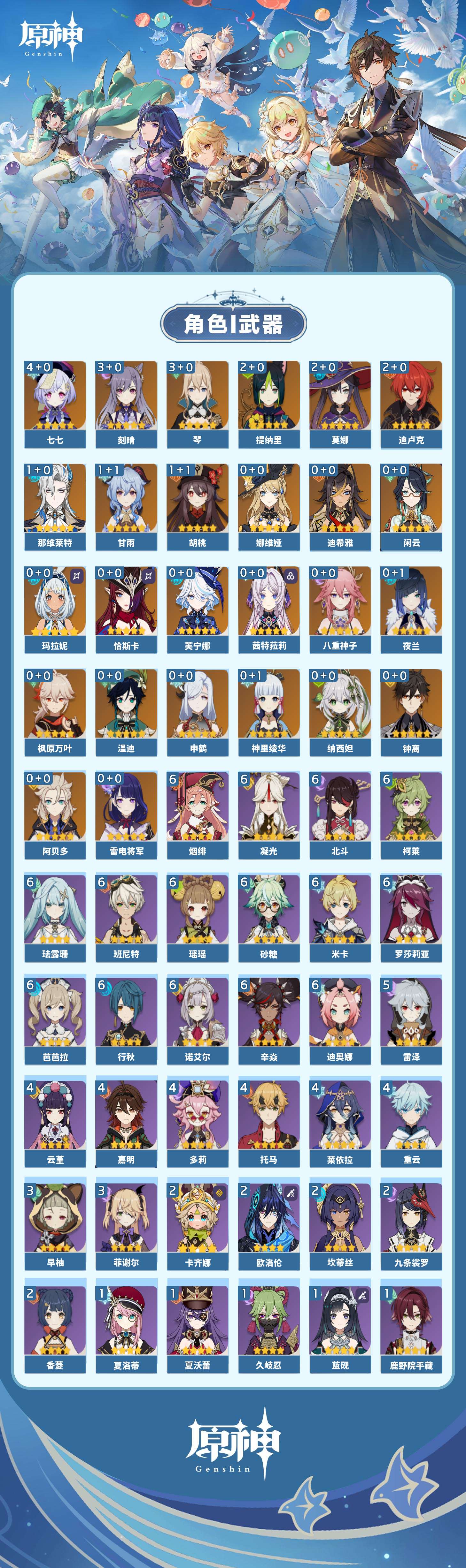 【原神】【lyys8488】冒险等级:60,五星数量:36,五星角色:七七 4命刻晴 3命琴 3命迪卢克 2命莫娜 2命提纳里 2命那维莱特 1命甘雨 1命胡桃 1命玛拉妮神里绫华温迪恰斯卡茜特菈莉迪希雅钟离申鹤八重神子阿贝多夜兰芙宁娜娜维娅闲云纳西妲枫原万叶雷电将军__五星武器:天空之脊 2精最初的大魔术阿莫斯之弓护摩之杖四风原典天空之卷天空之翼雾切之回光若水__四星角色:班尼特 6命行秋 6命珐露珊 6命凝光 6命迪奥娜 6命砂糖 6命瑶瑶 6命米卡 6命柯莱 6命芭芭拉 6命烟绯 6命辛焱 6命诺艾尔 6命罗莎莉亚 6命北斗 6命雷泽 5命莱依拉 4命多莉 4命云堇 4命托马 4命重云 4命嘉明 4命早柚 3命菲谢尔 3命卡齐娜 2命九条裟罗 2命香菱 2命坎蒂丝 2命欧洛伦 2命久岐忍 1命鹿野院平藏 1命蓝砚 1命夏洛蒂 1命夏沃蕾 1命奇偶·女性绮良良卡维五郎菲米尼琳妮特伊安珊爱诺