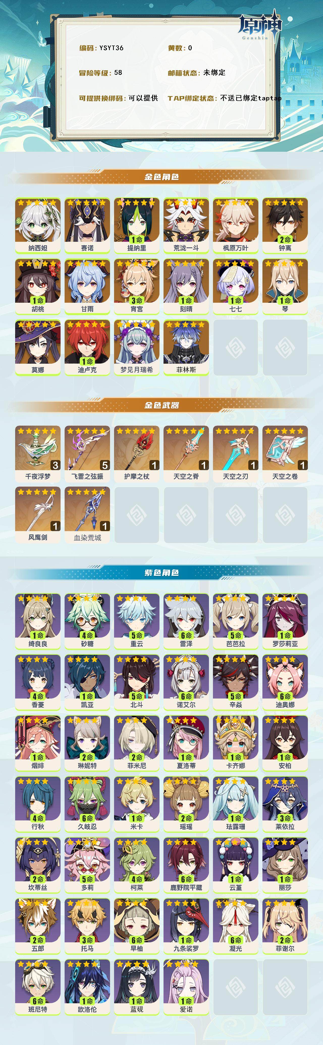 【ysyt36】58级/女主/17个五星角色/0命菲林斯/0命梦见月瑞希/0命纳西妲/0命赛诺/1命提纳里/0命荒泷一斗/3命宵宫/0命枫原万叶/1命胡桃/0命甘雨/2命钟离/1命琴/1命刻晴/1命迪卢克/0命莫娜/1命七七/精1血染荒城/精3千夜浮梦/精5飞雷之弦振/精1护摩之杖/精1天空之卷/精1风鹰剑/精1天空之脊/精1天空之刃/1命爱诺/1命蓝砚/0命欧洛伦/0命卡齐娜/1命夏洛蒂/2命菲米尼/2命琳妮特/1命绮良良/1命米卡/2命瑶瑶/1命珐露珊/3命莱依拉/2命坎蒂丝/5命多莉/4命柯莱/满命鹿野院平藏/满命久岐忍/1命云堇/2命五郎/3命托马/0命九条裟罗/满命早柚/1命烟绯/1命罗莎莉亚/5命辛焱/满命迪奥娜/4命砂糖/满命雷泽/2命菲谢尔/0命丽莎/5命北斗/4命香菱/0命安柏/满命班尼特/4命行秋/5命芭芭拉/满命凝光/满命诺艾尔/0命凯亚/5命重云