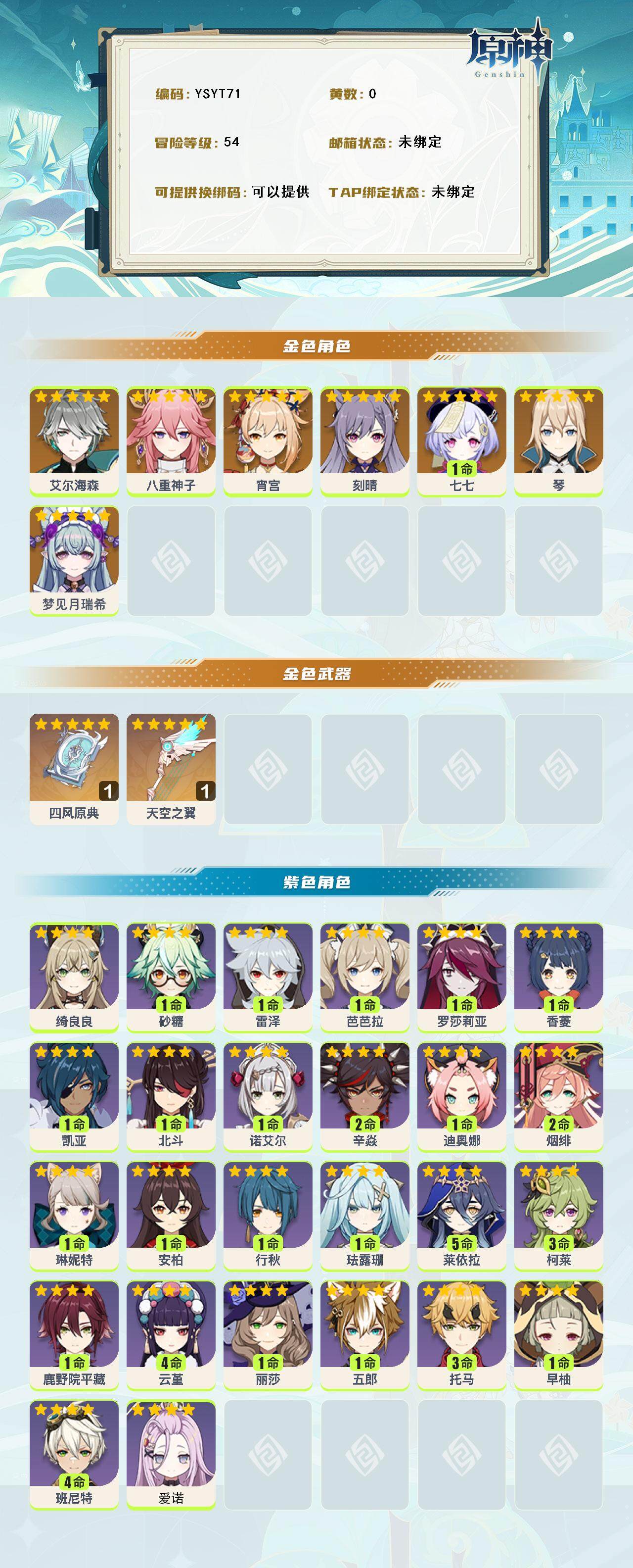 【ysyt71】54级/男主/8个五星角色/0命梦见月瑞希/0命艾尔海森/0命八重神子/0命宵宫/0命琴/0命刻晴/1命七七/精1四风原典/精1天空之翼/0命爱诺/0命琳妮特/0命绮良良/0命珐露珊/5命莱依拉/3命柯莱/0命鹿野院平藏/4命云堇/1命五郎/3命托马/0命早柚/2命烟绯/1命罗莎莉亚/2命辛焱/1命迪奥娜/0命砂糖/0命雷泽/0命丽莎/1命北斗/1命香菱/0命安柏/4命班尼特/1命行秋/1命芭芭拉/0命诺艾尔/1命凯亚