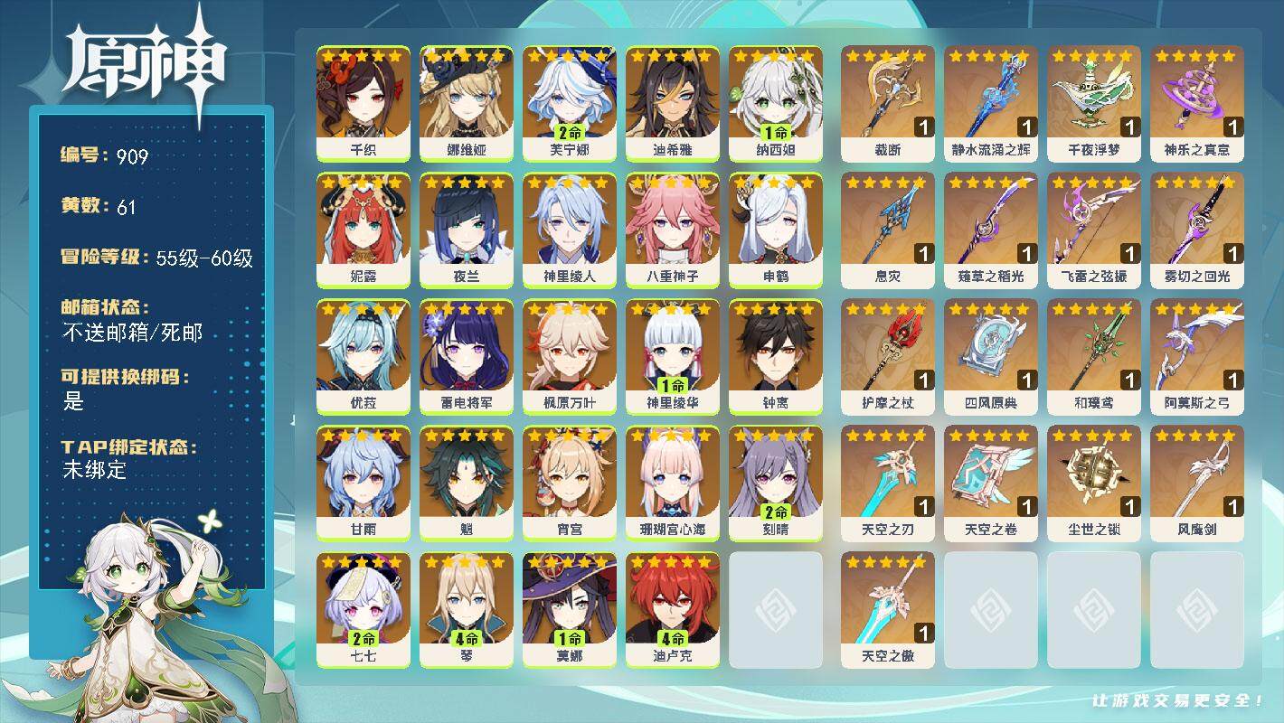 [14166644]60级/61黄/女主/24个五星角色/20个五星武器 0命千织0命娜维娅2命芙宁娜0命迪希雅1命纳西妲0命妮露0命夜兰0命神里绫人0命八重神子0命申鹤0命优菈0命雷电将军0命枫原万叶1命神里绫华0命钟离0命甘雨0命魈0命宵宫0命珊瑚宫心海2命刻晴2命七七4命琴1命莫娜4命迪卢克精1裁断精1静水流涌之辉精1千夜浮梦精1神乐之真意精1息灾精1薙草之稻光精1飞雷之弦振精1雾切之回光精1护摩之杖精1四风原典精1和璞鸢精1阿莫斯之弓精1天空之刃精1天空之卷精1尘世之锁精1风鹰剑精1天空之傲