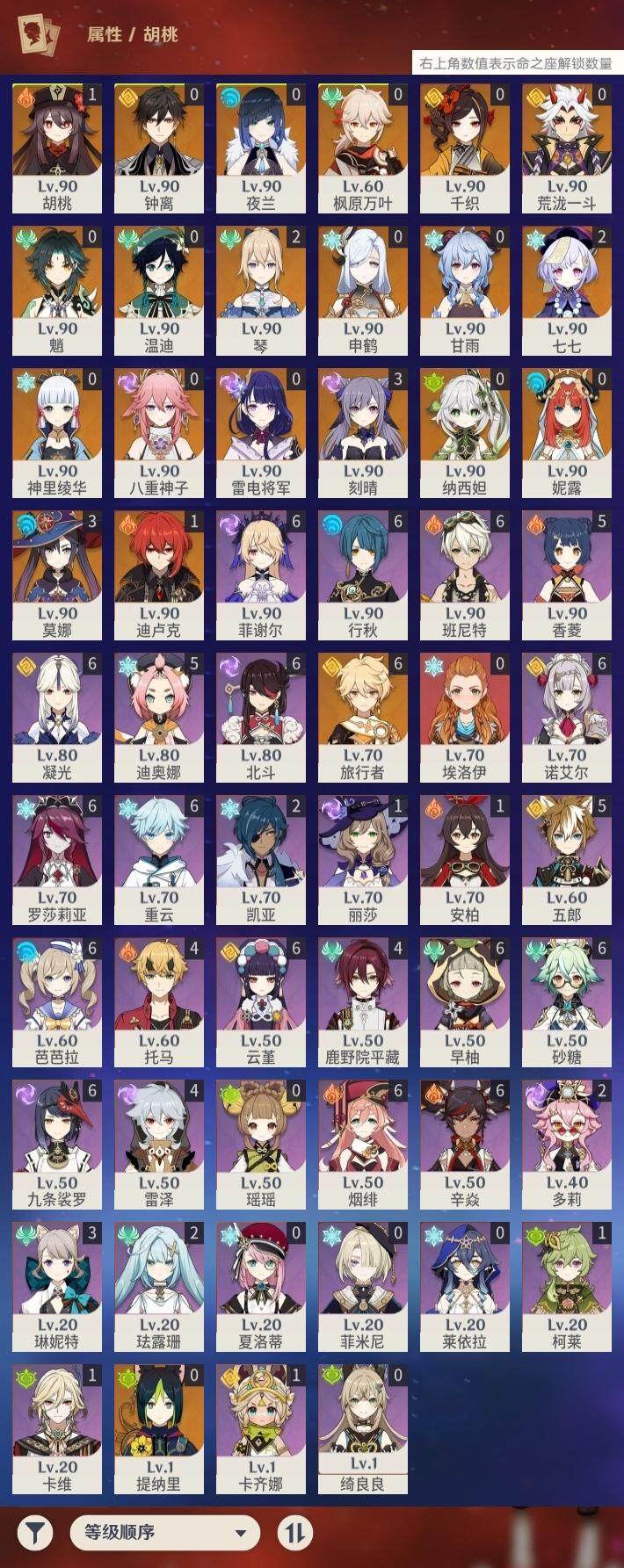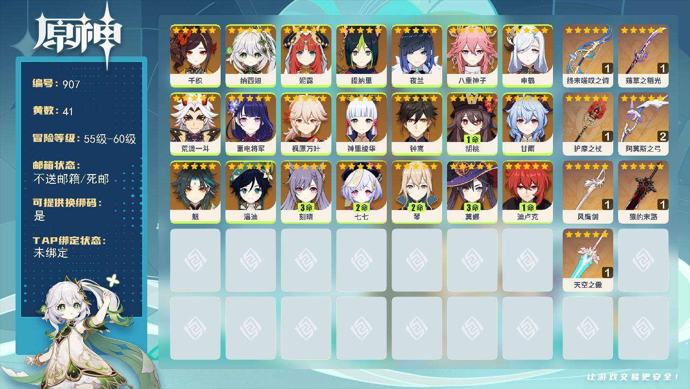 [14166683]60级/41黄/男主/21个五星角色/7个五星武器 0命千织0命纳西妲0命妮露0命提纳里0命夜兰0命八重神子0命申鹤0命荒泷一斗0命雷电将军0命枫原万叶0命神里绫华0命钟离1命胡桃0命甘雨0命魈0命温迪3命刻晴2命七七2命琴3命莫娜1命迪卢克精1终末嗟叹之诗精1薙草之稻光精1护摩之杖精2阿莫斯之弓精1风鹰剑精1狼的末路精1天空之傲