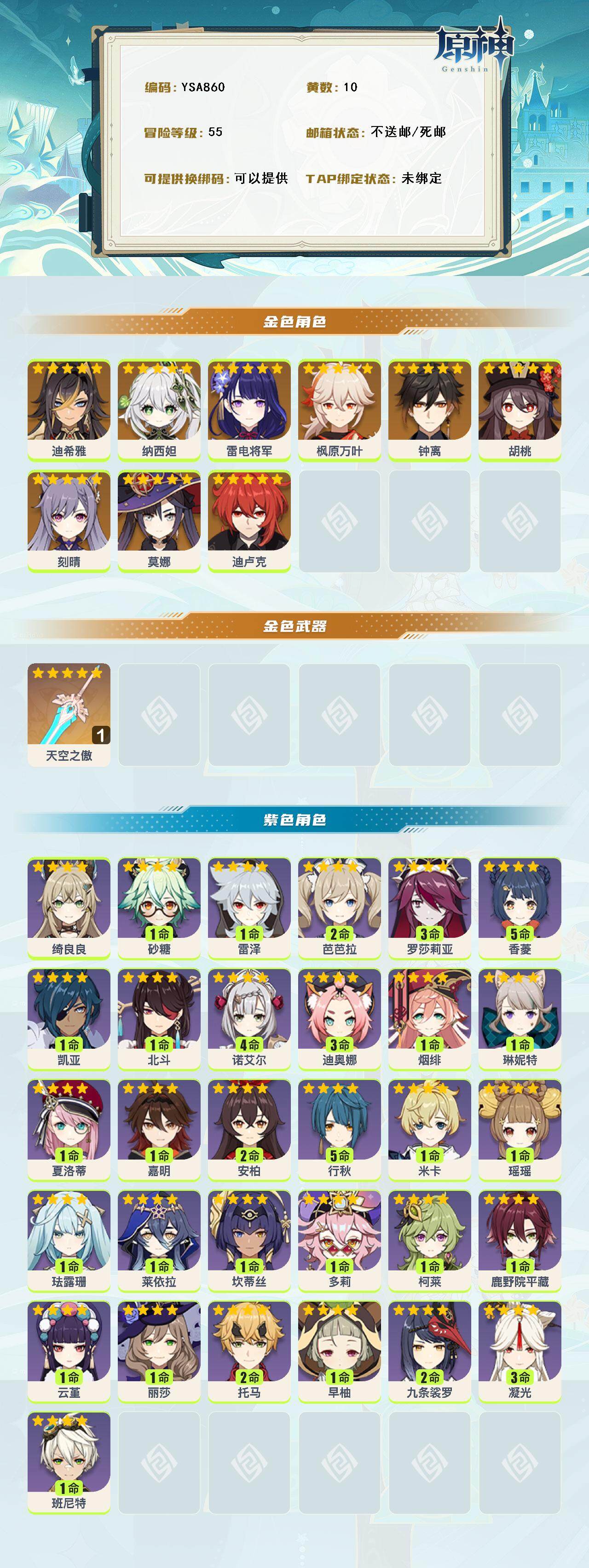 【ysa860】55级/10黄/女主/9个五星角色/1个五星武器/0命迪希雅/0命纳西妲/0命雷电将军/0命枫原万叶/0命胡桃/0命钟离/0命刻晴/0命迪卢克/0命莫娜/精1天空之傲/0命嘉明/0命夏洛蒂/0命琳妮特/0命绮良良/1命米卡/1命瑶瑶/1命珐露珊/1命莱依拉/0命坎蒂丝/1命多莉/0命柯莱/1命鹿野院平藏/0命云堇/2命托马/2命九条裟罗/1命早柚/1命烟绯/3命罗莎莉亚/3命迪奥娜/1命砂糖/0命雷泽/0命丽莎/1命北斗/5命香菱/2命安柏/0命班尼特/5命行秋/2命芭芭拉/3命凝光/4命诺艾尔/0命凯亚