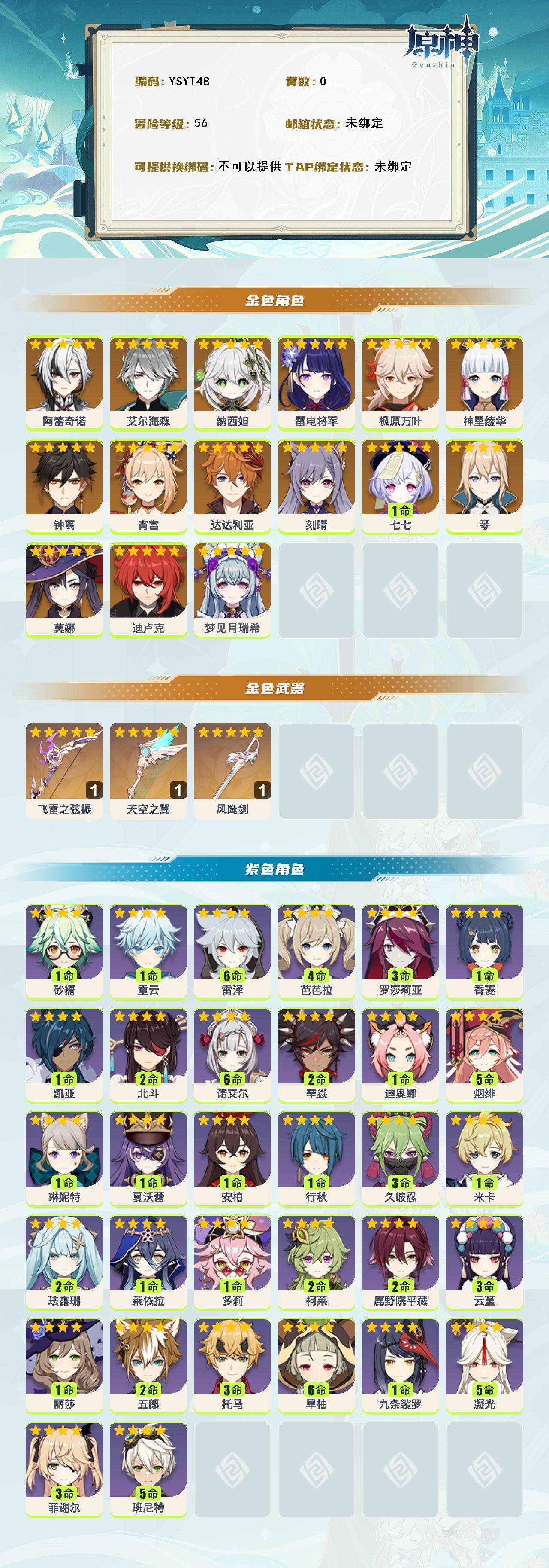【ysyt48】56级/女主/16个五星角色/0命梦见月瑞希/0命阿蕾奇诺/0命艾尔海森/0命纳西妲/0命雷电将军/0命宵宫/0命神里绫华/0命枫原万叶/0命钟离/0命达达利亚/0命琴/0命刻晴/0命迪卢克/0命莫娜/1命七七/精1飞雷之弦振/精1风鹰剑/精1天空之翼/0命夏沃蕾/0命琳妮特/0命米卡/2命珐露珊/1命莱依拉/1命多莉/2命柯莱/2命鹿野院平藏/3命久岐忍/3命云堇/2命五郎/3命托马/0命九条裟罗/满命早柚/5命烟绯/3命罗莎莉亚/2命辛焱/0命迪奥娜/1命砂糖/满命雷泽/3命菲谢尔/0命丽莎/2命北斗/0命香菱/0命安柏/5命班尼特/1命行秋/4命芭芭拉/5命凝光/满命诺艾尔/0命凯亚/1命重云