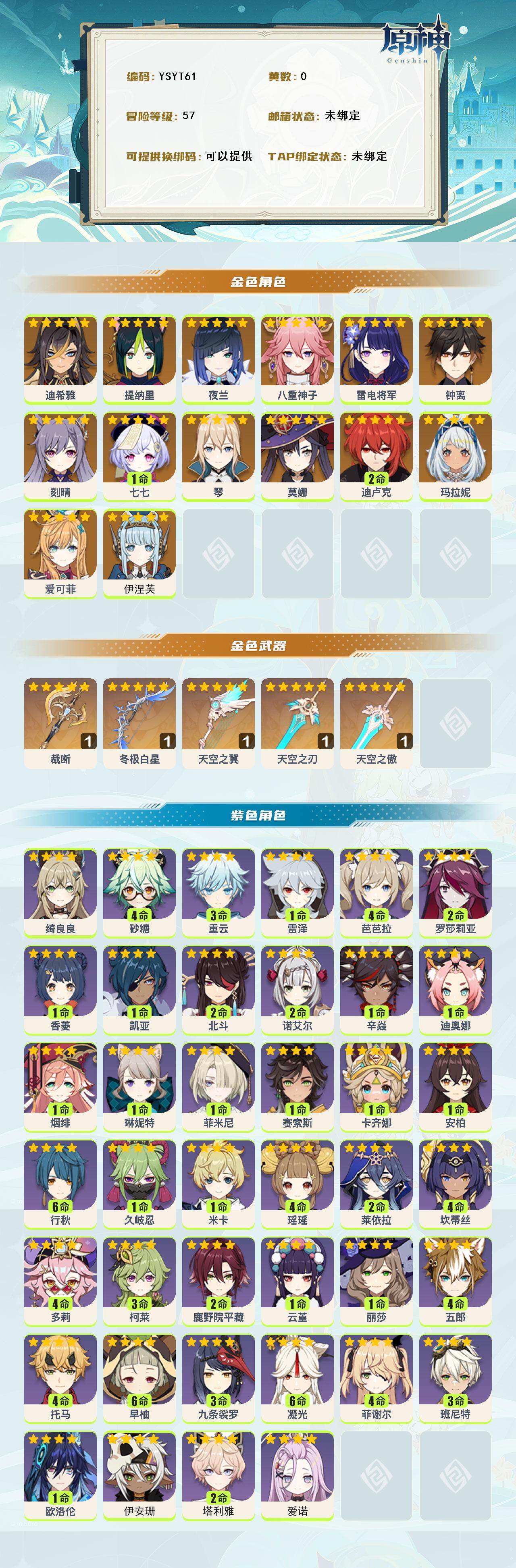 【ysyt61】57级/女主/17个五星角色/0命伊涅芙/0命爱可菲/0命玛拉妮/0命迪希雅/0命提纳里/0命夜兰/0命八重神子/0命雷电将军/0命钟离/0命琴/0命刻晴/2命迪卢克/0命莫娜/1命七七/精1裁断/精1冬极白星/精1天空之傲/精1天空之刃/精1天空之翼/0命爱诺/2命塔利雅/0命伊安珊/1命欧洛伦/1命卡齐娜/0命赛索斯/1命菲米尼/0命琳妮特/0命绮良良/1命米卡/4命瑶瑶/2命莱依拉/4命坎蒂丝/4命多莉/3命柯莱/2命鹿野院平藏/0命久岐忍/1命云堇/4命五郎/4命托马/3命九条裟罗/满命早柚/1命烟绯/2命罗莎莉亚/1命辛焱/1命迪奥娜/4命砂糖/1命雷泽/4命菲谢尔/1命丽莎/2命北斗/0命香菱/0命安柏/3命班尼特/满命行秋/4命芭芭拉/满命凝光/2命诺艾尔/1命凯亚/3命重云