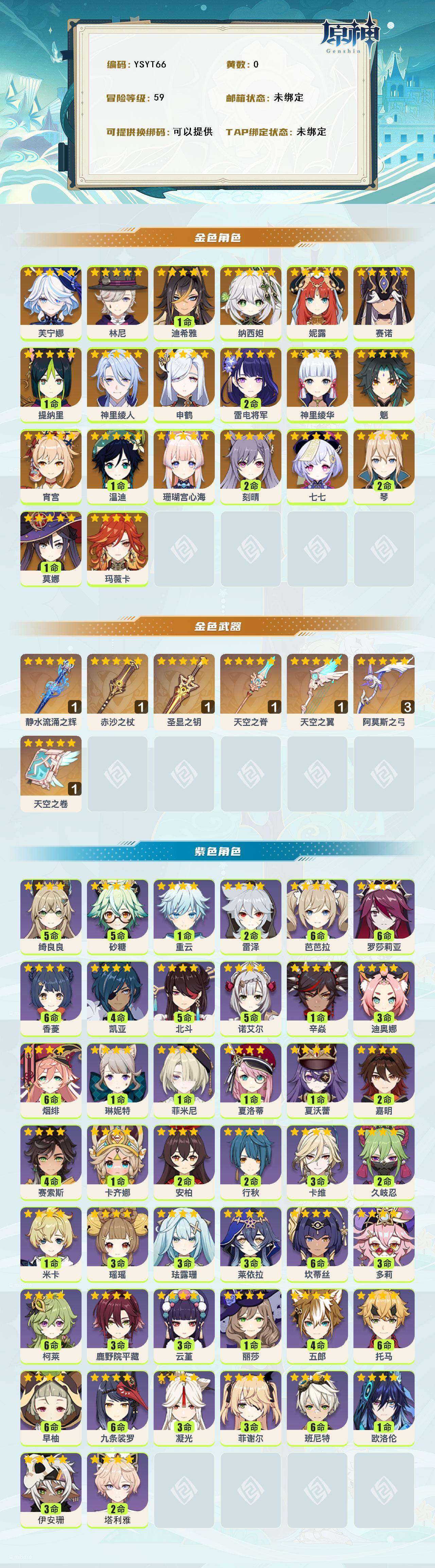 【ysyt66】59级/男主/21个五星角色/0命玛薇卡/0命芙宁娜/0命林尼/1命迪希雅/0命纳西妲/0命妮露/0命赛诺/1命提纳里/0命神里绫人/0命申鹤/0命珊瑚宫心海/2命雷电将军/0命宵宫/0命神里绫华/0命魈/1命温迪/2命琴/2命刻晴/1命莫娜/0命七七/精1静水流涌之辉/精1圣显之钥/精1赤沙之杖/精1天空之卷/精3阿莫斯之弓/精1天空之脊/精1天空之翼/2命塔利雅/3命伊安珊/0命欧洛伦/0命卡齐娜/4命赛索斯/2命嘉明/1命夏沃蕾/1命夏洛蒂/0命菲米尼/1命琳妮特/5命绮良良/3命卡维/0命米卡/3命瑶瑶/3命珐露珊/3命莱依拉/满命坎蒂丝/3命多莉/满命柯莱/3命鹿野院平藏/2命久岐忍/3命云堇/4命五郎/满命托马/满命九条裟罗/满命早柚/满命烟绯/满命罗莎莉亚/0命辛焱/3命迪奥娜/5命砂糖/2命雷泽/3命菲谢尔/1命丽莎/5命北斗/满命香菱/2命安柏/满命班尼特/2命行秋/满命芭芭拉/3命凝光/5命诺艾尔/4命凯亚/0命重云