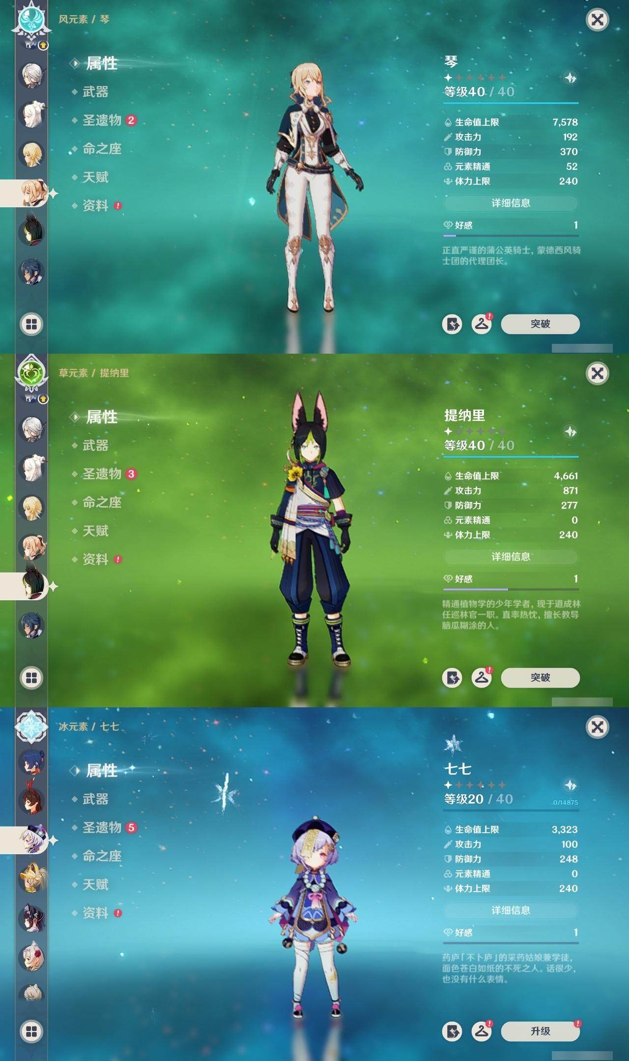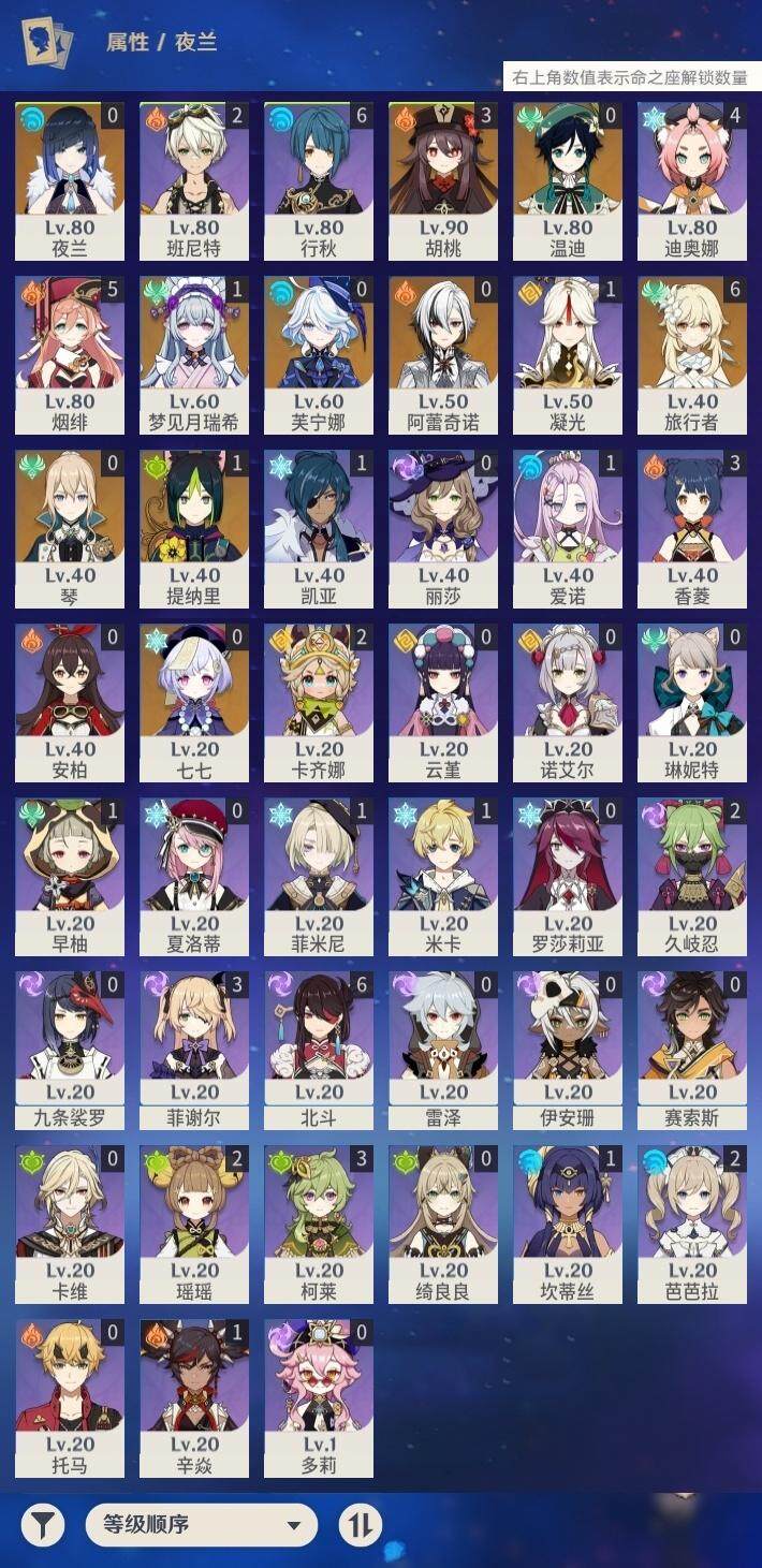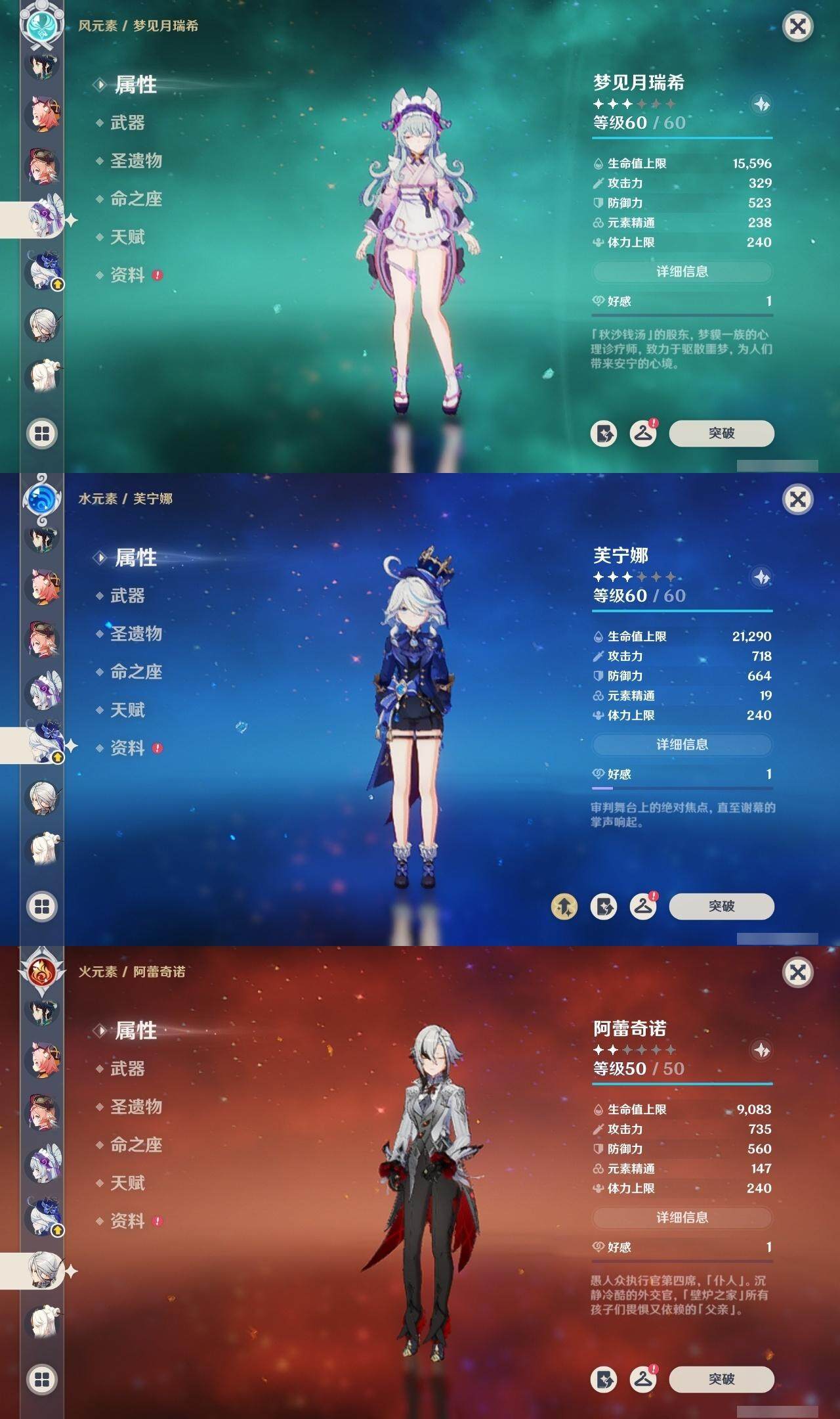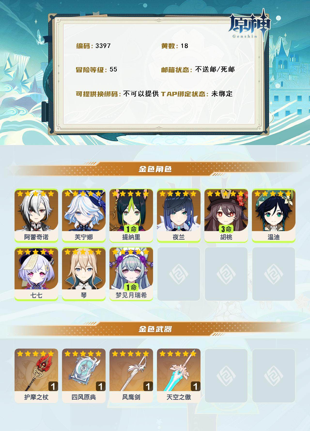 55级/18黄/女主/9个五星角色/4个五星武器 0命阿蕾奇诺0命芙宁娜1命提纳里0命夜兰3命胡桃0命温迪0命七七0命琴1命梦见月瑞希精1护摩之杖精1四风原典精1风鹰剑精1天空之傲