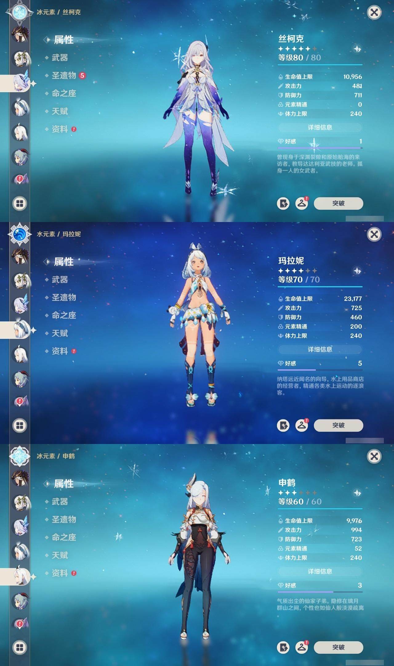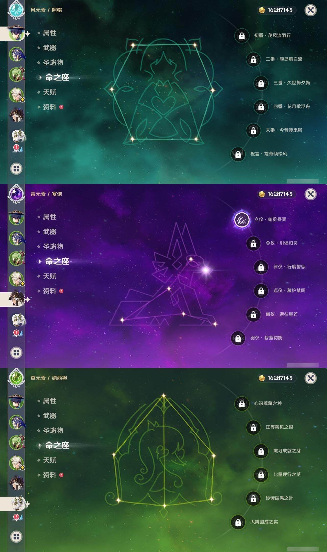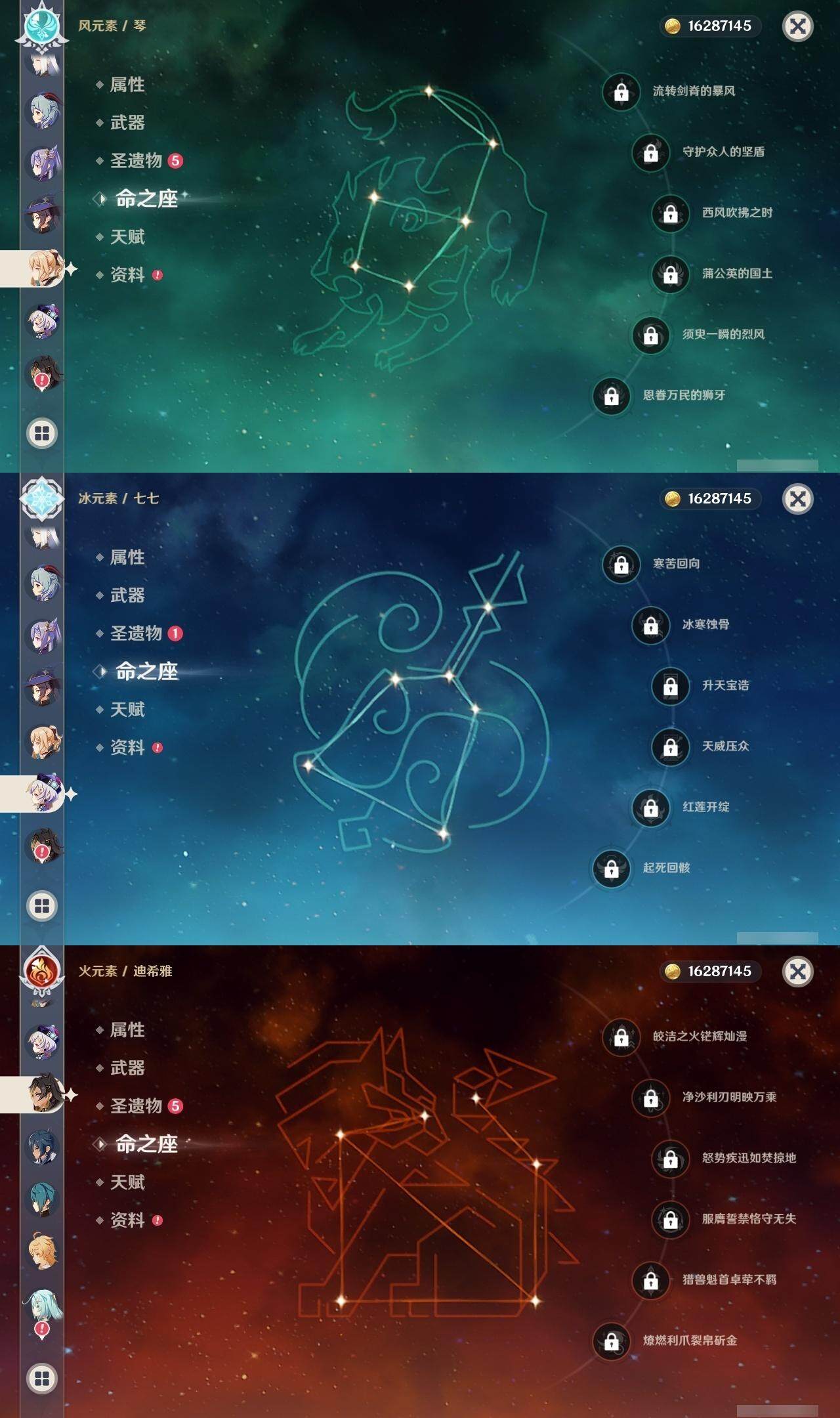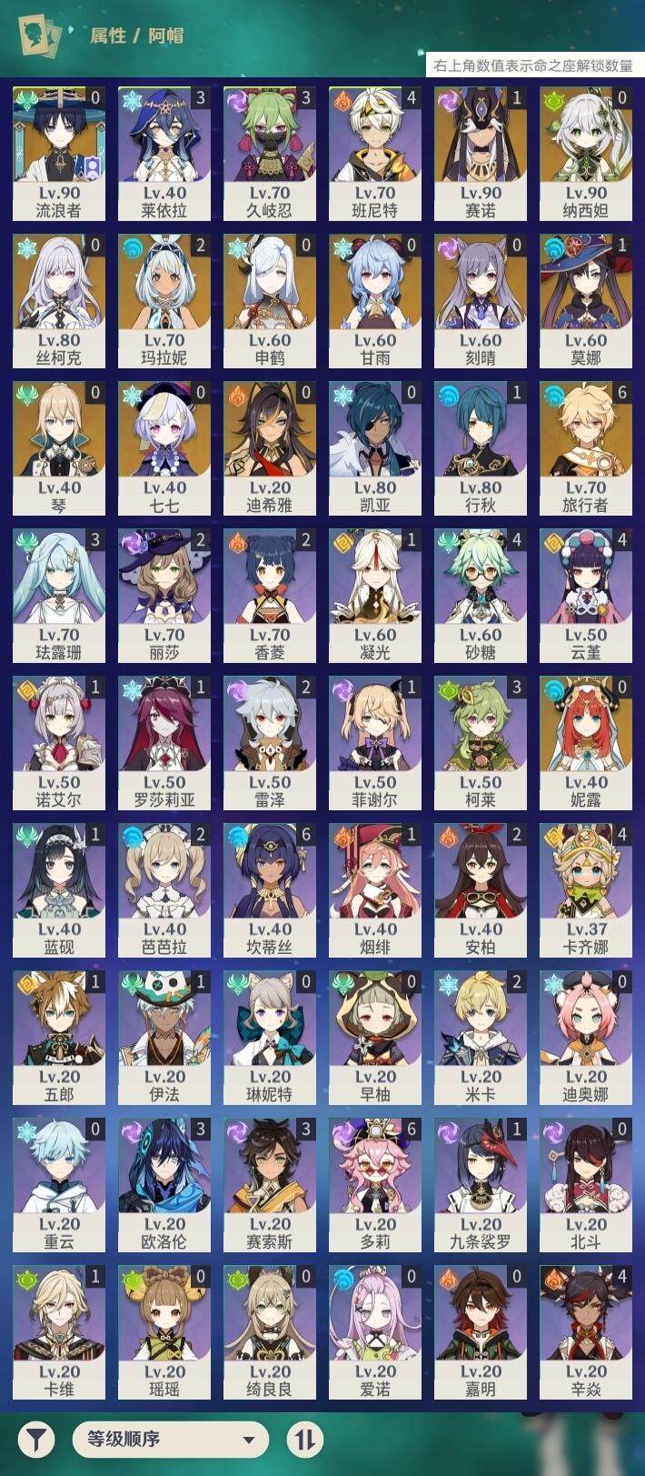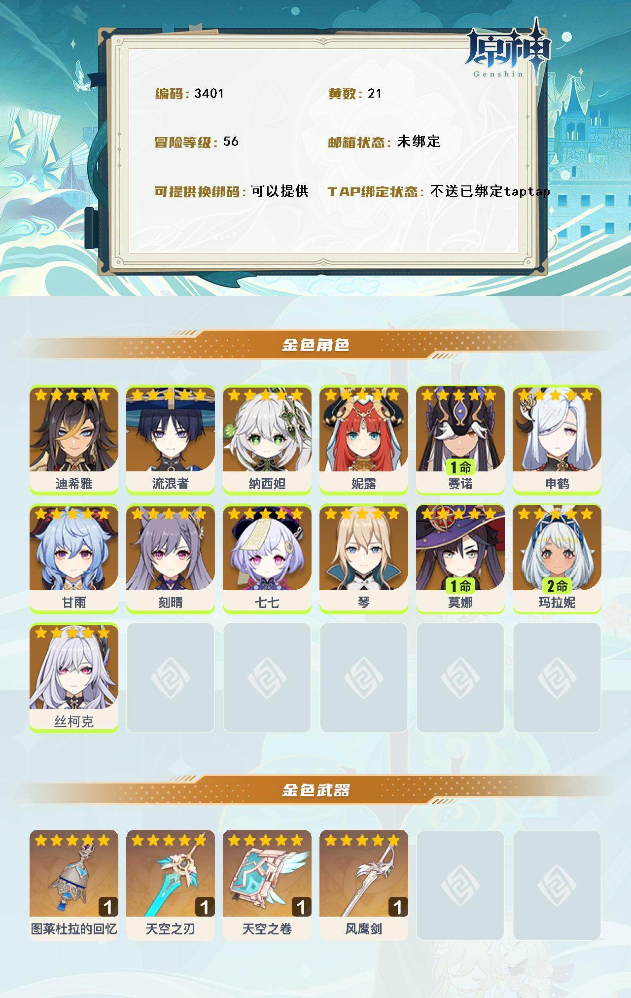 56级/21黄/男主/13个五星角色/4个五星武器 0命迪希雅0命流浪者0命纳西妲0命妮露1命赛诺0命申鹤0命甘雨0命刻晴0命七七0命琴1命莫娜2命玛拉妮0命丝柯克精1图莱杜拉的回忆精1天空之刃精1天空之卷精1风鹰剑