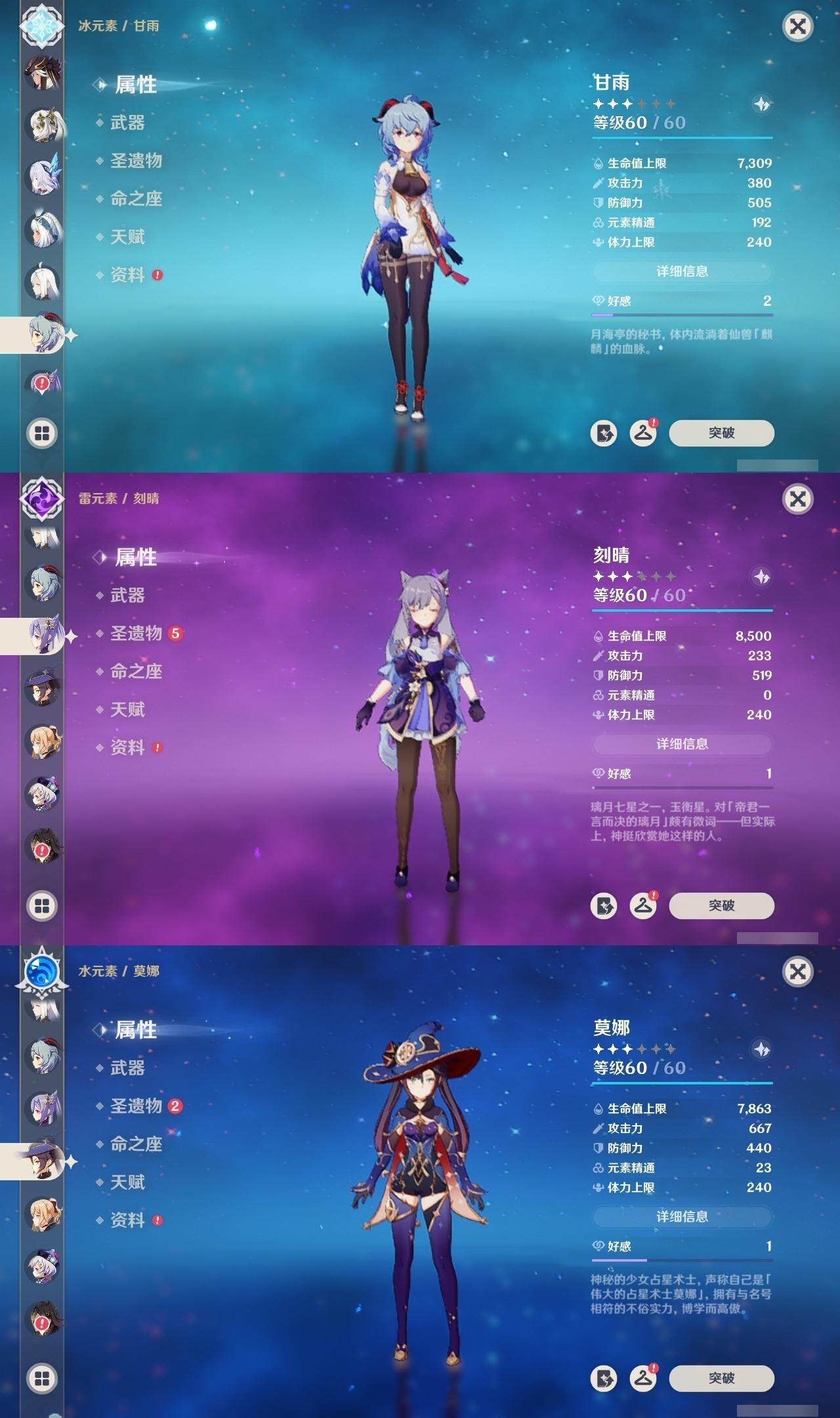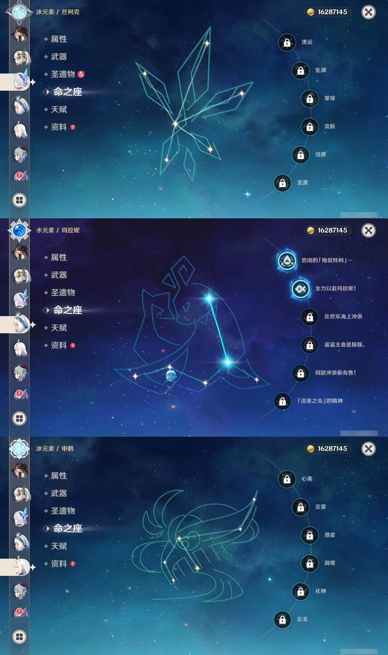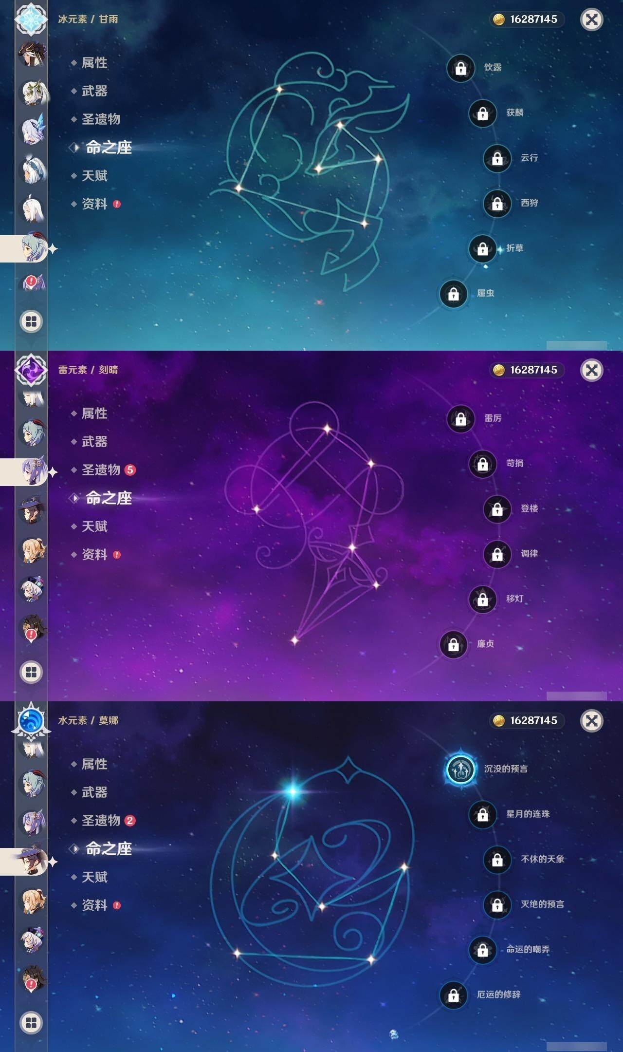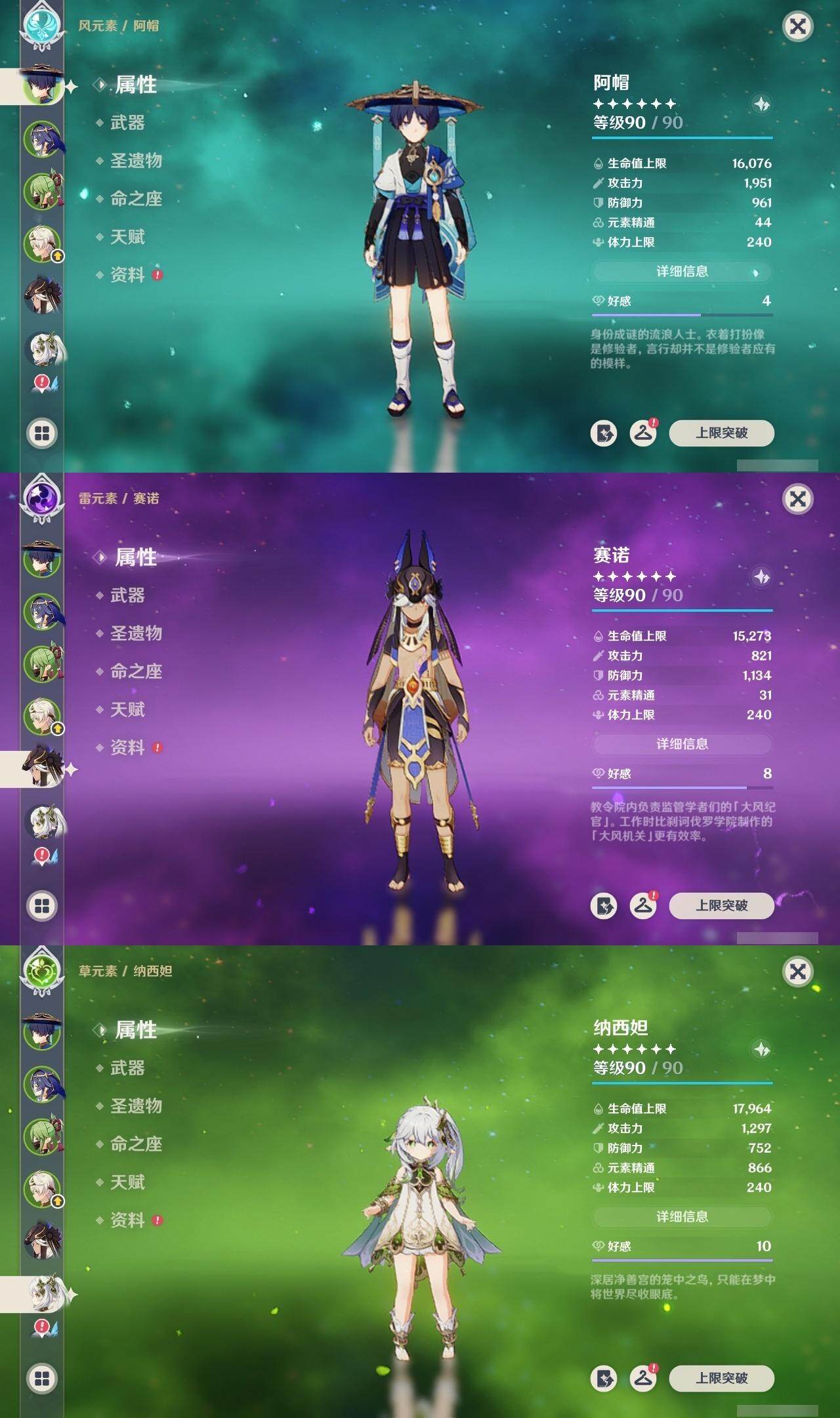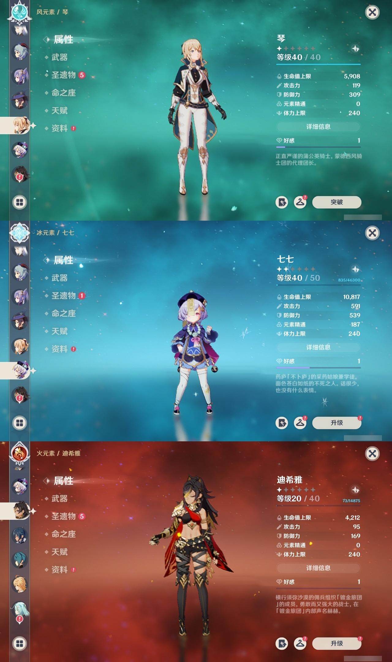 56级/21黄/男主/13个五星角色/4个五星武器 0命迪希雅0命流浪者0命纳西妲0命妮露1命赛诺0命申鹤0命甘雨0命刻晴0命七七0命琴1命莫娜2命玛拉妮0命丝柯克精1图莱杜拉的回忆精1天空之刃精1天空之卷精1风鹰剑