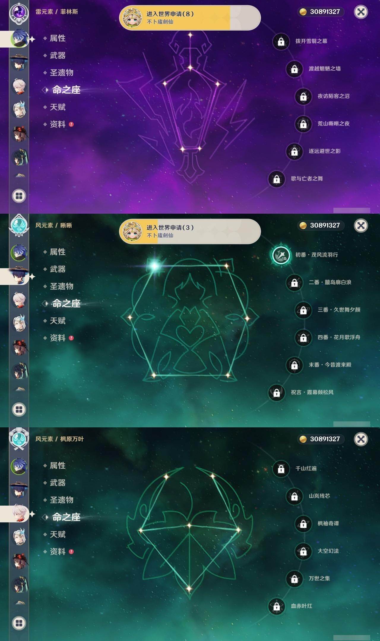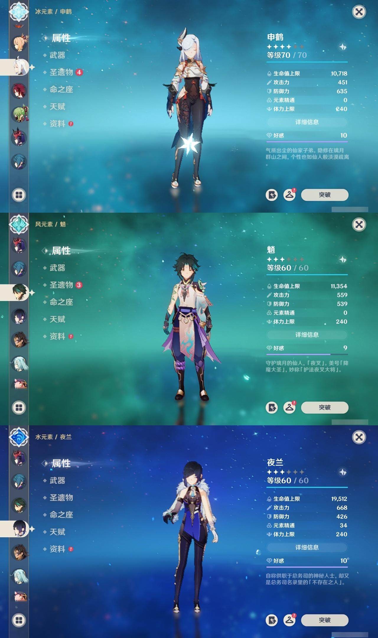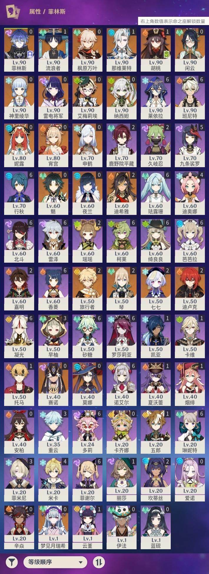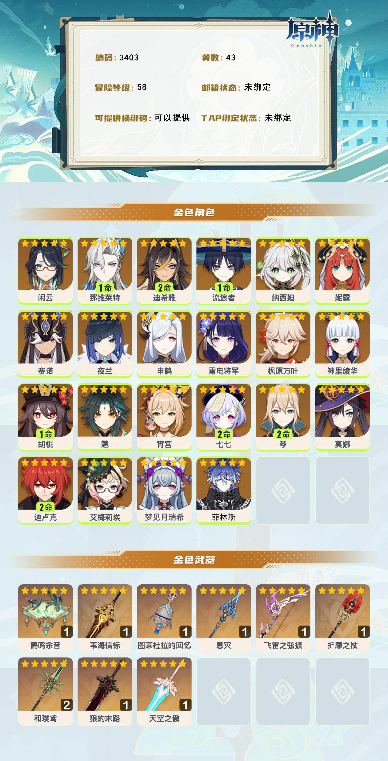 58级/43黄/男主/22个五星角色/9个五星武器 0命闲云1命那维莱特2命迪希雅1命流浪者0命纳西妲0命妮露0命赛诺0命夜兰0命申鹤0命雷电将军0命枫原万叶0命神里绫华1命胡桃0命魈0命宵宫2命七七2命琴0命莫娜2命迪卢克0命艾梅莉埃0命梦见月瑞希0命菲林斯精1鹤鸣余音精1苇海信标精1图莱杜拉的回忆精1息灾精1飞雷之弦振精1护摩之杖精2和璞鸢精1狼的末路精1天空之傲