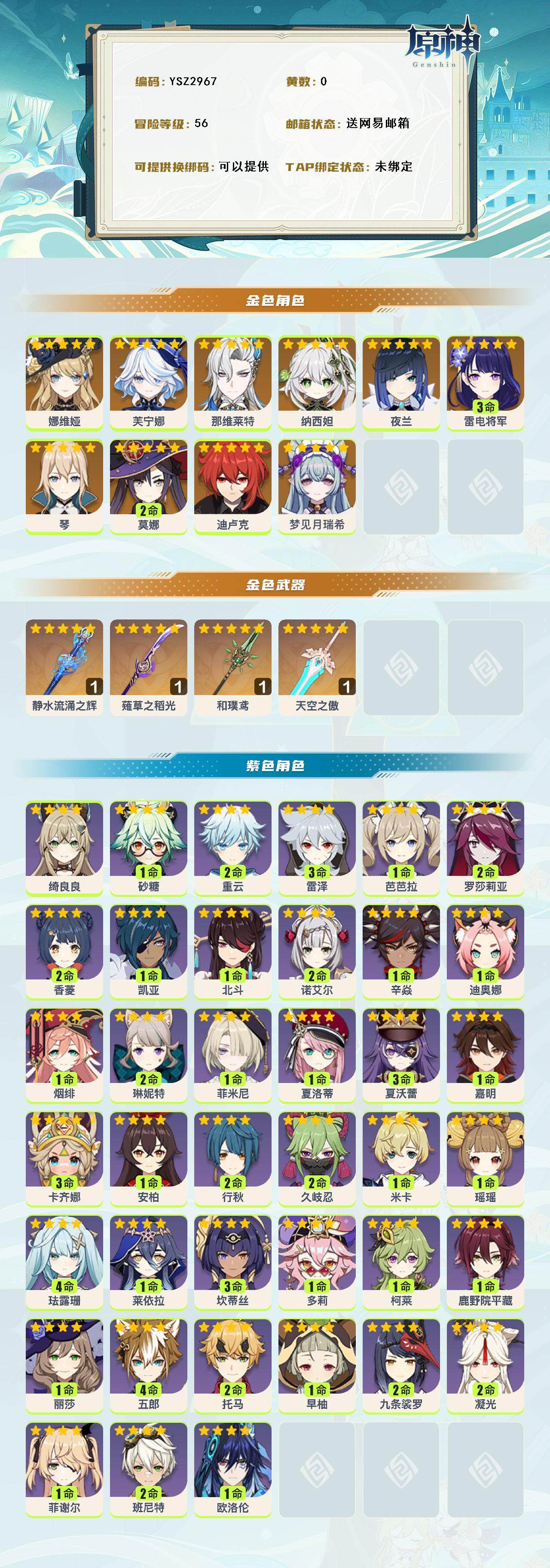 【ysz2967】56级/女主/11个五星角色/0命梦见月瑞希/0命娜维娅/0命芙宁娜/0命那维莱特/0命纳西妲/0命夜兰/3命雷电将军/0命琴/0命迪卢克/2命莫娜/精1静水流涌之辉/精1薙草之稻光/精1天空之傲/精1和璞鸢/0命欧洛伦/3命卡齐娜/1命嘉明/3命夏沃蕾/0命夏洛蒂/1命菲米尼/2命琳妮特/0命绮良良/1命米卡/1命瑶瑶/4命珐露珊/1命莱依拉/3命坎蒂丝/0命多莉/0命柯莱/0命鹿野院平藏/2命久岐忍/4命五郎/2命托马/2命九条裟罗/0命早柚/0命烟绯/2命罗莎莉亚/0命辛焱/0命迪奥娜/0命砂糖/3命雷泽/0命菲谢尔/0命丽莎/1命北斗/2命香菱/0命安柏/2命班尼特/2命行秋/1命芭芭拉/2命凝光/2命诺艾尔/0命凯亚/2命重云