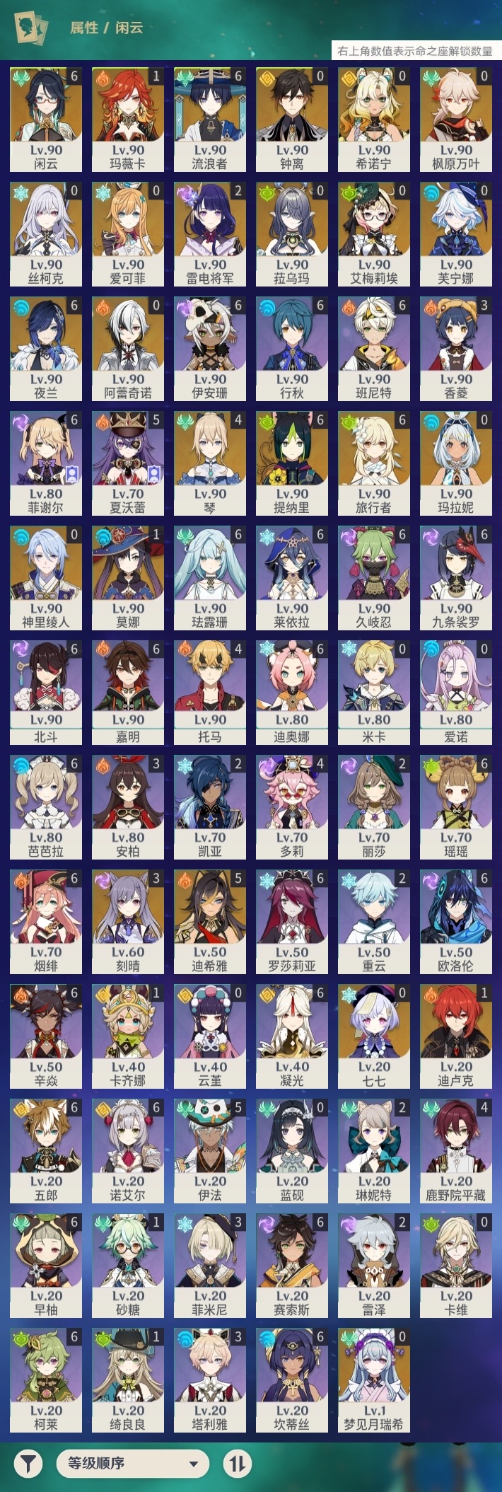 【原神】满命,冒险等级:60,五星数量:39,五星角色:闲云 6命夜兰 6命提纳里 6命流浪者 6命迪希雅 5命琴 4命刻晴 3命雷电将军 2命玛薇卡 1命迪卢克 1命莫娜 1命七七艾梅莉埃玛拉妮希诺宁钟离梦见月瑞希神里绫人芙宁娜爱可菲阿蕾奇诺丝柯克菈乌玛枫原万叶__五星武器:若水 5精冲浪时光鹤鸣余音图莱杜拉的回忆阿莫斯之弓苍古自由之誓风鹰剑和璞鸢护摩之杖四风原典天空之傲天空之脊薙草之稻光波乱月白经津圣显之钥__四星角色:班尼特 6命行秋 6命九条裟罗 6命久岐忍 6命珐露珊 6命凝光 6命迪奥娜 6命瑶瑶 6命莱依拉 6命坎蒂丝 6命柯莱 6命芭芭拉 6命欧洛伦 6命早柚 6命五郎 6命烟绯 6命辛焱 6命诺艾尔 6命罗莎莉亚 6命菲谢尔 6命北斗 6命嘉明 6命伊安珊 6命赛索斯 6命夏沃蕾 5命伊法 5命鹿野院平藏 4命多莉 4命托马 4命香菱 3命菲米尼 3命塔利雅 3命重云 2命雷泽 2命琳妮特 2命卡齐娜 1命砂糖 1命绮良良 1命米卡卡维蓝砚云堇爱诺190抽,190抽,190抽,190抽,190抽,