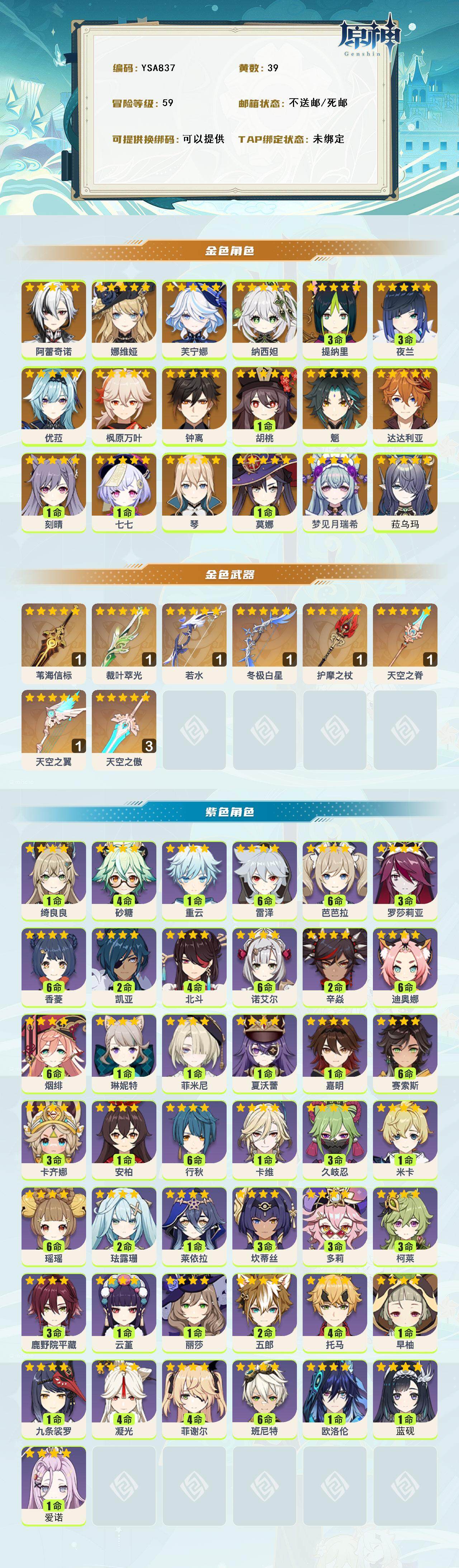 【ysa837】59级/39黄/女主/28个五星角色/11个五星武器/0命菈乌玛/0命梦见月瑞希/0命阿蕾奇诺/0命娜维娅/0命芙宁娜/0命纳西妲/3命提纳里/3命夜兰/0命枫原万叶/0命优菈/1命胡桃/0命魈/0命钟离/0命达达利亚/0命琴/1命刻晴/1命莫娜/1命七七/精1苇海信标/精1裁叶萃光/精1若水/精1冬极白星/精1护摩之杖/精3天空之傲/精1天空之脊/精1天空之翼/1命爱诺/1命蓝砚/0命欧洛伦/3命卡齐娜/满命赛索斯/0命嘉明/0命夏沃蕾/0命菲米尼/0命琳妮特/1命绮良良/1命卡维/0命米卡/满命瑶瑶/2命珐露珊/0命莱依拉/3命坎蒂丝/3命多莉/3命柯莱/3命鹿野院平藏/3命久岐忍/1命云堇/2命五郎/4命托马/1命九条裟罗/1命早柚/满命烟绯/3命罗莎莉亚/2命辛焱/满命迪奥娜/4命砂糖/满命雷泽/4命菲谢尔/0命丽莎/4命北斗/满命香菱/0命安柏/满命班尼特/满命行秋/满命芭芭拉/4命凝光/满命诺艾尔/2命凯亚/0命重云