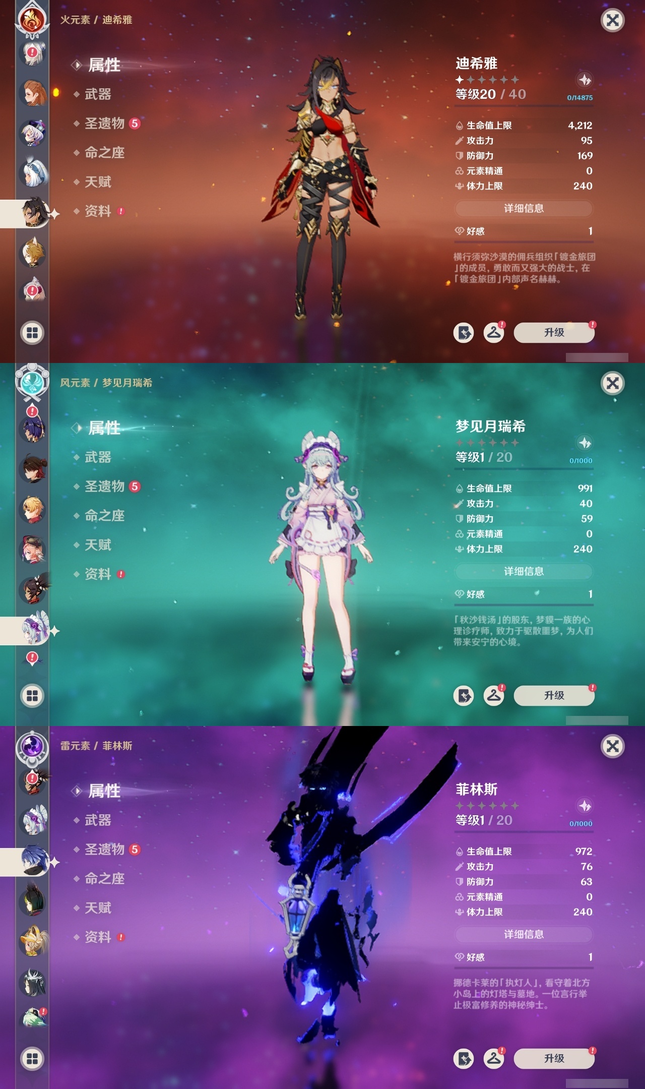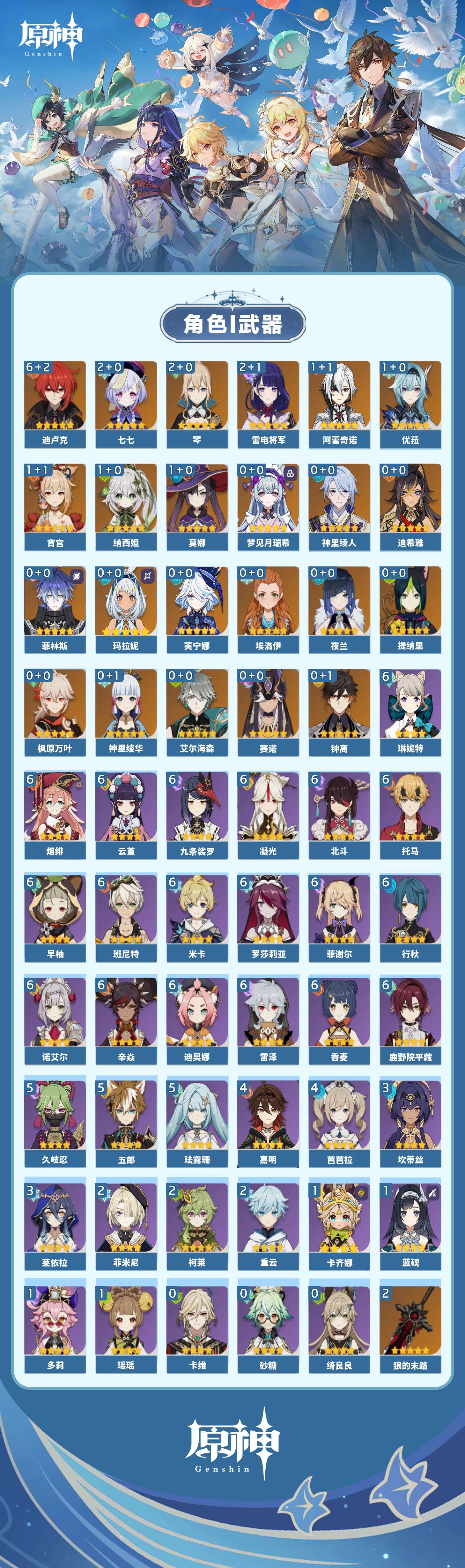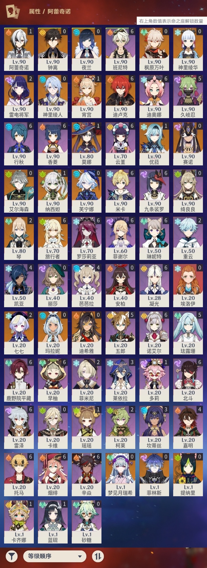 【原神】【lyys8554】冒险等级:60,五星数量:33,五星角色:迪卢克 6命雷电将军 2命七七 2命琴 2命阿蕾奇诺 1命莫娜 1命宵宫 1命优菈 1命纳西妲 1命玛拉妮神里绫华迪希雅钟离梦见月瑞希神里绫人夜兰芙宁娜提纳里赛诺菲林斯艾尔海森枫原万叶__五星武器:狼的末路 2精赤月之形飞雷之弦振风鹰剑和璞鸢天空之傲天空之刃雾切之回光薙草之稻光贯虹之槊__四星角色:班尼特 6命行秋 6命九条裟罗 6命香菱 6命鹿野院平藏 6命凝光 6命迪奥娜 6命米卡 6命云堇 6命早柚 6命托马 6命烟绯 6命辛焱 6命诺艾尔 6命罗莎莉亚 6命雷泽 6命菲谢尔 6命北斗 6命琳妮特 6命久岐忍 5命珐露珊 5命五郎 5命芭芭拉 4命嘉明 4命莱依拉 3命坎蒂丝 3命柯莱 2命重云 2命菲米尼 2命卡齐娜 1命瑶瑶 1命多莉 1命蓝砚 1命埃洛伊砂糖绮良良卡维