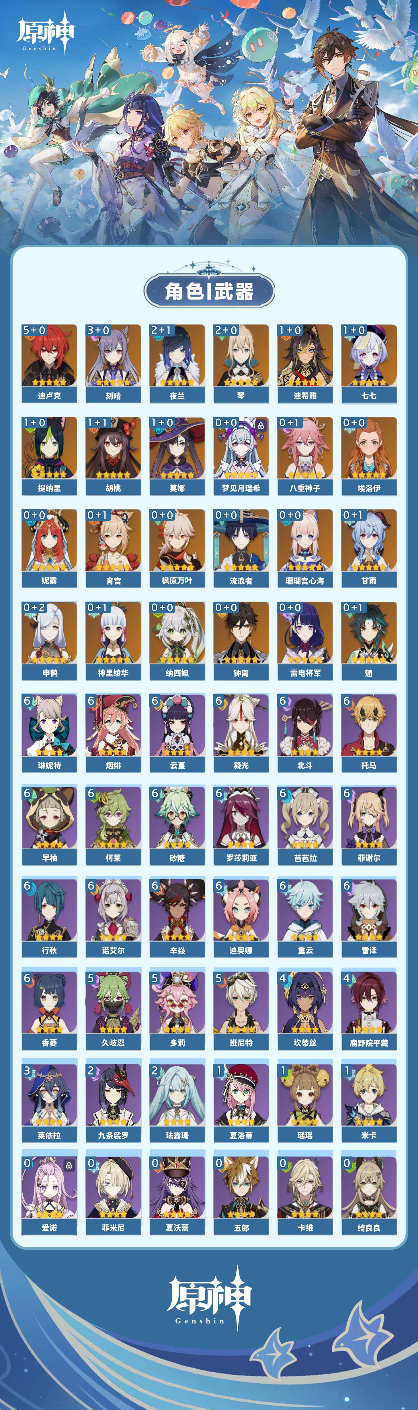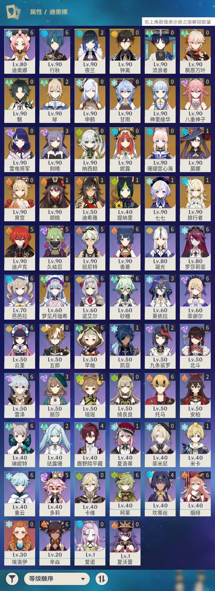 【原神】【lyys8556】冒险等级:60,五星数量:37,五星角色:迪卢克 5命刻晴 3命琴 2命夜兰 2命迪希雅 1命胡桃 1命莫娜 1命七七 1命提纳里 1命珊瑚宫心海神里绫华宵宫钟离梦见月瑞希申鹤八重神子妮露纳西妲流浪者枫原万叶甘雨魈雷电将军__五星武器:息灾 2精阿莫斯之弓飞雷之弦振和璞鸢护摩之杖四风原典天空之傲天空之脊天空之卷天空之刃雾切之回光神乐之真意若水__四星角色:行秋 6命香菱 6命凝光 6命迪奥娜 6命砂糖 6命柯莱 6命芭芭拉 6命云堇 6命早柚 6命托马 6命烟绯 6命重云 6命辛焱 6命诺艾尔 6命罗莎莉亚 6命雷泽 6命菲谢尔 6命北斗 6命琳妮特 6命班尼特 5命久岐忍 5命多莉 5命鹿野院平藏 4命坎蒂丝 4命莱依拉 3命九条裟罗 2命珐露珊 2命瑶瑶 1命米卡 1命夏洛蒂 1命埃洛伊绮良良卡维五郎菲米尼夏沃蕾爱诺