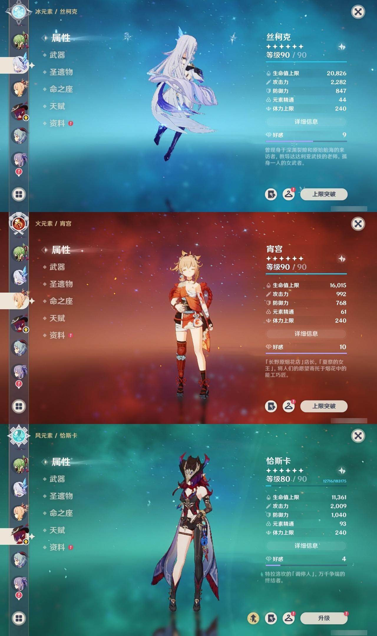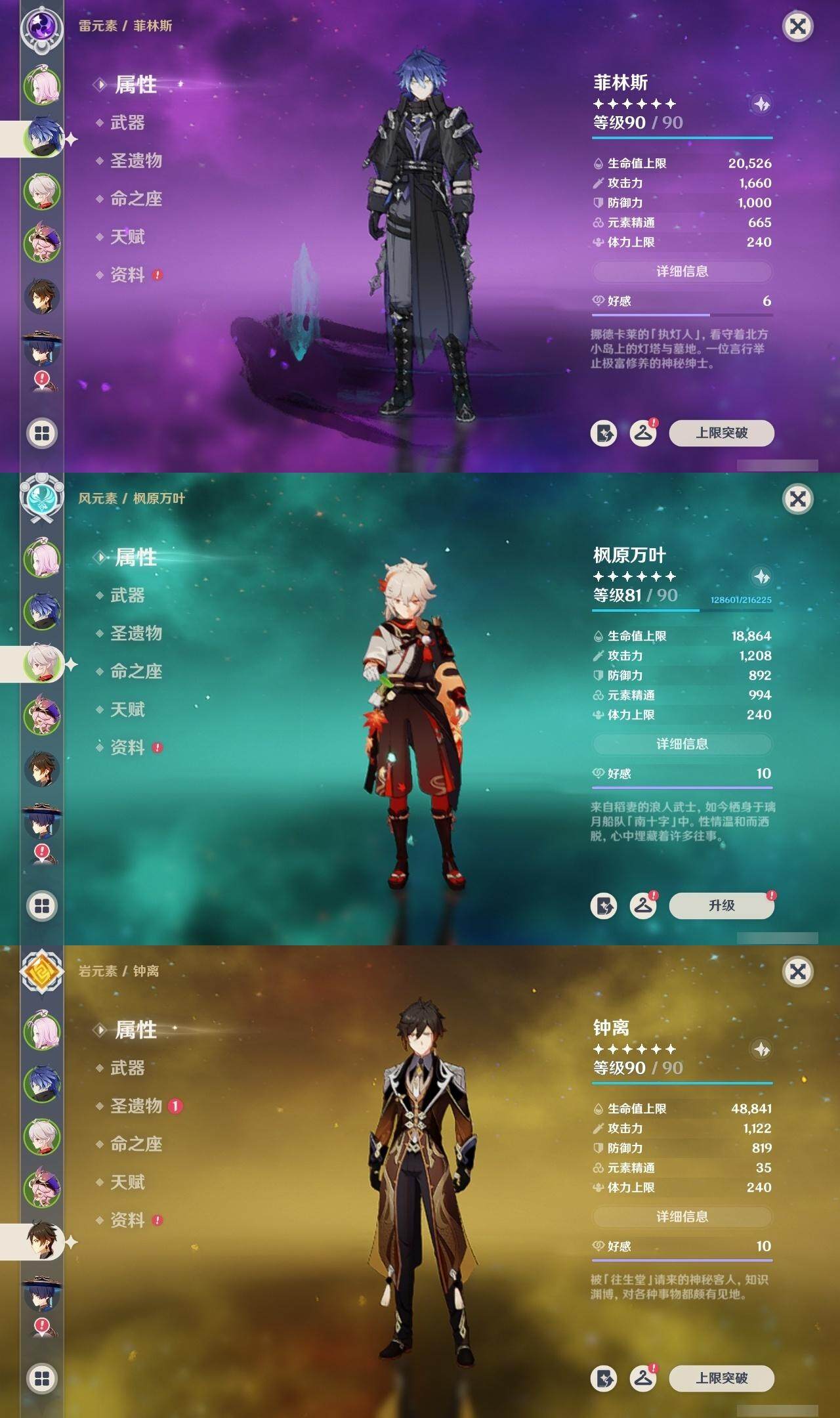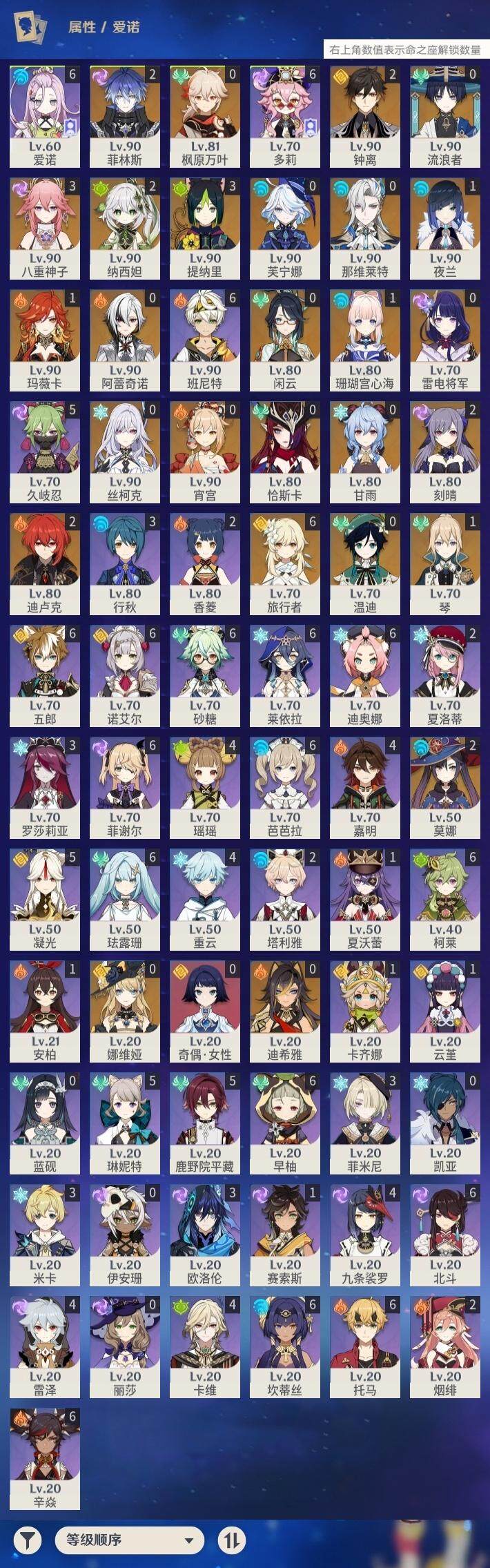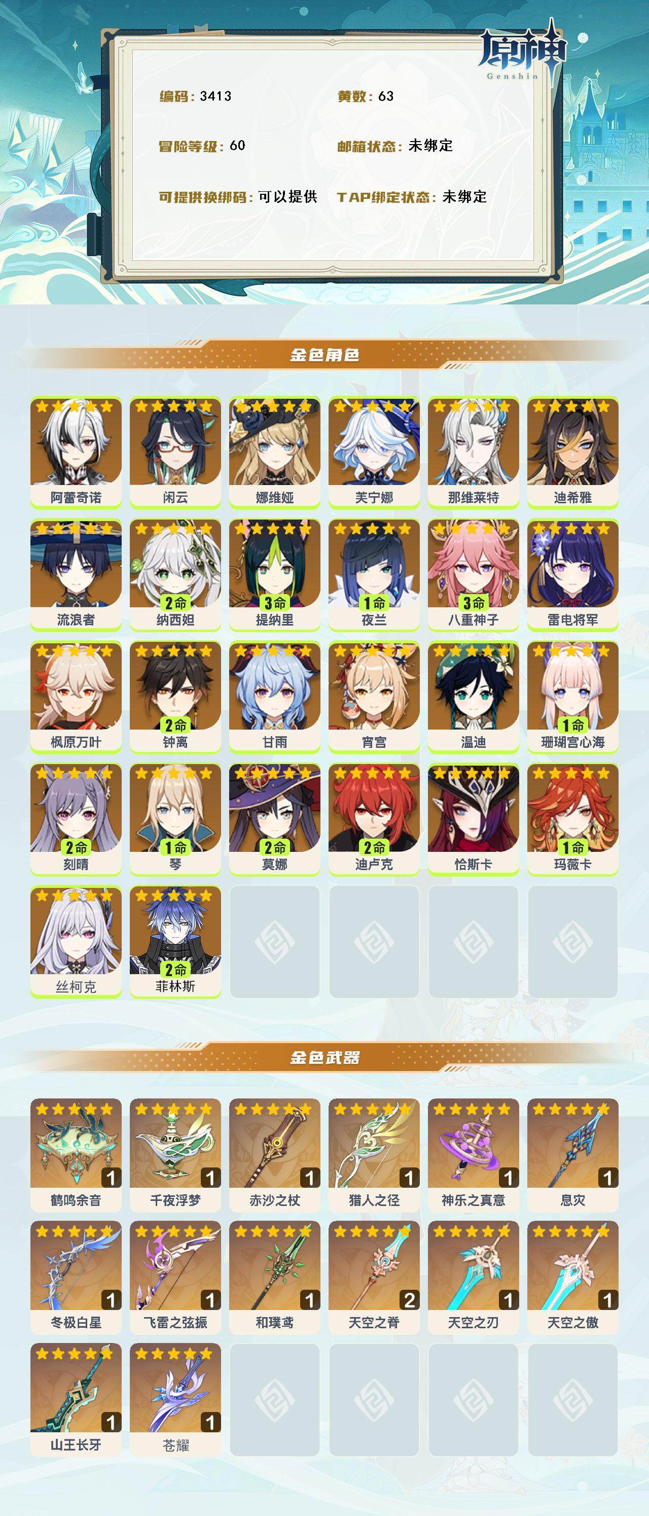 60级/63黄/女主/26个五星角色/14个五星武器 0命阿蕾奇诺0命闲云0命娜维娅0命芙宁娜0命那维莱特0命迪希雅0命流浪者2命纳西妲3命提纳里1命夜兰3命八重神子0命雷电将军0命枫原万叶2命钟离0命甘雨0命宵宫0命温迪1命珊瑚宫心海2命刻晴1命琴2命莫娜2命迪卢克0命恰斯卡1命玛薇卡0命丝柯克2命菲林斯精1鹤鸣余音精1千夜浮梦精1赤沙之杖精1猎人之径精1神乐之真意精1息灾精1冬极白星精1飞雷之弦振精1和璞鸢精2天空之脊精1天空之刃精1天空之傲精1山王长牙精1苍耀