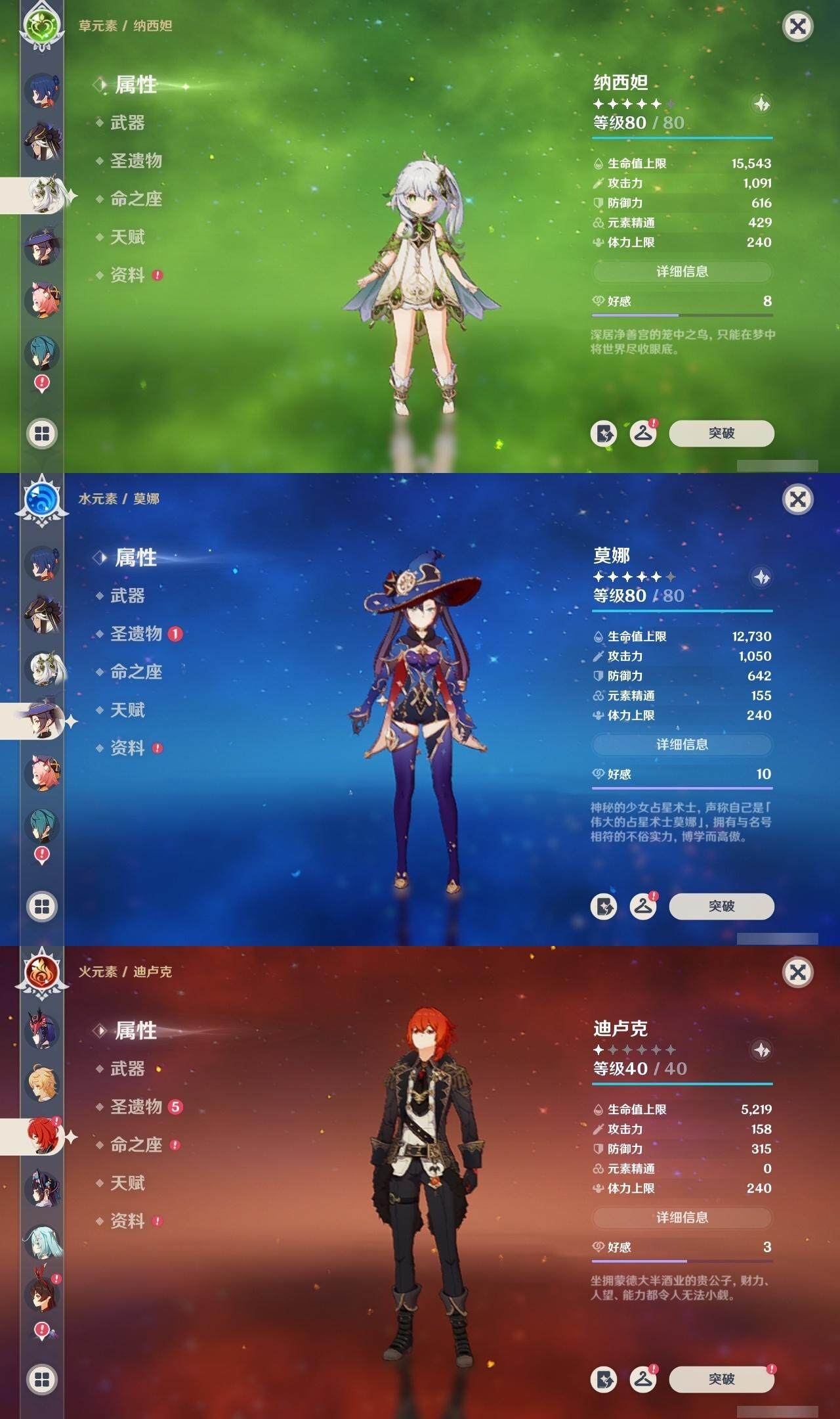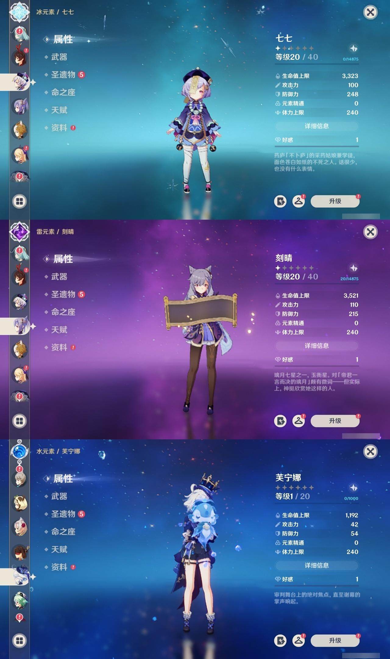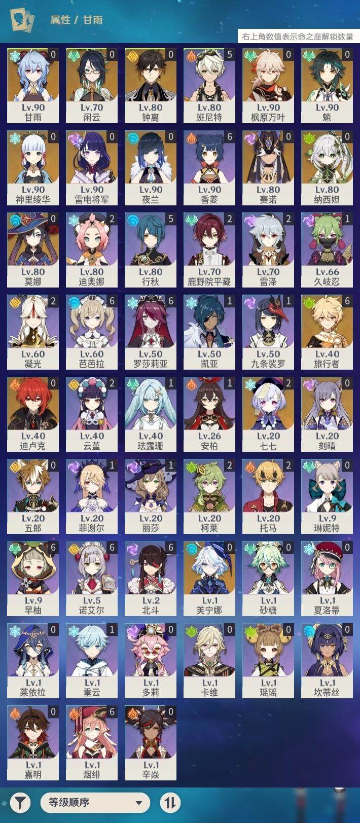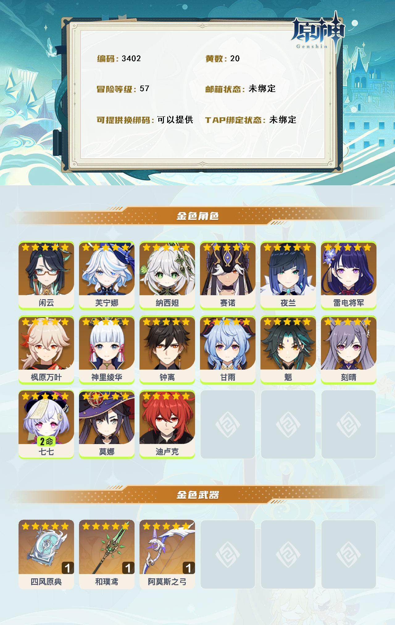 57级/20黄/男主/15个五星角色/3个五星武器 0命闲云0命芙宁娜0命纳西妲0命赛诺0命夜兰0命雷电将军0命枫原万叶0命神里绫华0命钟离0命甘雨0命魈0命刻晴2命七七0命莫娜0命迪卢克精1四风原典精1和璞鸢精1阿莫斯之弓