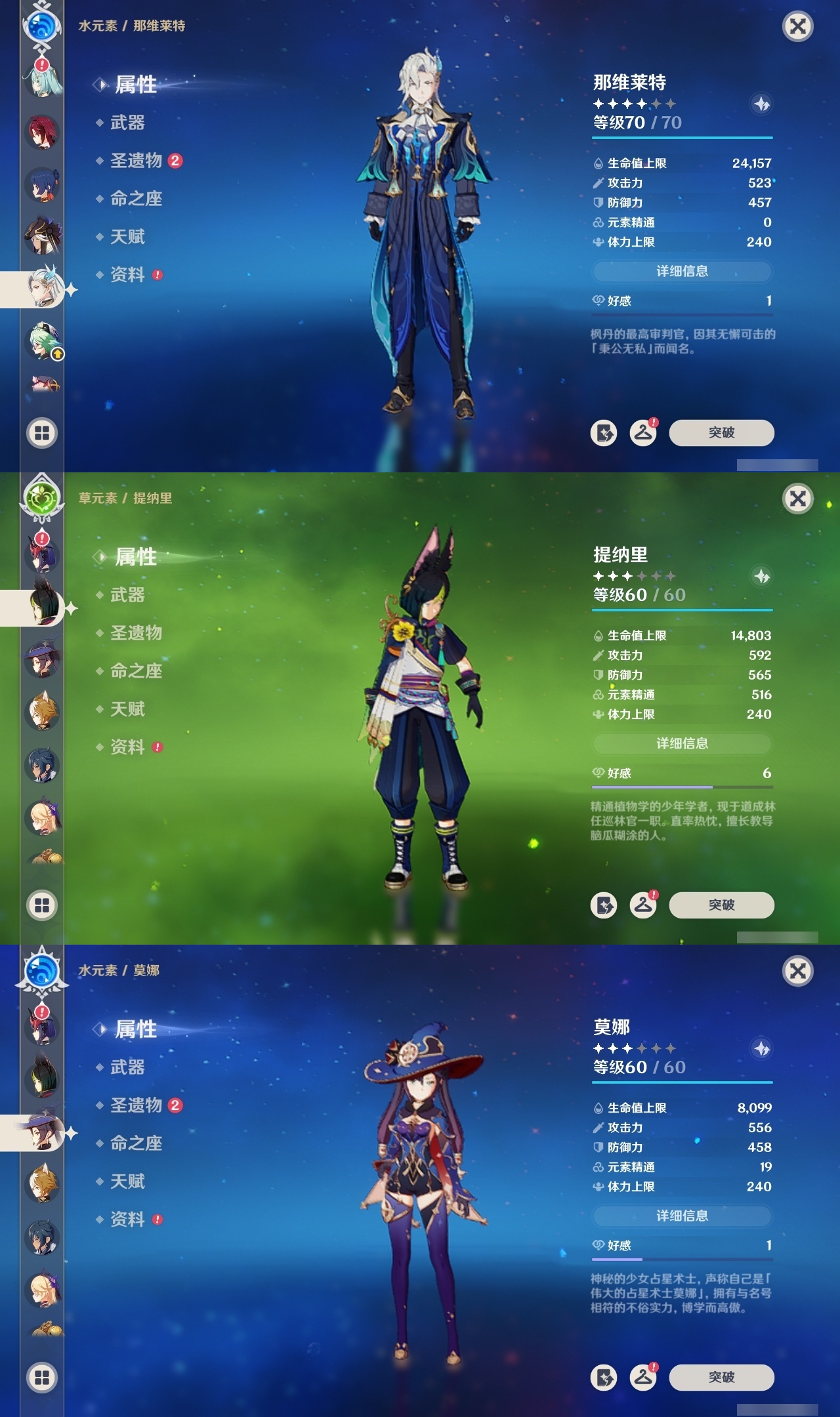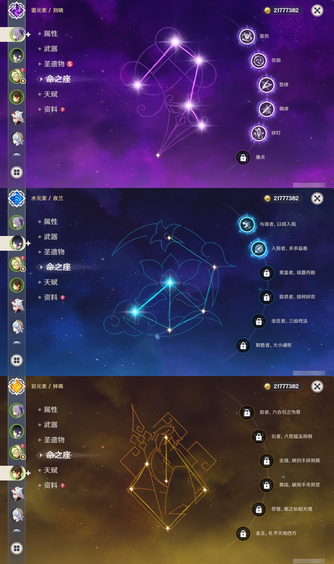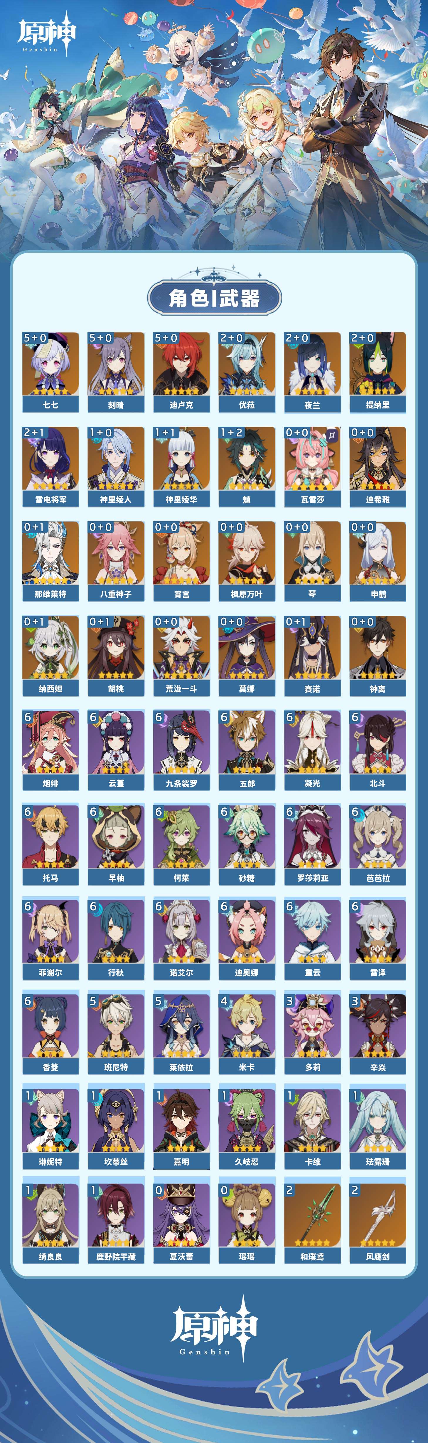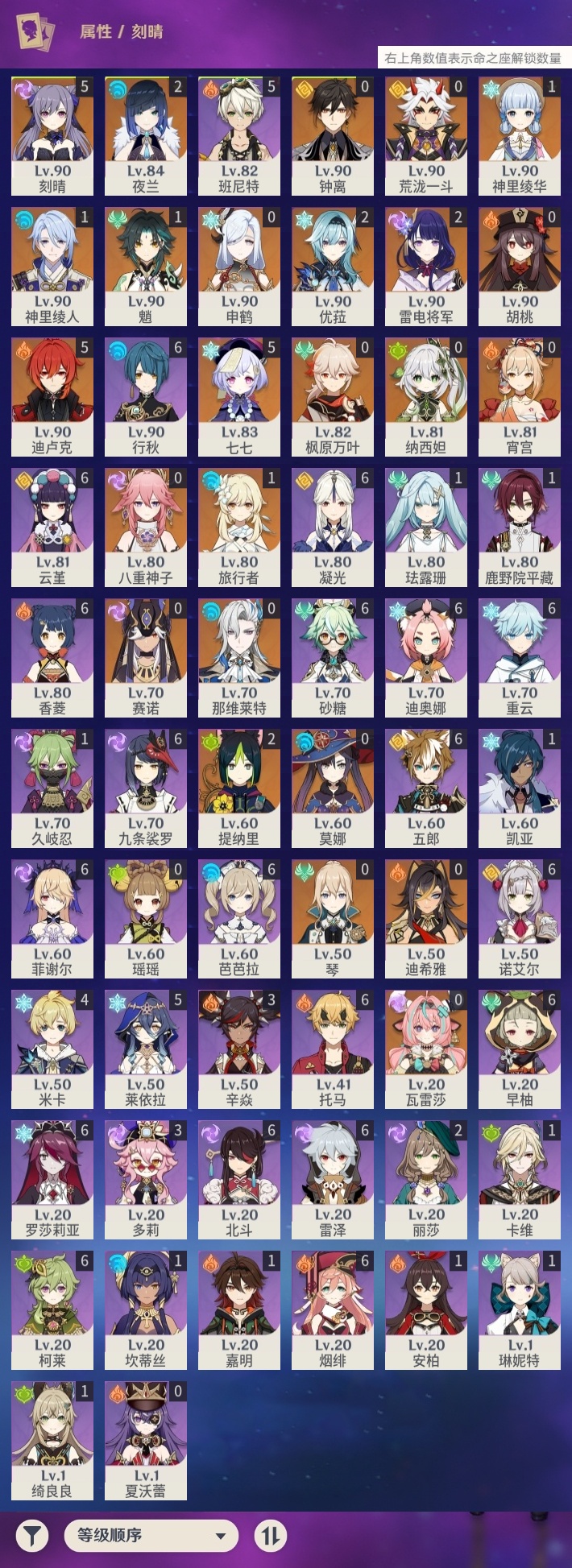 【原神】【lyys8571】冒险等级:59,五星数量:37,五星角色:迪卢克 5命刻晴 5命七七 5命雷电将军 2命优菈 2命夜兰 2命提纳里 2命魈 1命神里绫华 1命神里绫人 1命莫娜琴宵宫迪希雅钟离荒泷一斗申鹤瓦雷莎八重神子那维莱特赛诺纳西妲枫原万叶胡桃__五星武器:风鹰剑 2精和璞鸢 2精碧落之珑万世流涌大典阿莫斯之弓护摩之杖磐岩结绿天空之翼雾切之回光薙草之稻光斫峰之刃赤沙之杖千夜浮梦__四星角色:行秋 6命九条裟罗 6命香菱 6命凝光 6命迪奥娜 6命砂糖 6命柯莱 6命芭芭拉 6命云堇 6命早柚 6命托马 6命五郎 6命烟绯 6命重云 6命诺艾尔 6命罗莎莉亚 6命雷泽 6命菲谢尔 6命北斗 6命班尼特 5命莱依拉 5命米卡 4命多莉 3命辛焱 3命久岐忍 1命鹿野院平藏 1命珐露珊 1命绮良良 1命坎蒂丝 1命卡维 1命琳妮特 1命嘉明 1命瑶瑶夏沃蕾