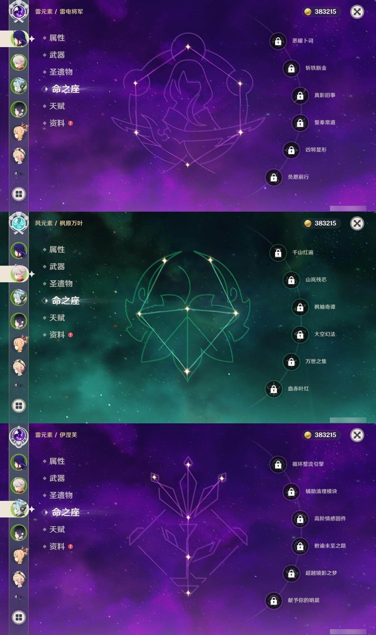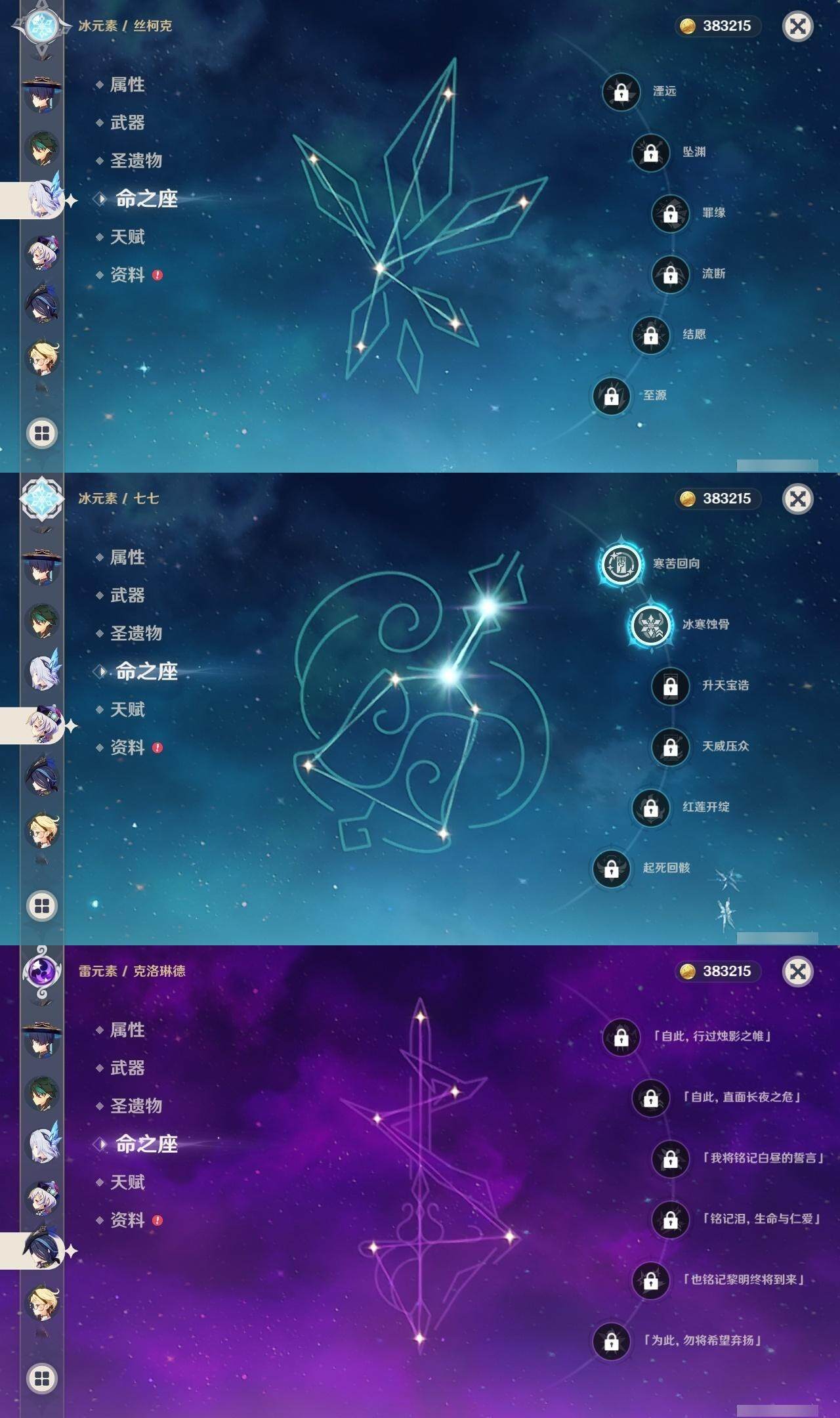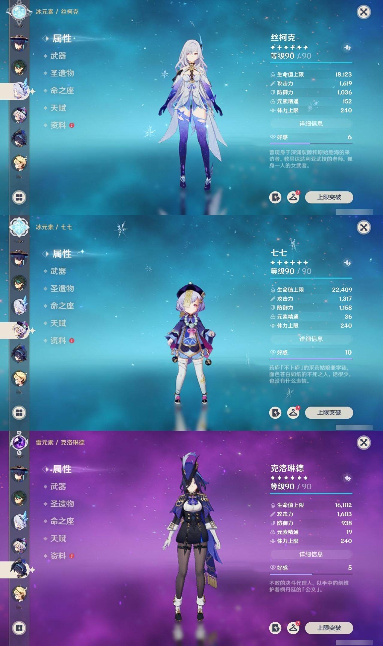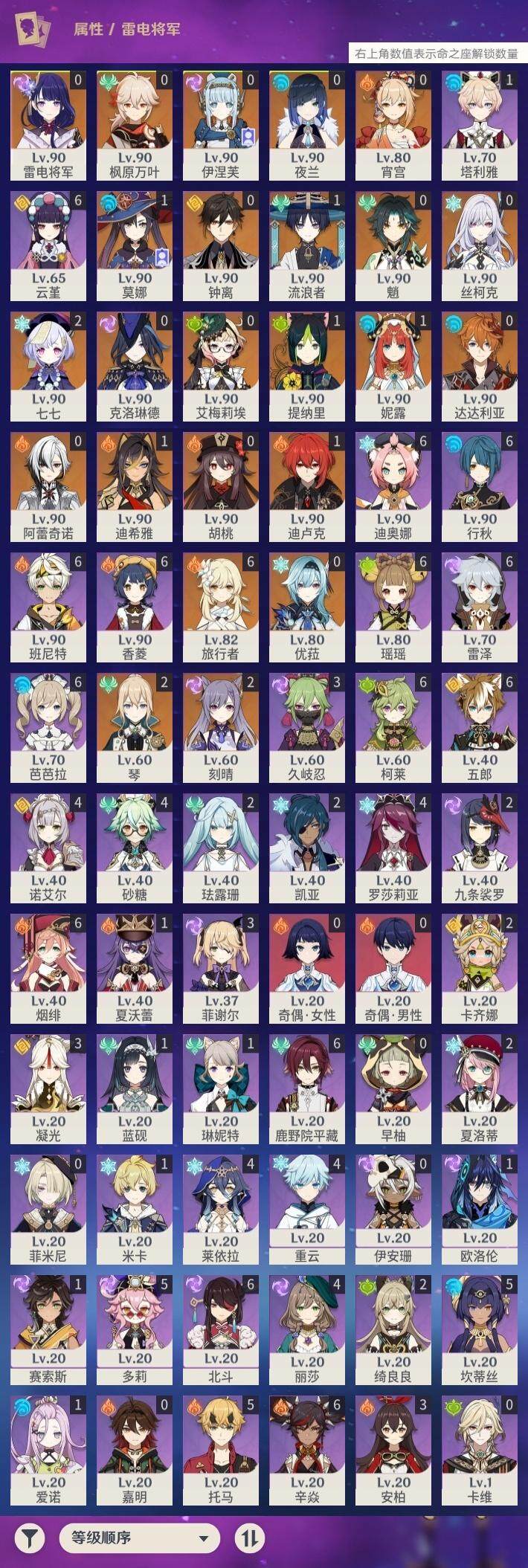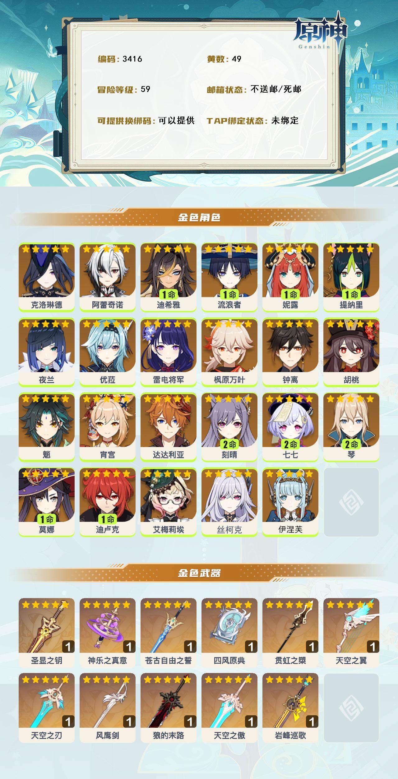 59级/49黄/女主/23个五星角色/14个五星武器 0命克洛琳德0命阿蕾奇诺1命迪希雅1命流浪者1命妮露1命提纳里0命夜兰0命优菈0命雷电将军0命枫原万叶0命钟离0命胡桃0命魈0命宵宫0命达达利亚2命刻晴2命七七2命琴1命莫娜1命迪卢克0命艾梅莉埃0命丝柯克0命伊涅芙精1圣显之钥精1神乐之真意精1苍古自由之誓精1四风原典精1贯虹之槊精1天空之翼精1天空之刃精1风鹰剑精1狼的末路精1天空之傲精1岩峰巡歌