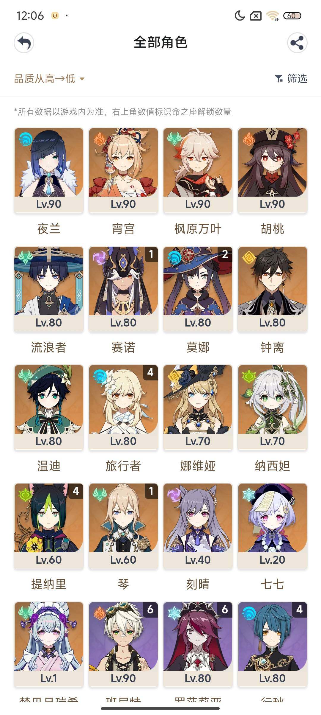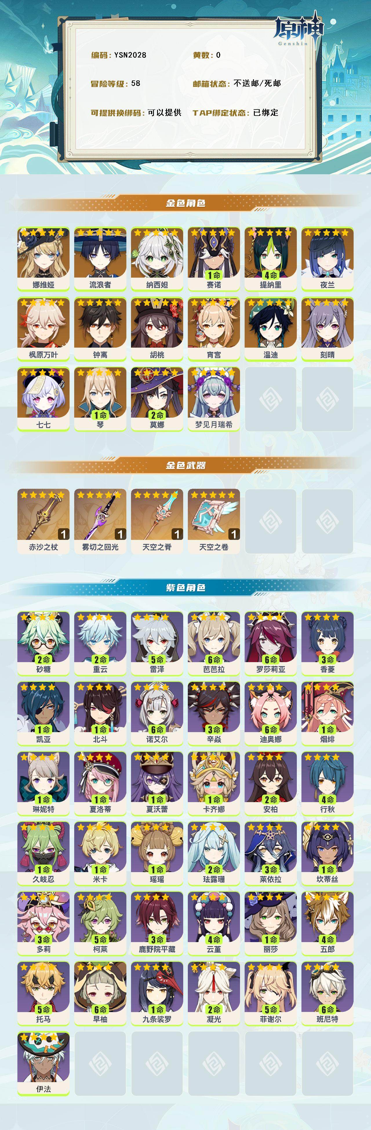 【ysn2028】58级/女主/17个五星角色/0命梦见月瑞希/0命娜维娅/0命流浪者/0命纳西妲/1命赛诺/4命提纳里/0命夜兰/0命宵宫/0命枫原万叶/0命胡桃/0命钟离/0命温迪/1命琴/0命刻晴/2命莫娜/0命七七/精1赤沙之杖/精1雾切之回光/精1天空之卷/精1天空之脊/0命伊法/0命卡齐娜/0命夏沃蕾/0命夏洛蒂/0命琳妮特/1命米卡/0命瑶瑶/2命珐露珊/3命莱依拉/1命坎蒂丝/3命多莉/5命柯莱/3命鹿野院平藏/1命久岐忍/4命云堇/4命五郎/5命托马/1命九条裟罗/满命早柚/0命烟绯/满命罗莎莉亚/3命辛焱/满命迪奥娜/2命砂糖/5命雷泽/5命菲谢尔/1命丽莎/0命北斗/3命香菱/2命安柏/满命班尼特/4命行秋/满命芭芭拉/2命凝光/满命诺艾尔/0命凯亚/2命重云