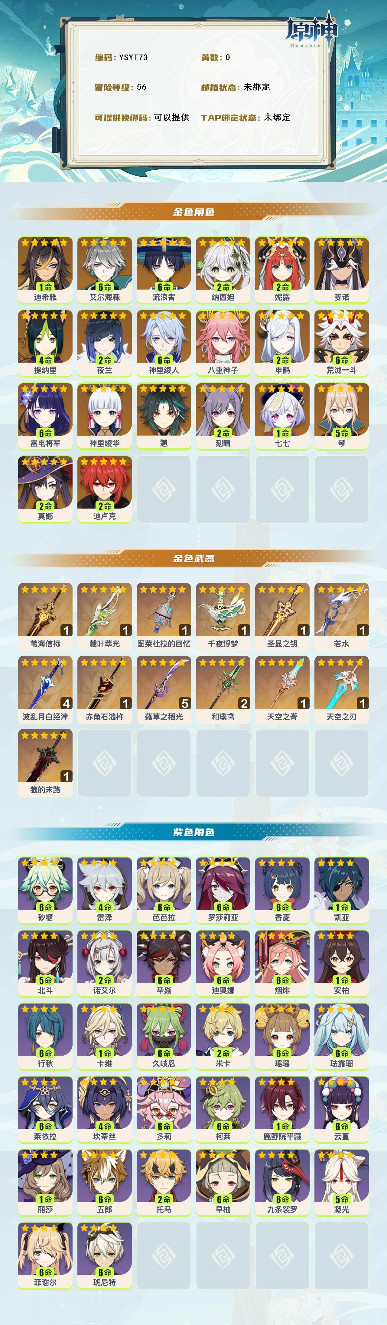 【ysyt73】56级/男主/21个五星角色/1命迪希雅/满命艾尔海森/满命流浪者/2命纳西妲/2命妮露/0命赛诺/4命提纳里/2命夜兰/满命神里绫人/0命八重神子/2命申鹤/满命荒泷一斗/满命雷电将军/0命神里绫华/0命魈/5命琴/2命刻晴/2命迪卢克/2命莫娜/1命七七/精1苇海信标/精1裁叶萃光/精1图莱杜拉的回忆/精1千夜浮梦/精1圣显之钥/精1若水/精4波乱月白经津/精1赤角石溃杵/精5薙草之稻光/精2和璞鸢/精1狼的末路/精1天空之脊/精1天空之刃/0命卡维/2命米卡/满命瑶瑶/满命珐露珊/满命莱依拉/4命坎蒂丝/满命多莉/满命柯莱/1命鹿野院平藏/满命久岐忍/满命云堇/满命五郎/2命托马/满命九条裟罗/满命早柚/满命烟绯/满命罗莎莉亚/满命辛焱/满命迪奥娜/满命砂糖/4命雷泽/满命菲谢尔/1命丽莎/5命北斗/满命香菱/0命安柏/满命班尼特/满命行秋/满命芭芭拉/5命凝光/2命诺艾尔/1命凯亚