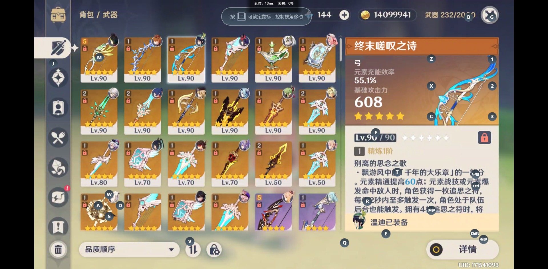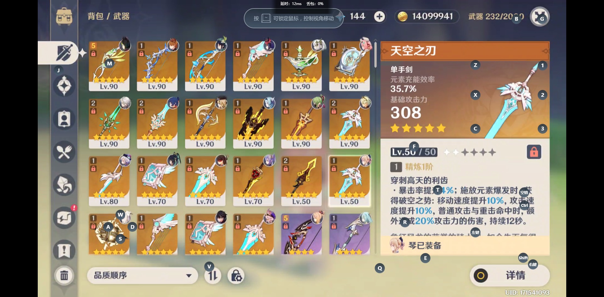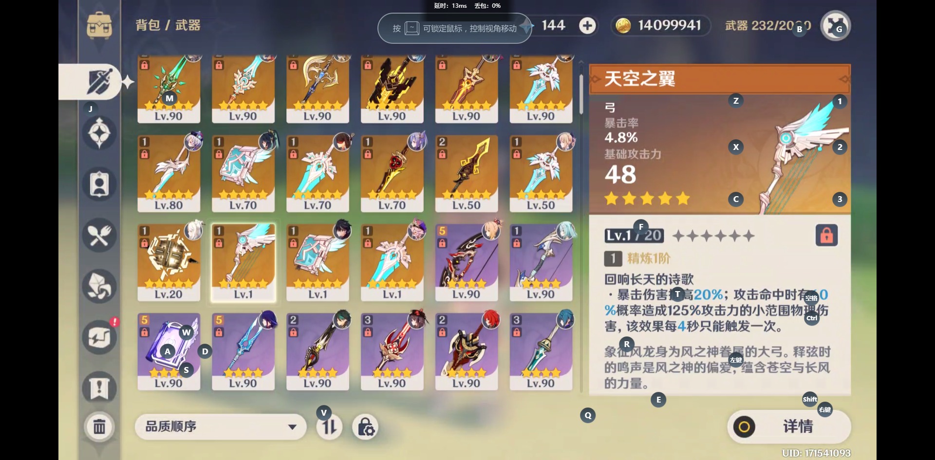 [14234229]【总黄数】:46 【冒险等级】:59 【6命金色角色】:满命钟离满命提纳里满命七七满命莫娜 【4命金色角色】:四命刻晴 【3命金色角色】:三命迪卢克 【1命金色角色】:一命闲云一命琴 【0命金色角色】:瓦雷莎玛薇卡阿蕾奇诺娜维娅莱欧斯利白术八重神子雷电将军宵宫枫原万叶优菈胡桃魈达达利亚温迪 【5精武器】:猎人之径 【2精武器】:和璞鸢贯虹之槊天空之脊 【1精武器】:有乐御簾切裁断千夜浮梦圣显之钥冬极白星终末嗟叹之诗风鹰剑天空之傲天空之卷无工之剑天空之翼天空之刃四风原典
