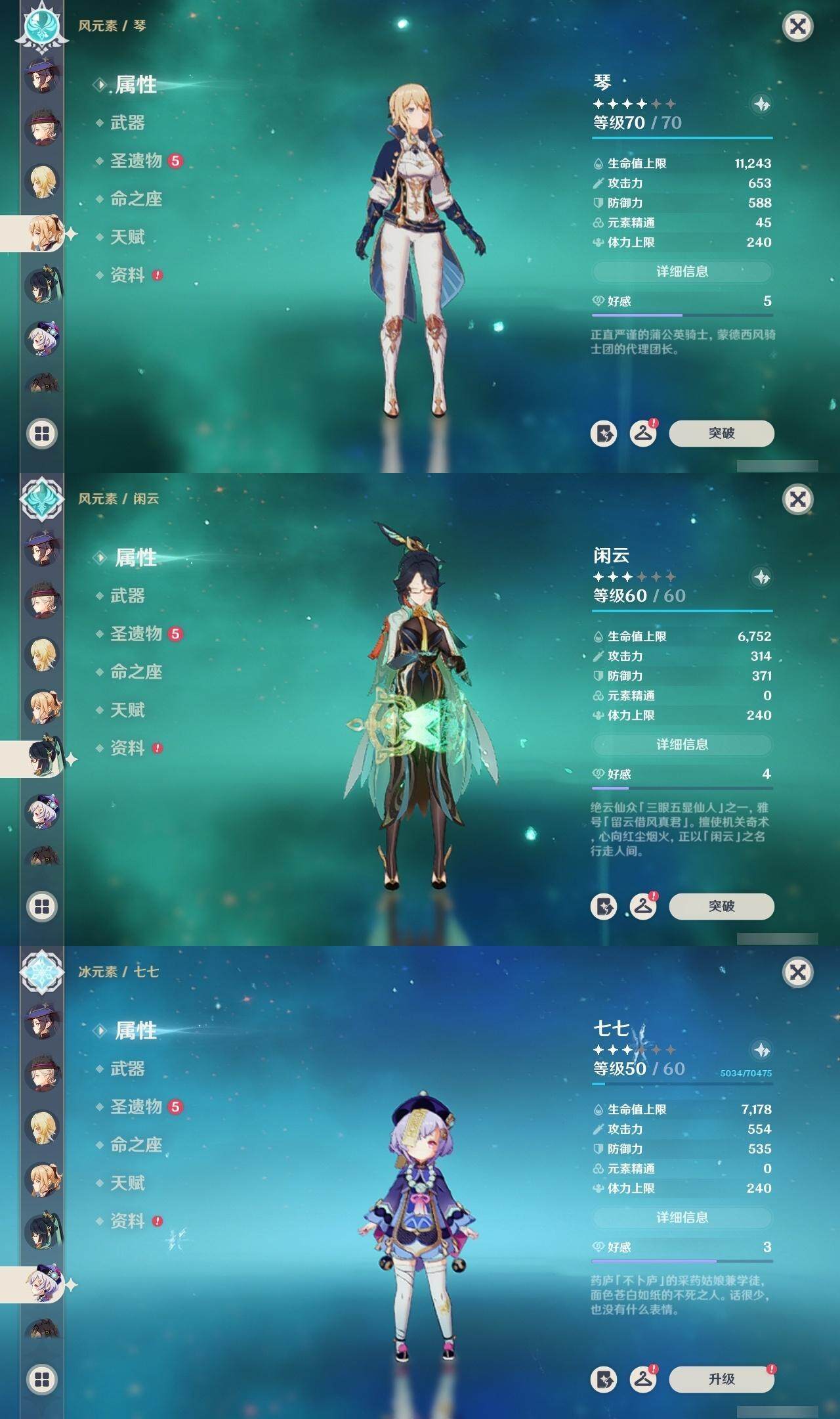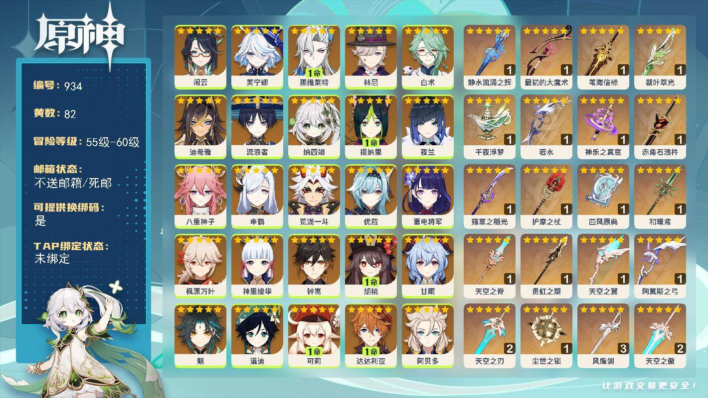 [14236433]60级/82黄/女主/31个五星角色/25个五星武器 0命闲云0命芙宁娜1命那维莱特0命林尼0命白术0命迪希雅0命流浪者0命纳西妲1命提纳里0命夜兰0命八重神子0命申鹤0命荒泷一斗0命优菈0命雷电将军0命枫原万叶0命神里绫华0命钟离1命胡桃0命甘雨0命魈0命温迪1命可莉1命达达利亚0命阿贝多0命珊瑚宫心海3命刻晴3命七七3命琴3命莫娜5命迪卢克精1静水流涌之辉精1最初的大魔术精1苇海信标精1裁叶萃光精1千夜浮梦精1若水精1神乐之真意精1赤角石溃杵精1薙草之稻光精1护摩之杖精1四风原典精1和璞鸢精1天空之脊精1贯虹之槊精1天空之翼精1阿莫斯之弓精2天空之刃精1尘世之锁精3风鹰剑精2天空之傲精1山王长牙