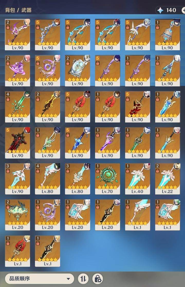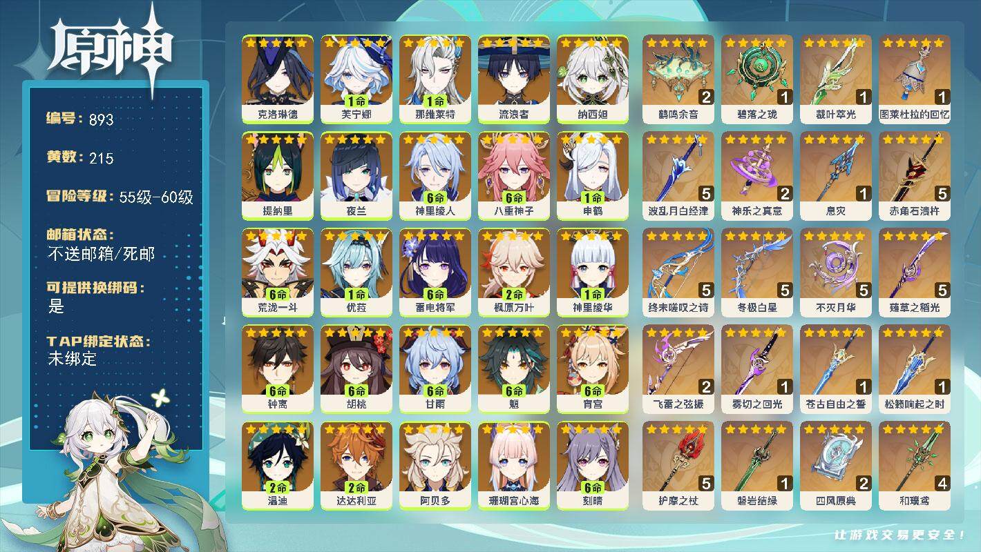 [14081827]60级/215黄/女主/29个五星角色/38个五星武器 0命克洛琳德1命芙宁娜1命那维莱特0命流浪者0命纳西妲0命提纳里0命夜兰满命神里绫人满命八重神子1命申鹤满命荒泷一斗1命优菈满命雷电将军2命枫原万叶1命神里绫华满命钟离满命胡桃满命甘雨满命魈满命宵宫2命温迪2命达达利亚0命阿贝多0命珊瑚宫心海满命刻晴5命七七满命琴4命莫娜满命迪卢克精2鹤鸣余音精1碧落之珑精1裁叶萃光精1图莱杜拉的回忆精5波乱月白经津精2神乐之真意精1息灾精5赤角石溃杵精5终末嗟叹之诗精5冬极白星精5不灭月华精5薙草之稻光精2飞雷之弦振精1雾切之回光精1苍古自由之誓精1松籁响起之时精5护摩之杖精1磐岩结绿精2四风原典精4和璞鸢精3天空之脊精2贯虹之槊精4天空之翼精5阿莫斯之弓精3天空之刃精1斫峰之刃精1天空之卷精5狼的末路精2天空之傲