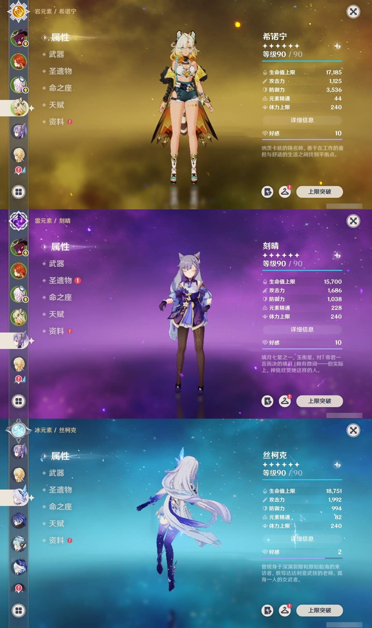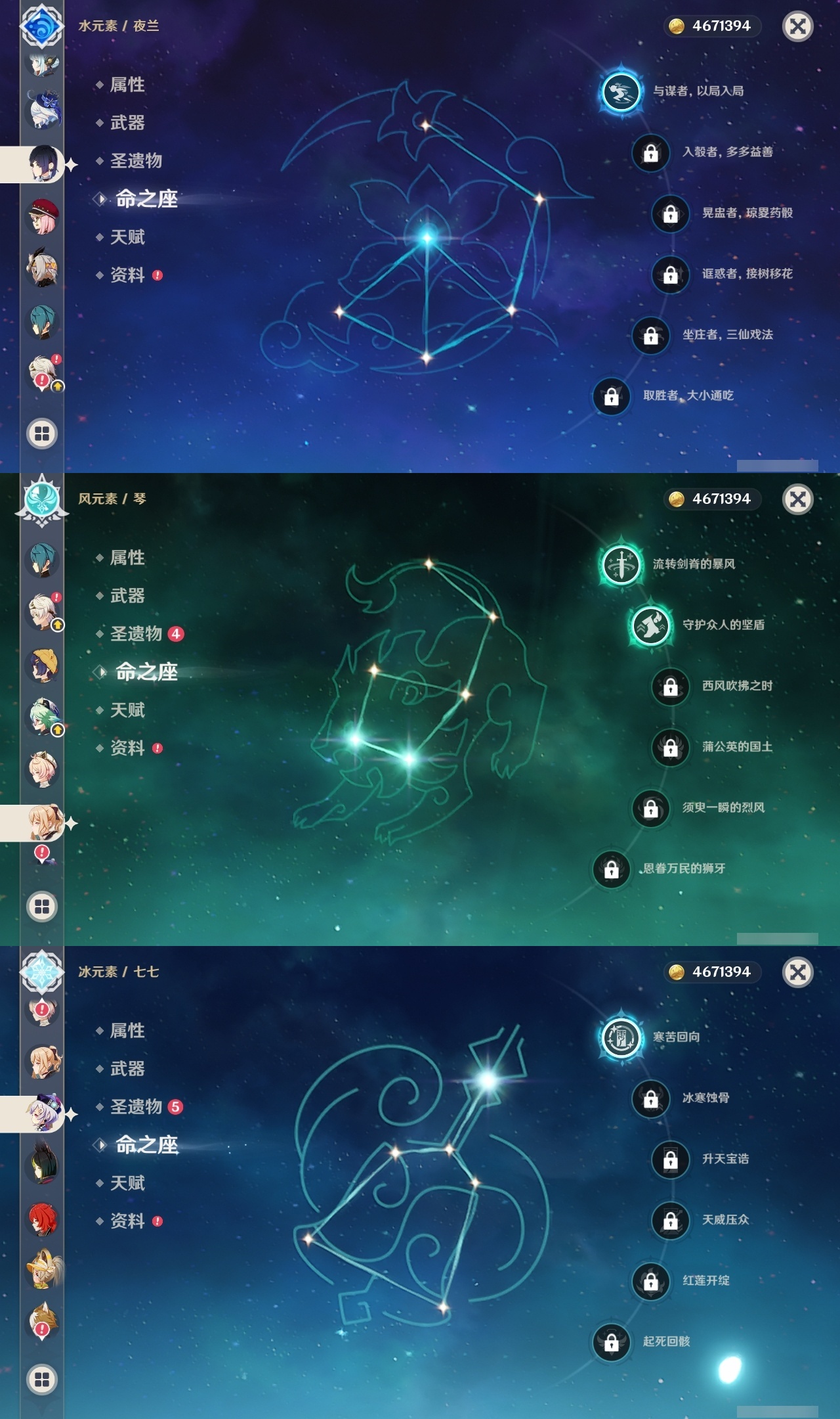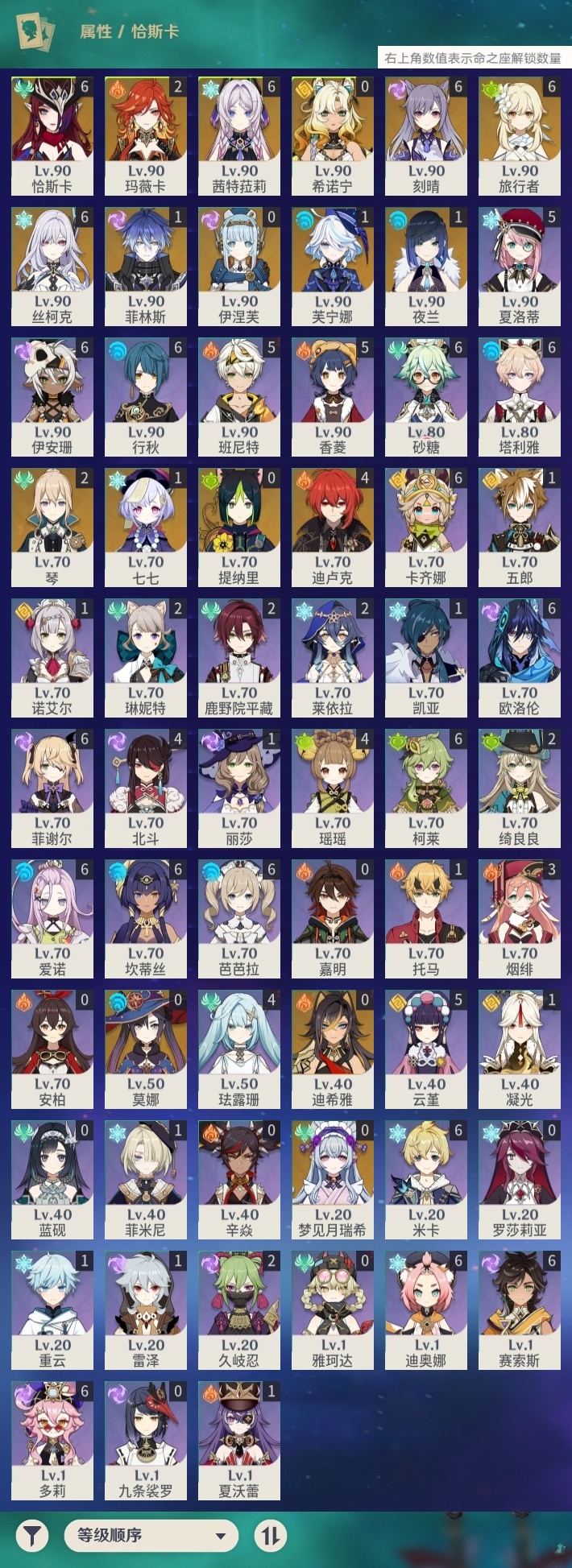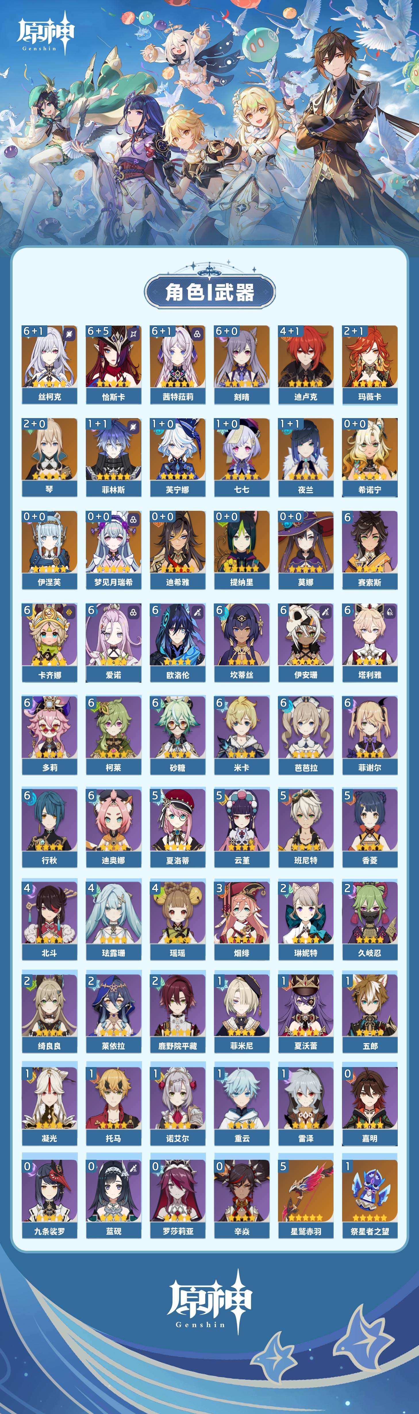 【原神】满命,冒险等级:60,五星数量:29,五星角色:恰斯卡 6命茜特菈莉 6命丝柯克 6命刻晴 6命迪卢克 4命玛薇卡 2命琴 2命芙宁娜 1命菲林斯 1命七七 1命夜兰 1命莫娜希诺宁迪希雅梦见月瑞希提纳里伊涅芙__五星武器:星鹫赤羽 5精祭星者之望焚曜千阳最初的大魔术苍耀血染荒城阿莫斯之弓狼的末路天空之翼终末嗟叹之诗息灾若水__四星角色:卡齐娜 6命行秋 6命迪奥娜 6命砂糖 6命米卡 6命坎蒂丝 6命多莉 6命柯莱 6命芭芭拉 6命欧洛伦 6命菲谢尔 6命伊安珊 6命塔利雅 6命爱诺 6命赛索斯 6命班尼特 5命香菱 5命云堇 5命夏洛蒂 5命珐露珊 4命瑶瑶 4命北斗 4命烟绯 3命久岐忍 2命鹿野院平藏 2命绮良良 2命莱依拉 2命琳妮特 2命凝光 1命托马 1命五郎 1命重云 1命诺艾尔 1命雷泽 1命菲米尼 1命夏沃蕾 1命九条裟罗蓝砚辛焱罗莎莉亚嘉明