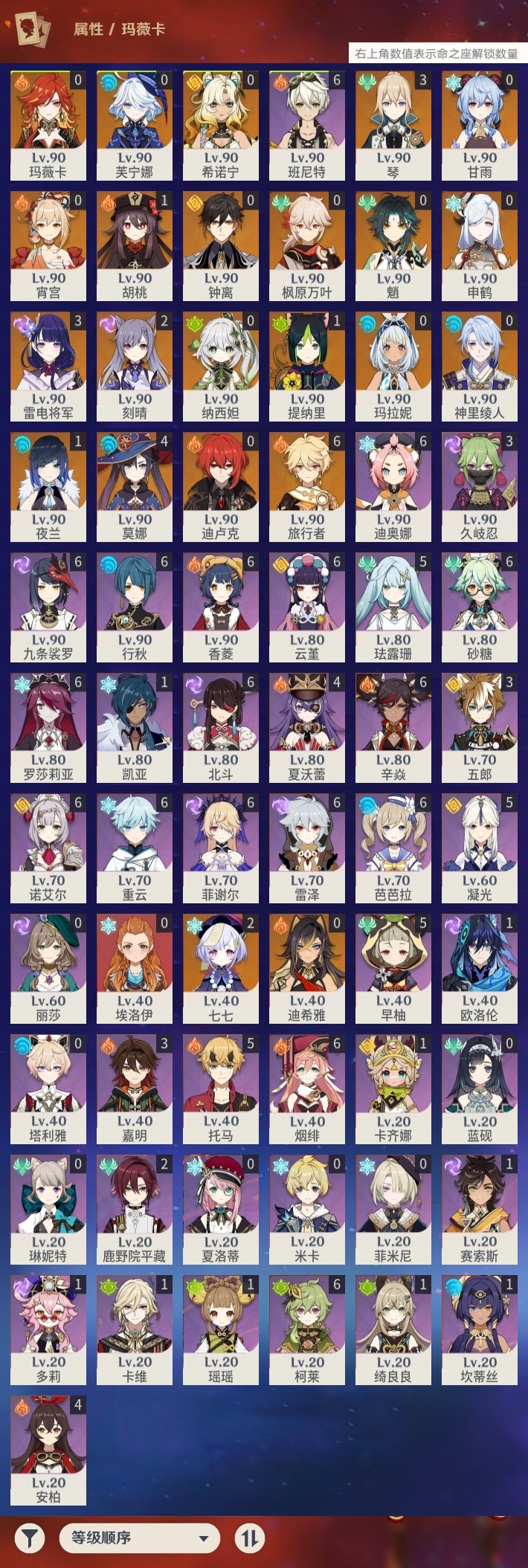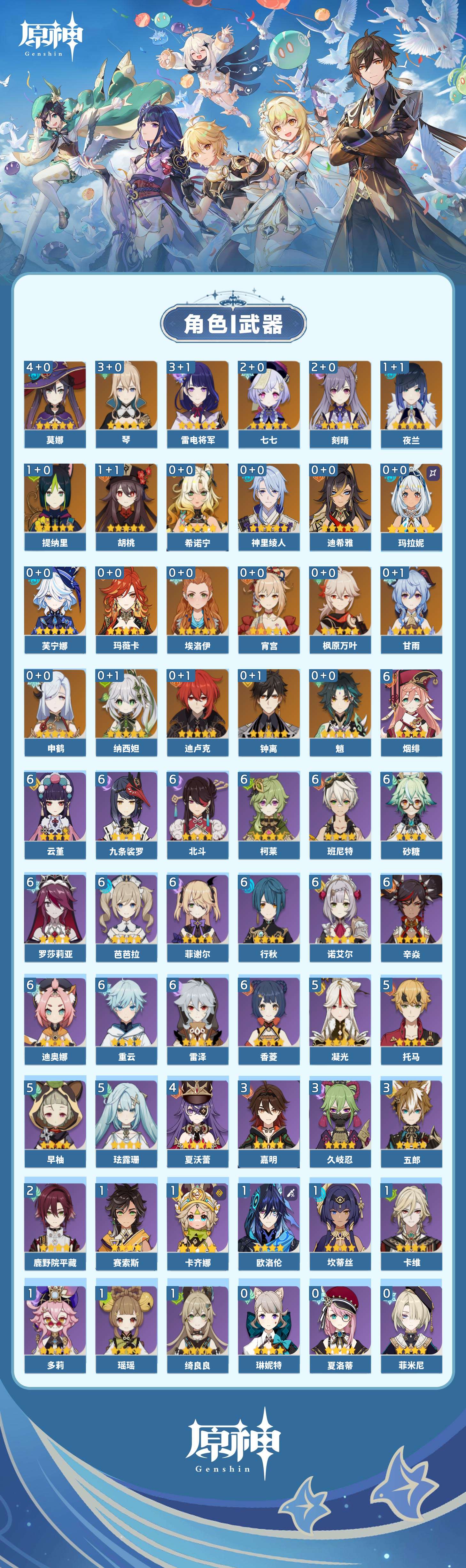 【原神】【lyys8618】冒险等级:60,五星数量:38,五星角色:莫娜 4命雷电将军 3命琴 3命刻晴 2命七七 2命胡桃 1命夜兰 1命提纳里 1命玛拉妮希诺宁玛薇卡宵宫迪希雅钟离申鹤神里绫人芙宁娜纳西妲迪卢克枫原万叶甘雨魈__五星武器:阿莫斯之弓护摩之杖狼的末路四风原典天空之傲天空之脊天空之翼雾切之回光薙草之稻光终末嗟叹之诗斫峰之刃贯虹之槊若水圣显之钥千夜浮梦__四星角色:班尼特 6命行秋 6命九条裟罗 6命香菱 6命迪奥娜 6命砂糖 6命柯莱 6命芭芭拉 6命云堇 6命烟绯 6命重云 6命辛焱 6命诺艾尔 6命罗莎莉亚 6命雷泽 6命菲谢尔 6命北斗 6命珐露珊 5命凝光 5命早柚 5命托马 5命夏沃蕾 4命久岐忍 3命五郎 3命嘉明 3命鹿野院平藏 2命卡齐娜 1命绮良良 1命瑶瑶 1命坎蒂丝 1命多莉 1命卡维 1命欧洛伦 1命赛索斯 1命埃洛伊米卡蓝砚菲米尼琳妮特夏洛蒂塔利雅