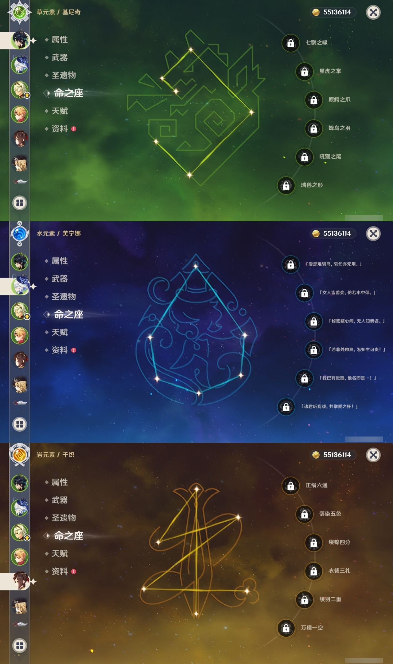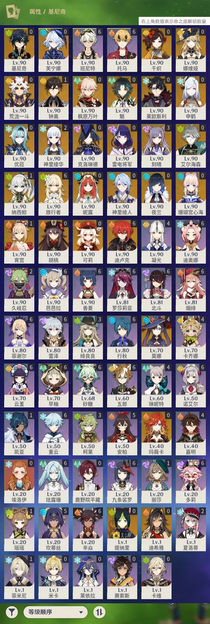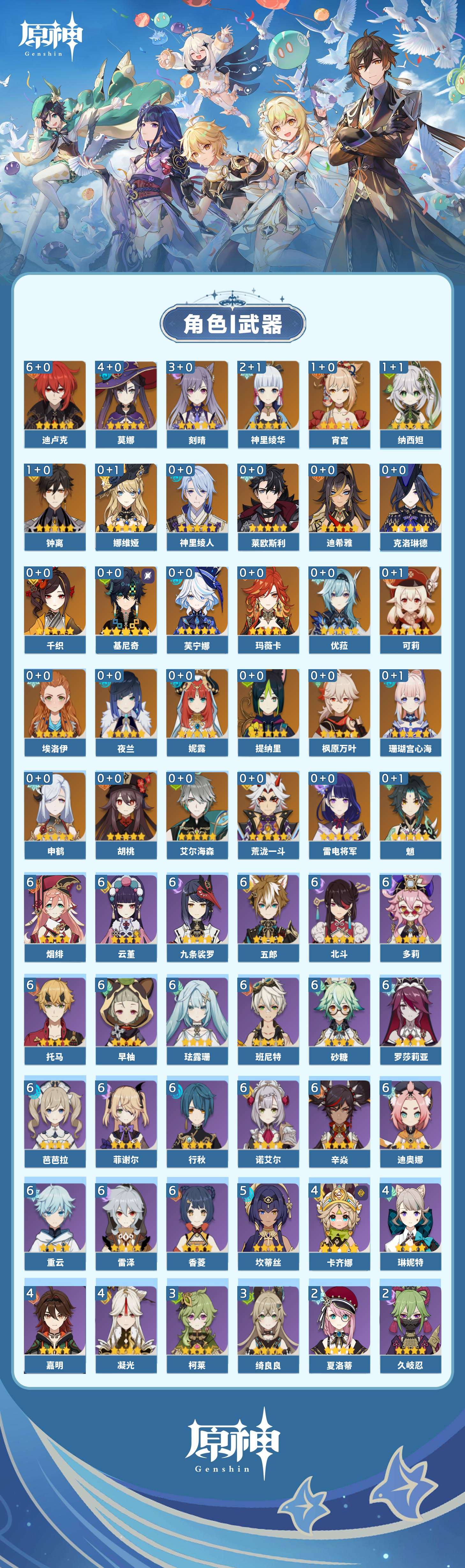 【原神】【lyys8654】冒险等级:60,五星数量:41,五星角色:迪卢克 6命莫娜 4命刻晴 3命神里绫华 2命宵宫 1命钟离 1命纳西妲 1命基尼奇珊瑚宫心海玛薇卡优菈迪希雅荒泷一斗申鹤神里绫人莱欧斯利夜兰芙宁娜娜维娅提纳里千织妮露艾尔海森枫原万叶魈胡桃克洛琳德可莉雷电将军__五星武器:裁断不灭月华和璞鸢四风原典天空之傲天空之脊天空之刃雾切之回光终末嗟叹之诗冬极白星千夜浮梦__四星角色:班尼特 6命行秋 6命九条裟罗 6命香菱 6命珐露珊 6命迪奥娜 6命砂糖 6命多莉 6命芭芭拉 6命云堇 6命早柚 6命托马 6命五郎 6命烟绯 6命重云 6命辛焱 6命诺艾尔 6命罗莎莉亚 6命雷泽 6命菲谢尔 6命北斗 6命坎蒂丝 5命卡齐娜 4命凝光 4命琳妮特 4命嘉明 4命绮良良 3命柯莱 3命久岐忍 2命夏洛蒂 2命瑶瑶 1命菲米尼 1命埃洛伊鹿野院平藏莱依拉米卡卡维赛索斯