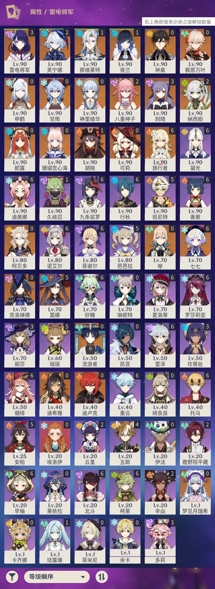 【原神】【lyys8629】冒险等级:60,五星数量:40,五星角色:七七 6命莫娜 5命刻晴 3命雷电将军 3命芙宁娜 2命八重神子 2命纳西妲 2命那维莱特 1命胡桃 1命夜兰 1命琴珊瑚宫心海神里绫华迪希雅钟离梦见月瑞希申鹤阿贝多妮露流浪者迪卢克枫原万叶甘雨克洛琳德可莉__五星武器:阿莫斯之弓 2精护摩之杖 2精圣显之钥 2精万世流涌大典和璞鸢狼的末路四风原典天空之翼雾切之回光薙草之稻光神乐之真意若水千夜浮梦赦罪__四星角色:行秋 6命九条裟罗 6命香菱 6命凝光 6命迪奥娜 6命砂糖 6命柯莱 6命早柚 6命托马 6命烟绯 6命重云 6命诺艾尔 6命罗莎莉亚 6命雷泽 6命菲谢尔 6命北斗 6命夏洛蒂 6命班尼特 5命瑶瑶 5命芭芭拉 5命五郎 4命坎蒂丝 3命多莉 3命鹿野院平藏 2命云堇 2命辛焱 2命久岐忍 1命珐露珊 1命埃洛伊卡齐娜绮良良莱依拉米卡菲米尼琳妮特伊法