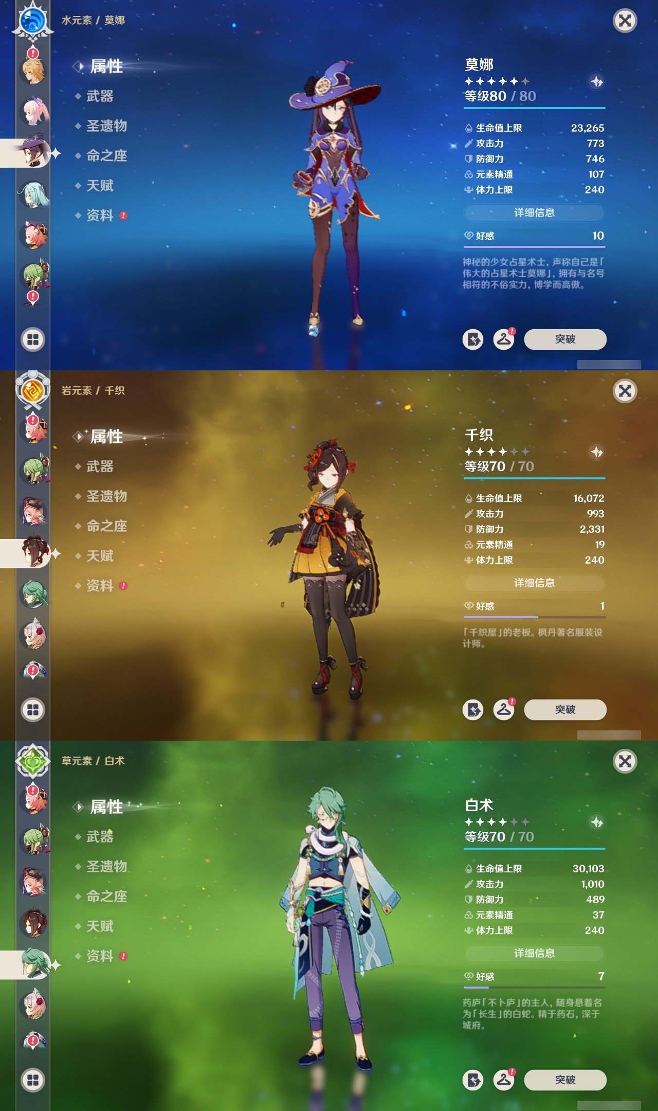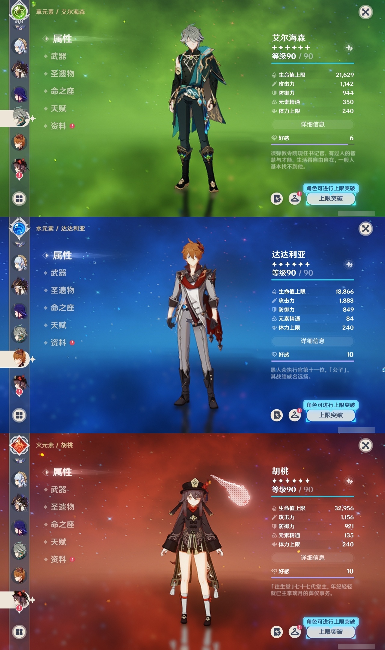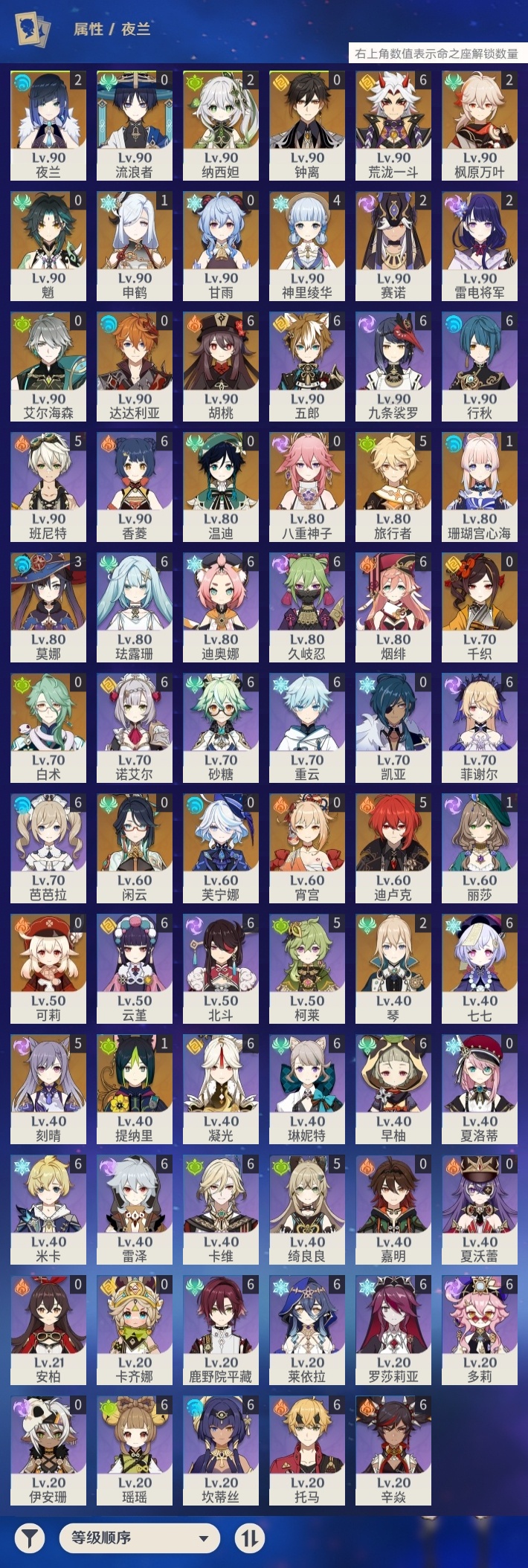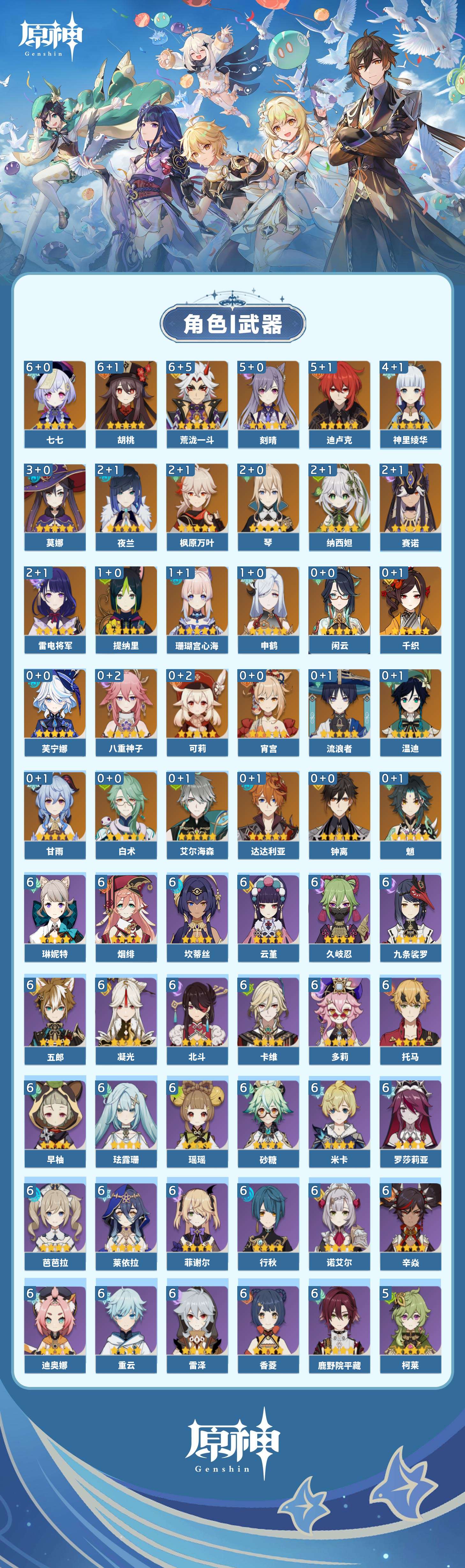 【原神】满命,冒险等级:60,五星数量:54,五星角色:胡桃 6命七七 6命荒泷一斗 6命迪卢克 5命刻晴 5命神里绫华 4命莫娜 3命枫原万叶 2命雷电将军 2命琴 2命夜兰 2命赛诺 2命纳西妲 2命珊瑚宫心海 1命申鹤 1命提纳里 1命白术温迪宵宫钟离达达利亚八重神子芙宁娜闲云千织艾尔海森流浪者甘雨魈可莉__五星武器:赤角石溃杵 5精四风原典 2精神乐之真意 2精有乐御簾切裁叶萃光图莱杜拉的回忆阿莫斯之弓不灭月华苍古自由之誓风鹰剑和璞鸢护摩之杖狼的末路天空之脊天空之刃天空之翼雾切之回光薙草之稻光终末嗟叹之诗冬极白星波乱月白经津若水赤沙之杖千夜浮梦__四星角色:行秋 6命九条裟罗 6命香菱 6命久岐忍 6命鹿野院平藏 6命珐露珊 6命凝光 6命迪奥娜 6命砂糖 6命瑶瑶 6命莱依拉 6命米卡 6命坎蒂丝 6命多莉 6命卡维 6命芭芭拉 6命云堇 6命早柚 6命托马 6命五郎 6命烟绯 6命重云 6命辛焱 6命诺艾尔 6命罗莎莉亚 6命雷泽 6命菲谢尔 6命北斗 6命琳妮特 6命班尼特 5命绮良良 5命柯莱 5命卡齐娜夏洛蒂夏沃蕾嘉明伊安珊